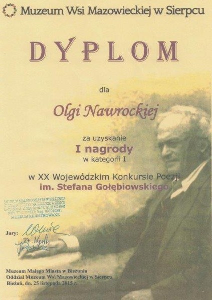 W zabytkowym budynku Muzeum Małego Miasta w Bieżuniu (oddział Muzeum Wsi Mazowieckiej w Sierpcu) w dniu 25 listopada 2015 roku odbyło się uroczyste rozstrzygnięcie jubileuszowej XX edycji Wojewódzkiego Konkursu Poezji im. Stefana Gołębiowskiego. Konkurs nosi imię pochodzącego właśnie z Bieżunia wybitnego poety i tłumacza dzieł Horacego. Honorowy patronat nad tym artystycznym przedsięwzięciem objęli Mazowiecki Kurator Oświaty i Marszałek Województwa Mazowieckiego. W tegorocznej edycji wzięło udział 125 uczestników w dwóch kategoriach wiekowych. Zdobywczynią I miejsca w kategorii młodzieży młodszej została Olga Nawrocka, uczennica klasy VI b. Rozstrzygnięcie konkursu odbyło się w uroczystej atmosferze. Członkowie koła teatralnego zaprezentowali utwory laureatów, wręczono nagrody, wysłuchano koncertu muzycznego, a całe spotkanie zakończono okolicznościowym poczęstunkiem.