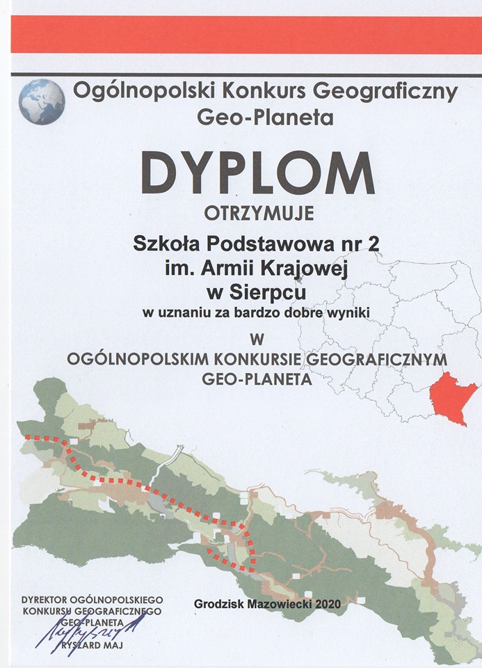 Uczniowie naszej szkoły przystąpili do Ogólnopolskiego Konkursu Geograficznego „GEO – PLANETA”. Udział wzięło 24 uczniów z klas V- VIII. Podczas pisania testu wykazali się wiedzą geograficzną naszego kraju, znajomością skali i mapy. Laureatem II miejsca w kraju został IGOR KRULCZYK z klasy VIII d.