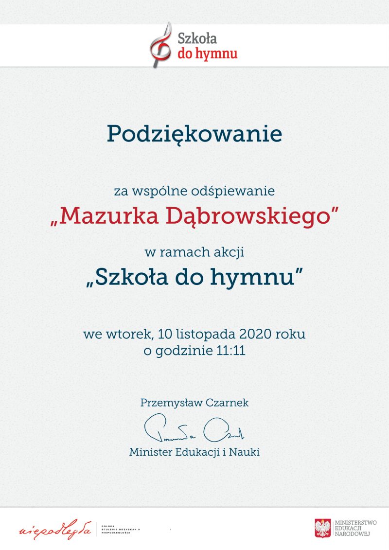 w imieniu Ministra Edukacji i Nauki Przemysława Czarnka serdecznie dziękuję za udział w akcji „Szkoła do hymnu”. Cieszę się, że tak wielu uczniów i nauczycieli uczciło w ten sposób Narodowe Święto Niepodległości. W tegorocznej akcji wzięło udział 16 269 szkół, przedszkoli i placówek oświatowych z całego kraju. Dziękujemy za zgłoszenie ! W załączeniu przekazujemy pamiątkowy dyplom.