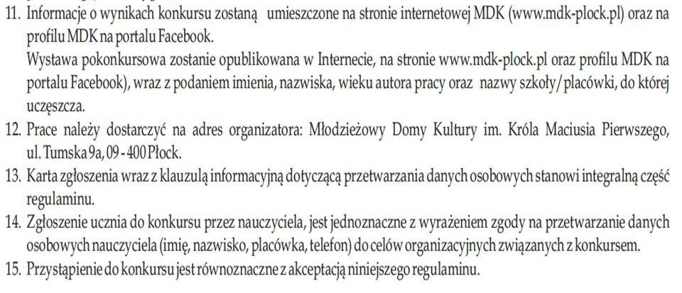 Prace należy dostarczyć na adres organizatora: Młodzieżowy Domy Kultury im. Króla Maciusia Pierwszego, ul. Tumska 9a, 09 – 400 Płock.