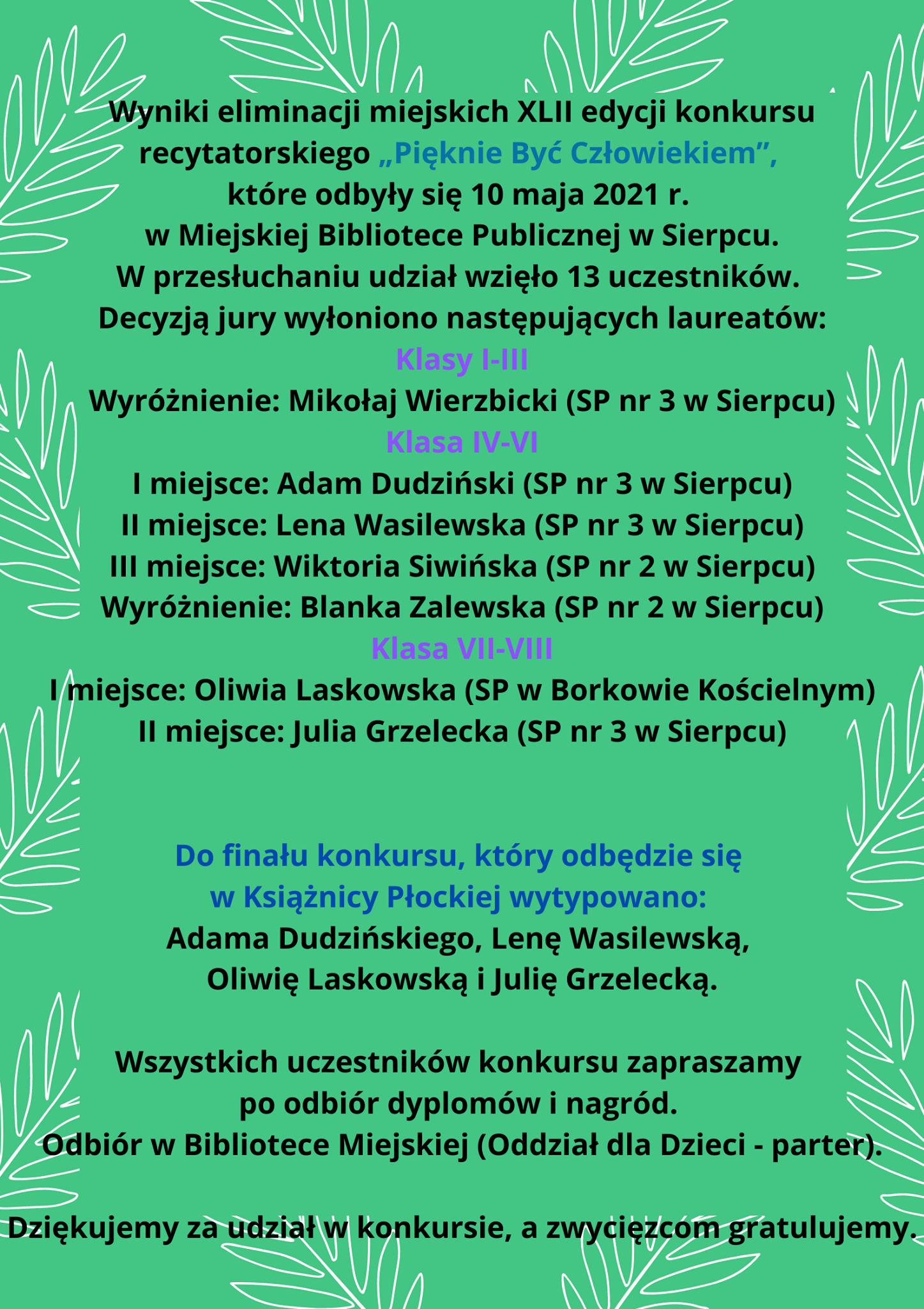 10 maja 2021 roku uczennice naszej szkoły Maja Dąbrowska 4 B, Blanka Zalewska 4B (opiekun p. Jolanta Fronczak-Cyl) Wiktoria Siwińska 6D (opiekun p. Renata Gębska) wzięły udział w miejskich eliminacjach XLII edycji konkursu recytatorskiego ,, Pięknie być człowiekiem”.