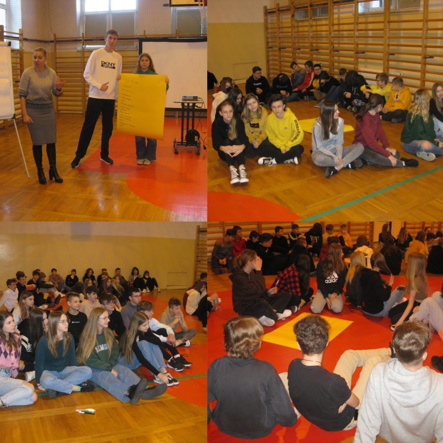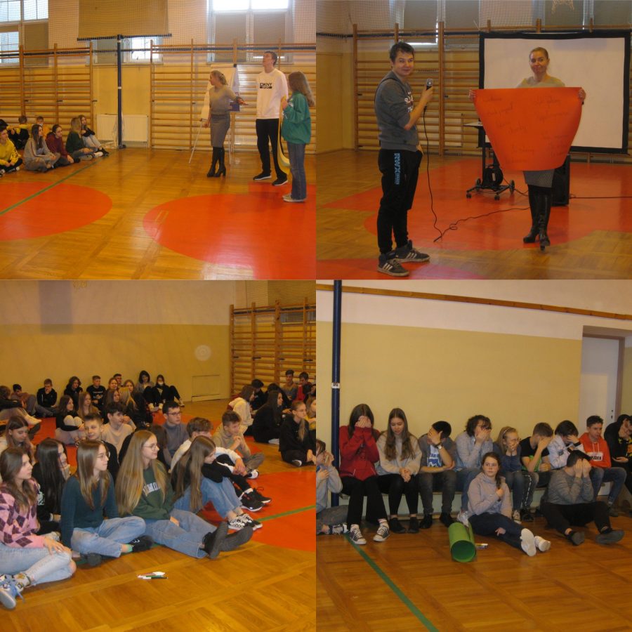 1 marca 2022 roku odbyło się spotkanie dla wszystkich uczniów klas ósmych z psychologiem p. Jolantą Ludwiczak z Poradni Psychologiczno-Pedagogicznej w Sierpcu. Podczas zajęć poruszony był temat zdrowia psychicznego, objawów depresji, przyczyn występowania problemów psychicznych oraz sposobów radzenia sobie, gdy odczuwamy obniżony nastrój. Zajęcia miały charakter wykładowo – warsztatowy, uczniowie brali udział w ćwiczeniach grupowych i omawiali swoje prace. Psycholog podkreślał w jaki sposób nasze zachowanie m.in. wyzywanie, hejt, odrzucanie może wpływać na samopoczucie innych.