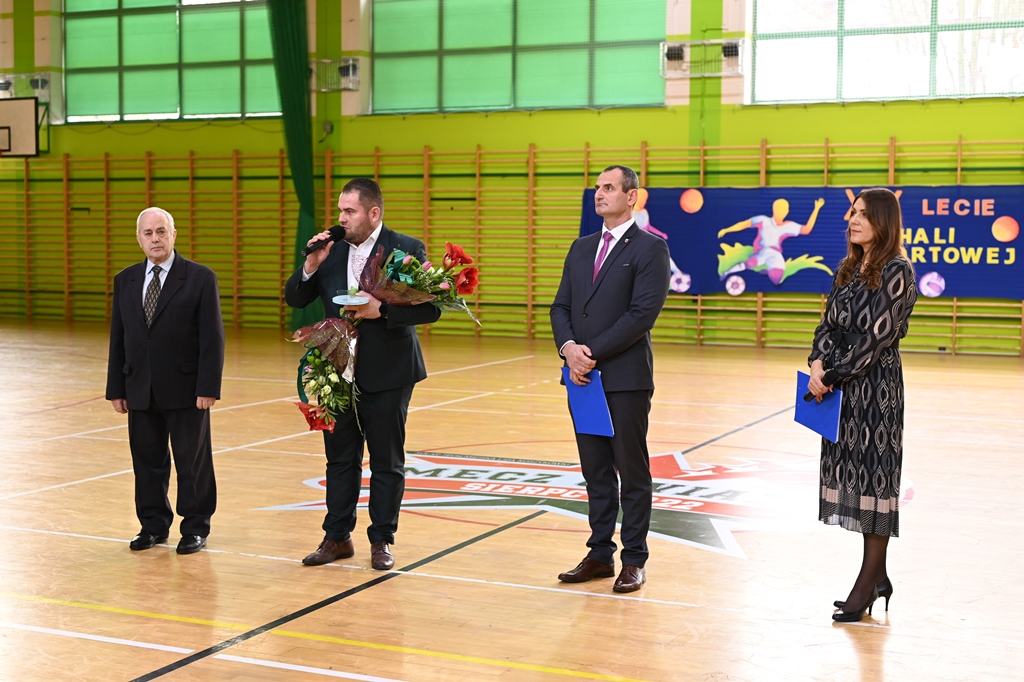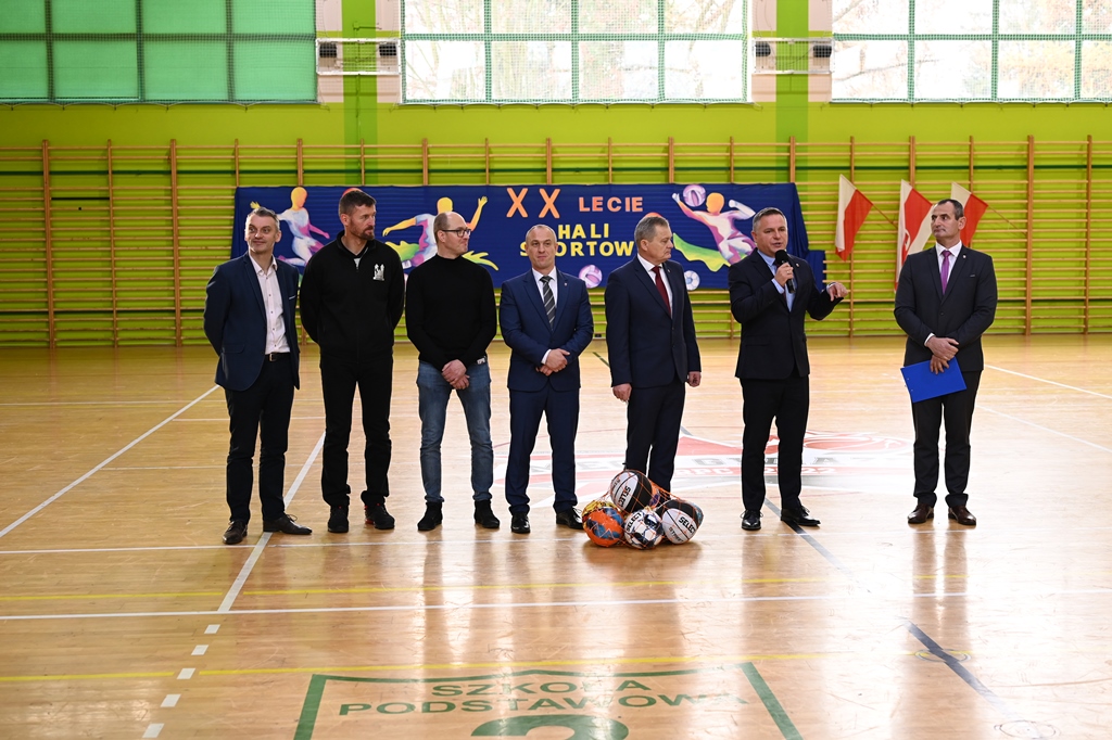 Dariusz Malanowski (koordynator d/s sportu) do wyświetlonej prezentacji multimedialnej przedstawił zestawienie tego, co się działo na hali przez 20 lat. Opowiedział o patronie hali, przybliżył sukcesy sportowe, podziękował za trafną inwestycję oraz za dofinansowywanie obiektu.