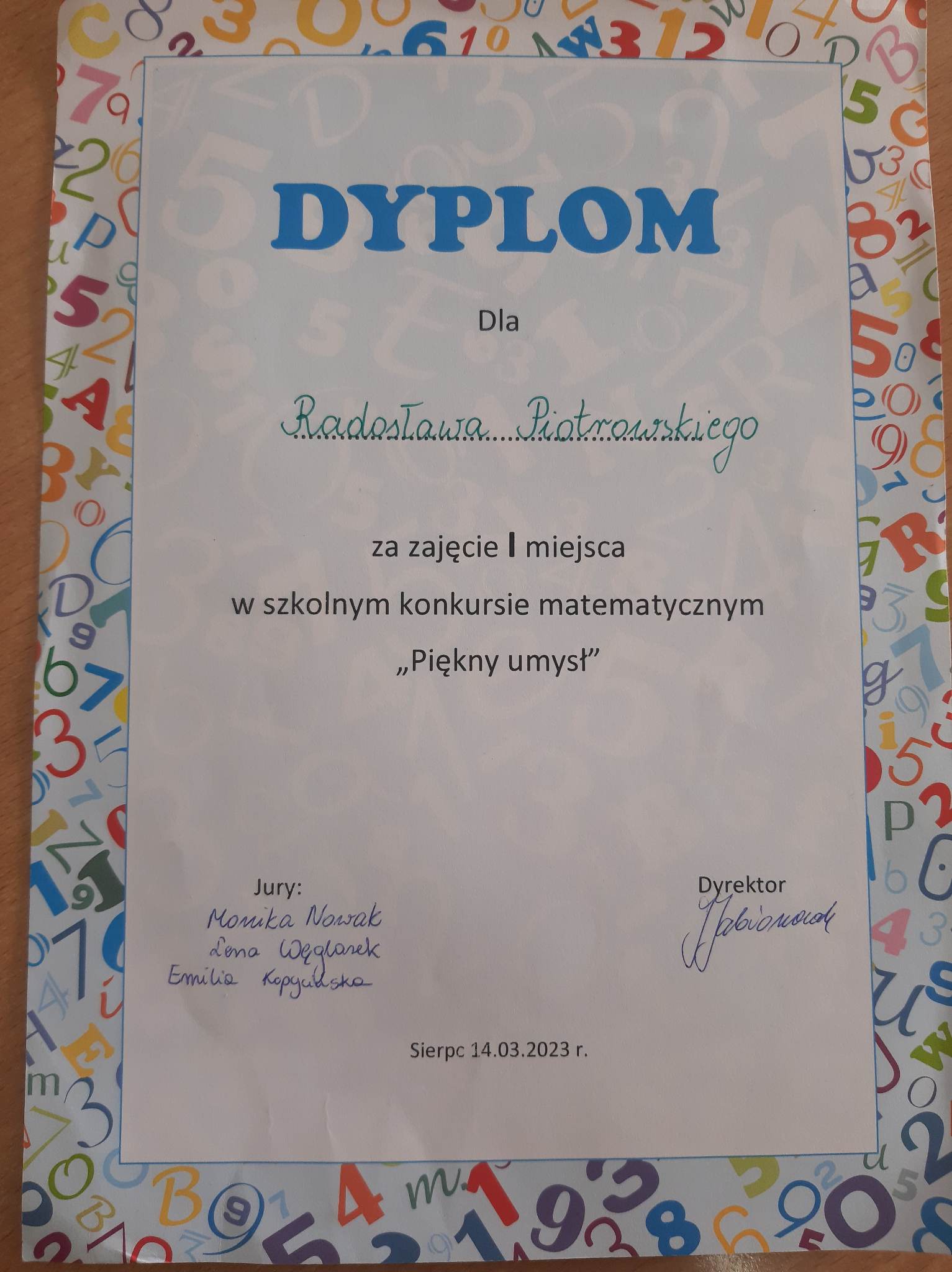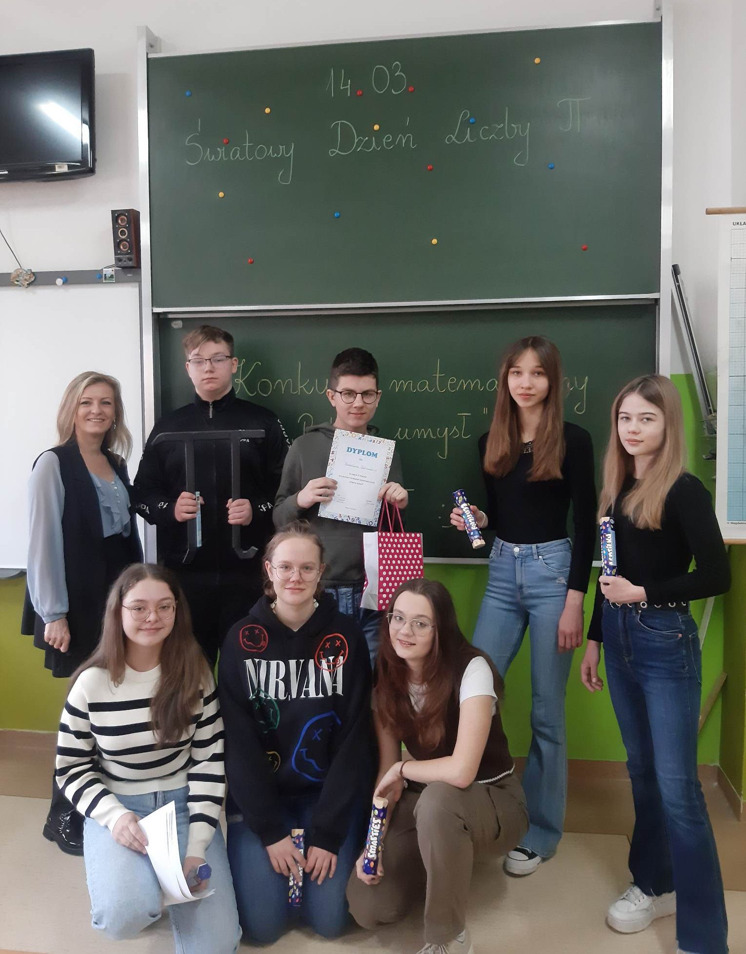 14 marca 2023 r. nasi uczniowie podjęli próbę ustanowienia nowego rekordu znajomości rozwinięcia dziesiętnego liczby Pi. Z przyjemnością ogłaszamy, że uczeń klasy 8c Radosław Piotrowski zapamiętał 105 cyfr po przecinku i tym samym został zwycięzcą konkursu “Piękny umysł”. Radkowi gratulujemy wspaniałej pamięci, a młodszych uczniów zapraszamy już dziś do bicia rekordu w następnym roku szkolnym