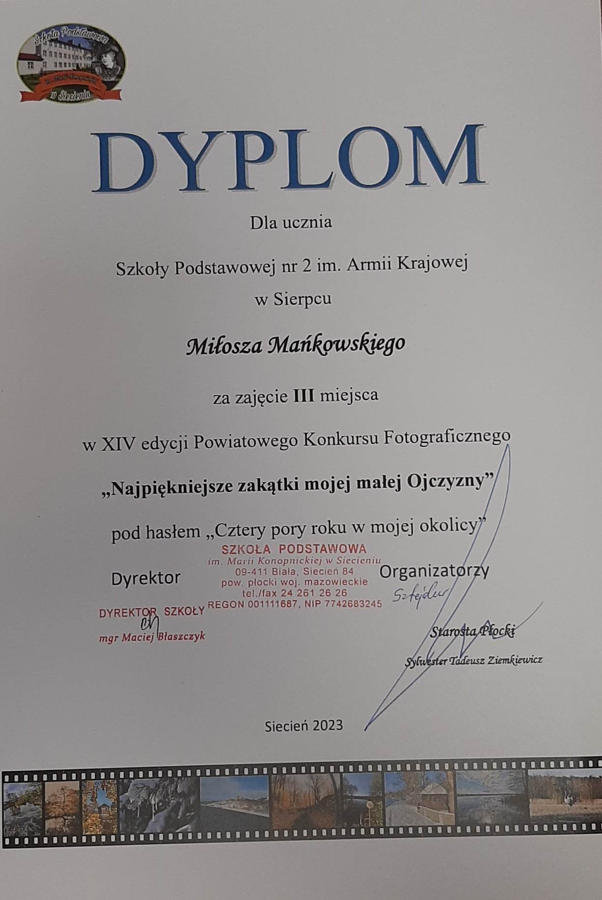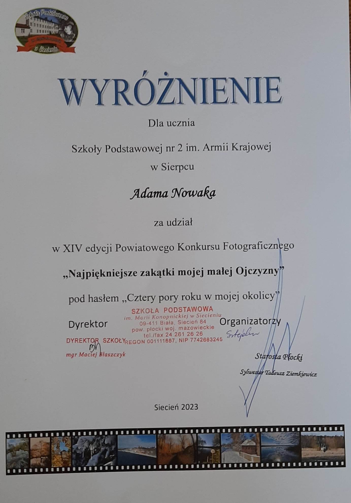 Rozstrzygnięto XIV Powiatowy Konkurs Fotograficzny. „Najpiękniejsze zakątki mojej małej Ojczyzny” zorganizowanym przez Szkołę Podstawową im. Marii Konopnickiej w Siecieniu oraz Starostwo Powiatowe w Płocku.
