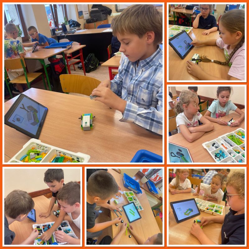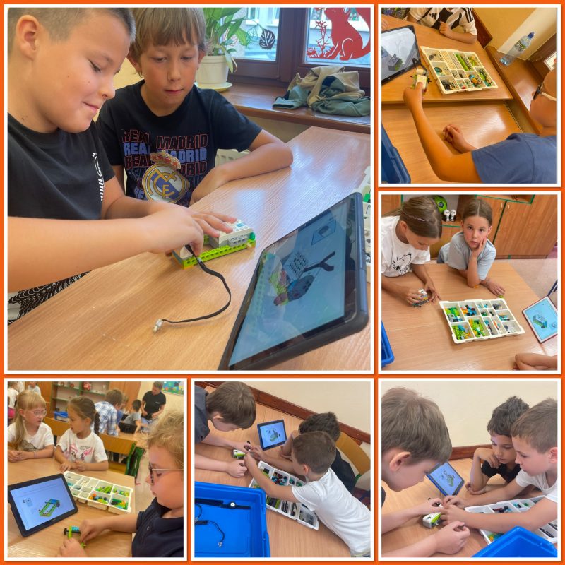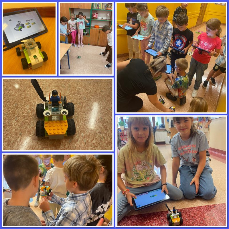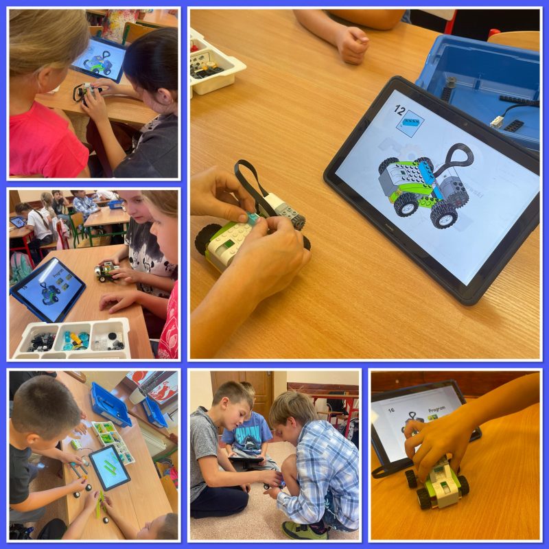 Dzieci budowały w grupach robota (samochód), którego następnie za pomocą tableta programowały.