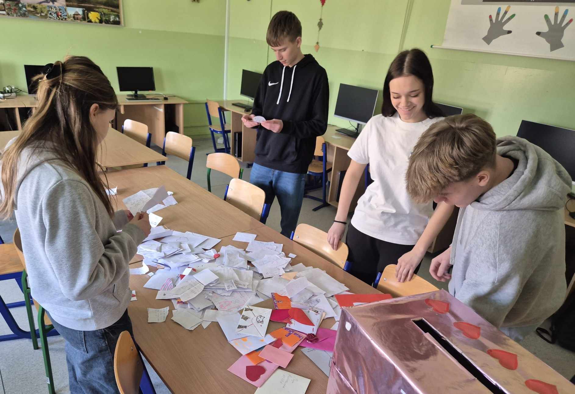 Od samego rana na korytarzach można było zauważyć dekoracje w postaci czerwonych serduszek, girland i balonów, które wprowadziły wszystkich w walentynkowy nastrój. Uczniowie mieli okazję skorzystać z poczty walentynkowej – specjalnej skrzynki, do której można było wrzucać kartki z życzeniami dla koleżanek, kolegów oraz nauczycieli. Listonosze z Samorządu Uczniowskiego rozdali je podczas przerw, sprawiając, że na wielu twarzach pojawiły się uśmiechy. 🥰