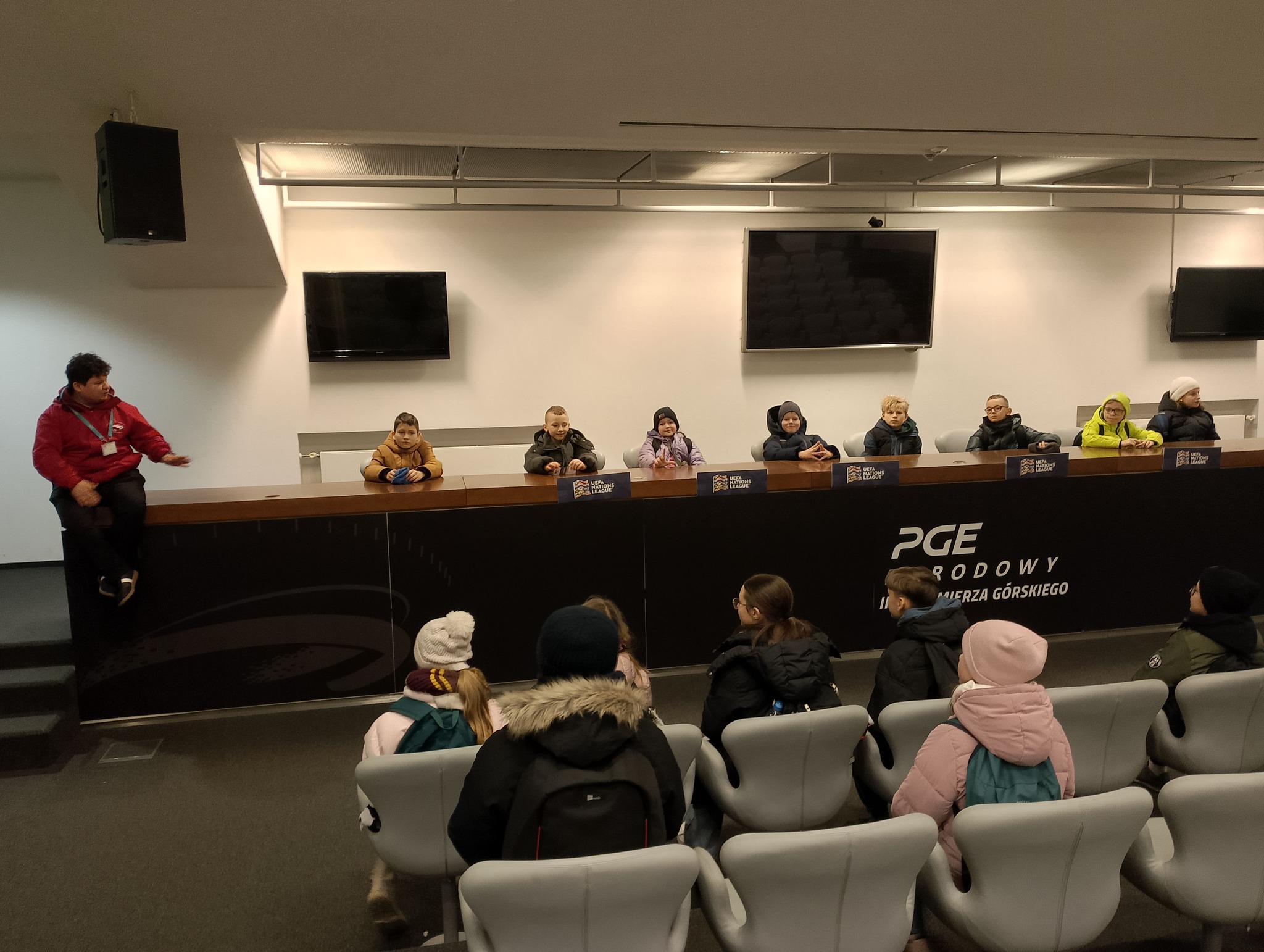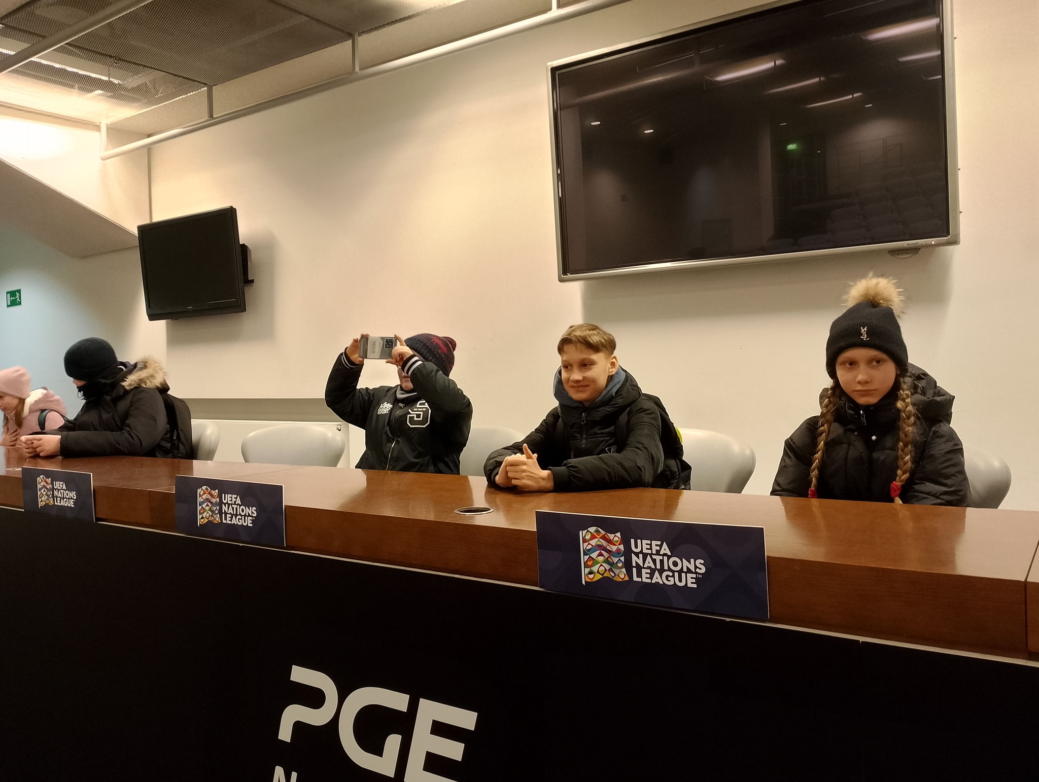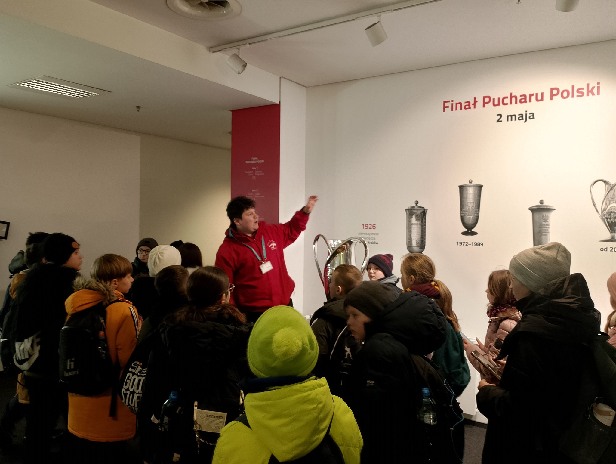 Pierwszym przystankiem była wizyta na największym stadionie w Polsce – PGE Narodowym. Uczniowie mieli okazję poczuć się jak prawdziwi piłkarze, oglądając szatnie zawodników oraz zasiadając na trybunach, gdzie podczas meczów zasiadają tysiące kibiców. Przewodnik opowiedział wiele ciekawostek na temat historii obiektu, wielkich sportowych wydarzeń oraz koncertów, które odbywały się na stadionie.