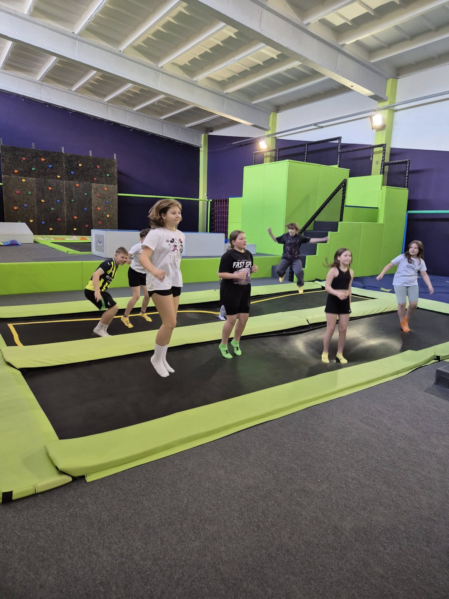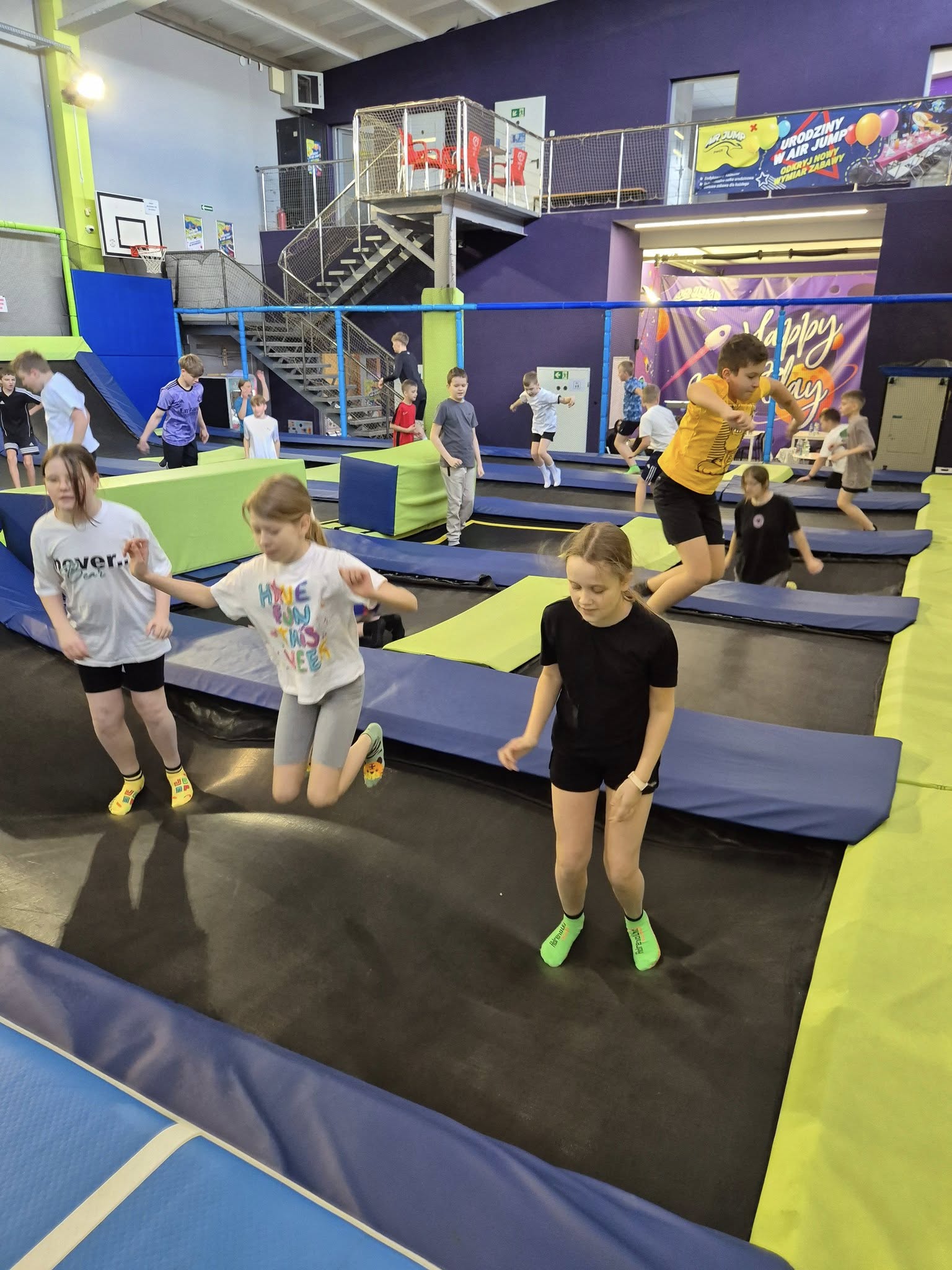 Pierwszym punktem programu była wizyta w parku trampolin w Płocku. Uczniowie z dużym entuzjazmem korzystali z dostępnych atrakcji – skakali na trampolinach, pokonywali tory przeszkód oraz uczestniczyli w różnych grach i zabawach ruchowych. Radość i uśmiech na twarzach towarzyszyły im przez cały czas.