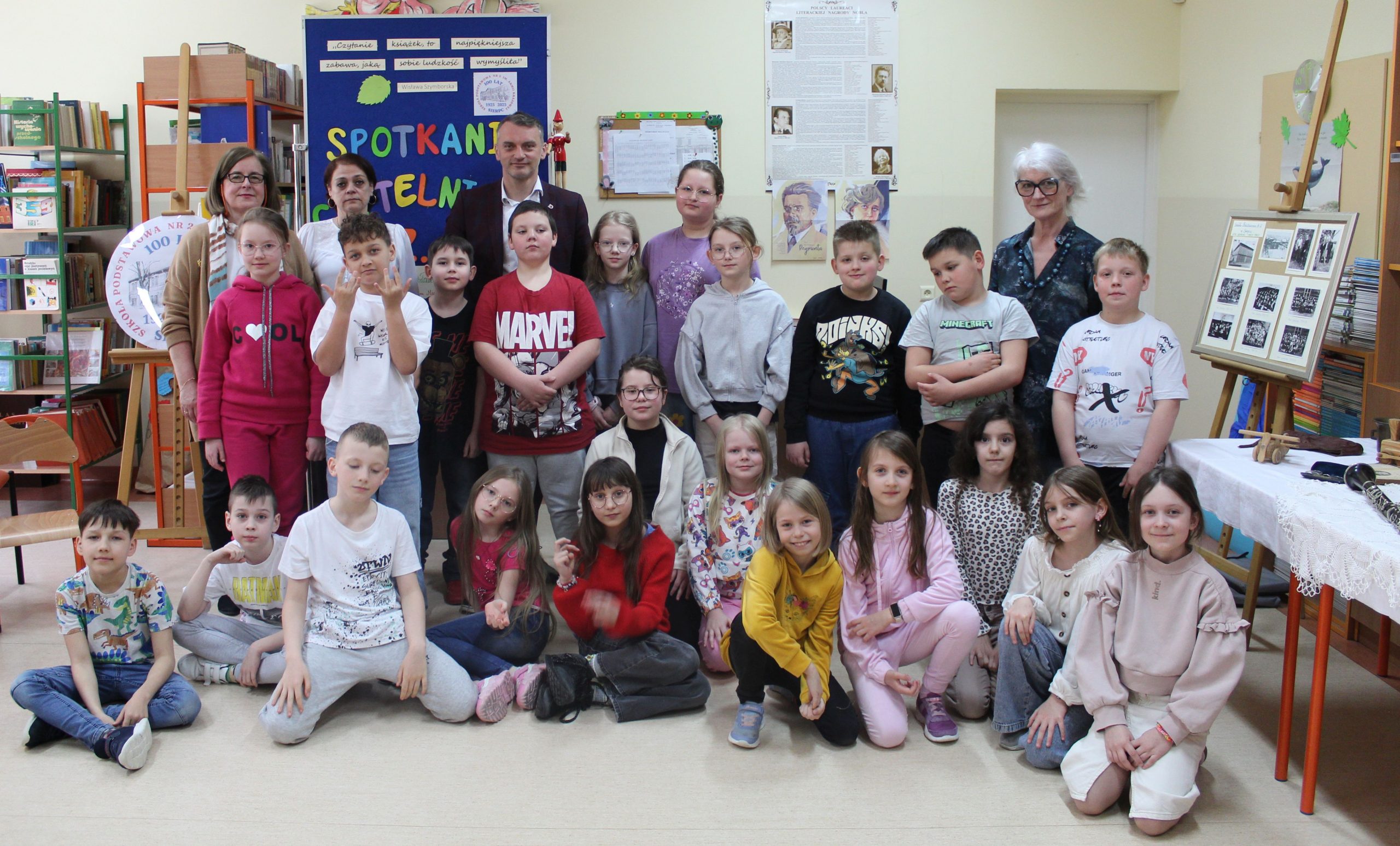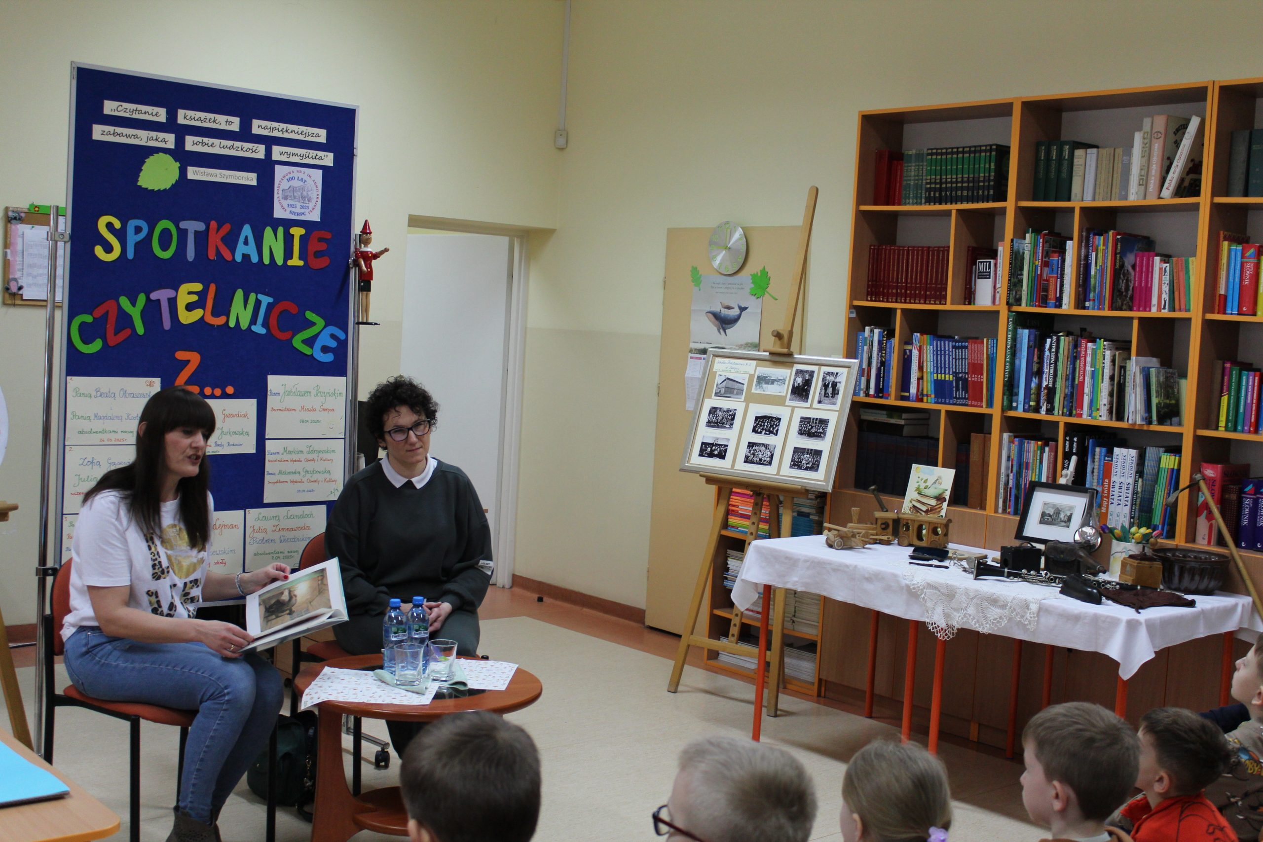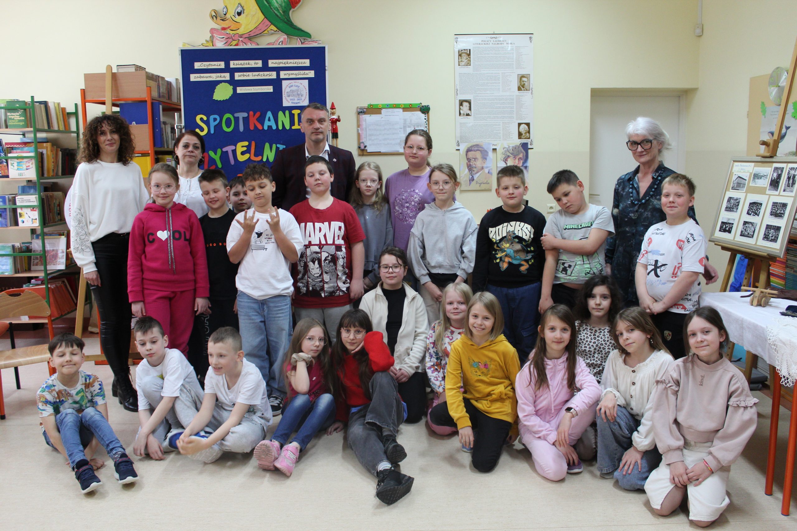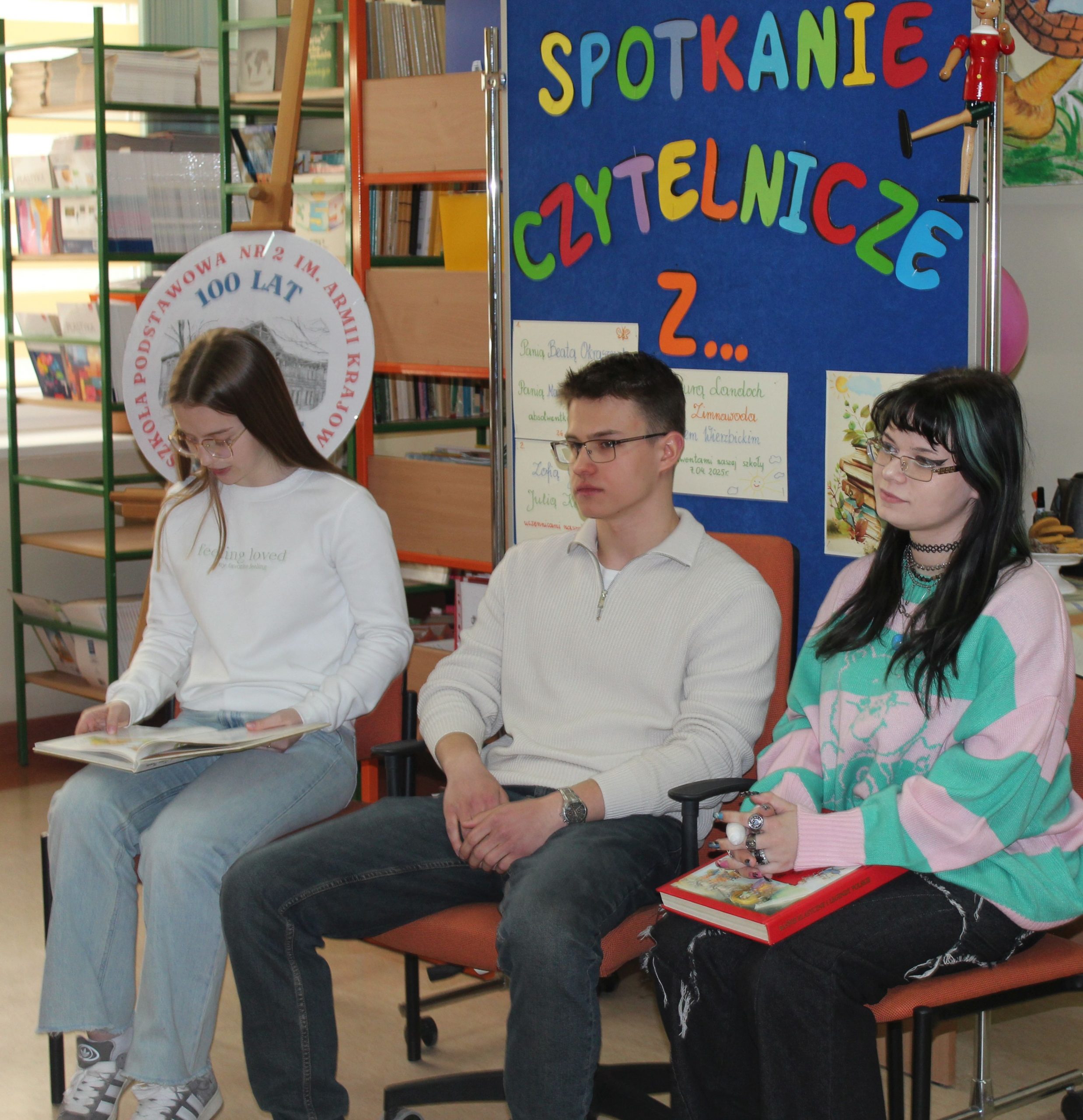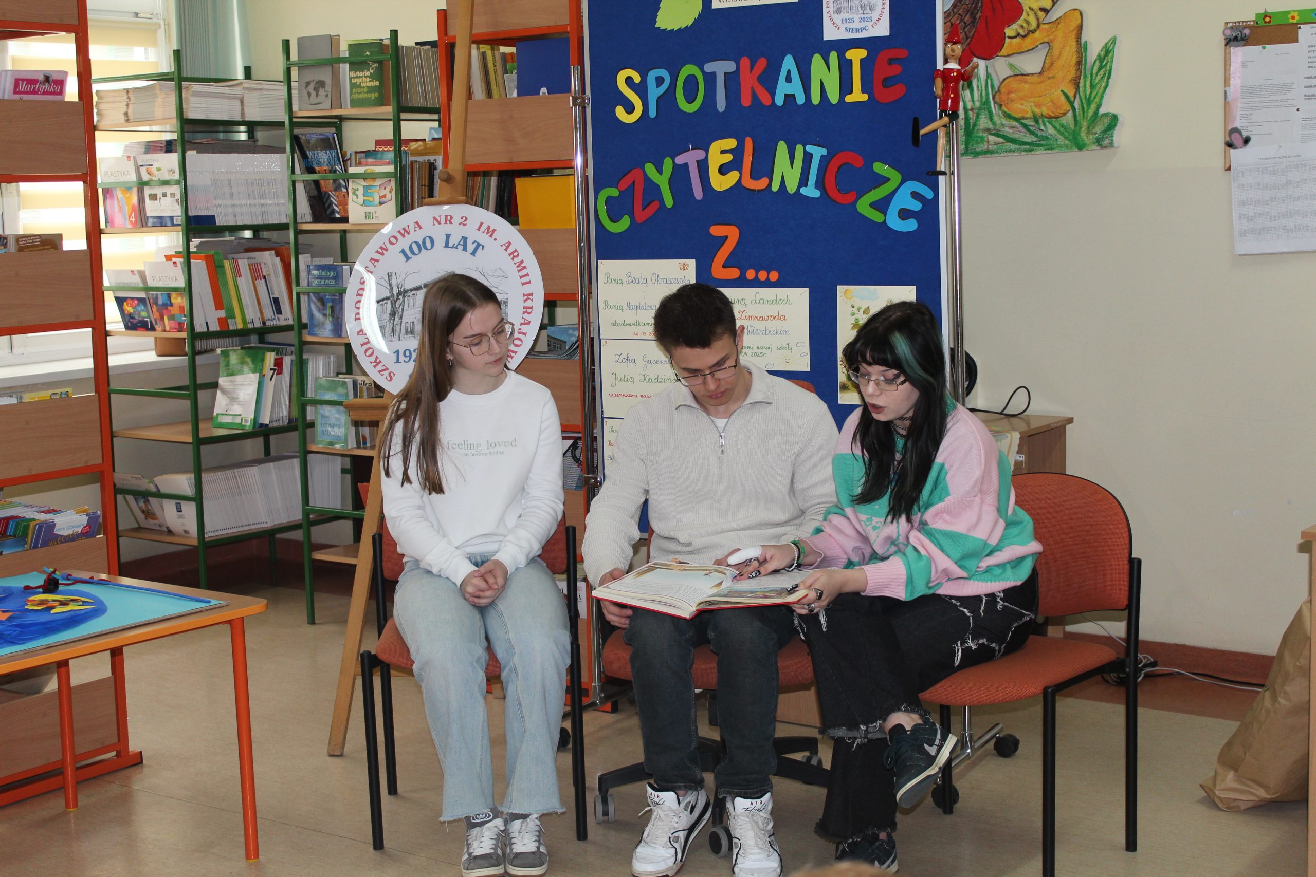 Z okazji Jubileuszu 100- lecia naszej szkoły w bibliotece odbyły się wyjątkowe „Spotkania czytelnicze”, których motywem przewodnim były ulubione książki z dzieciństwa zaproszonych gości. Uczestnicy – wśród nich uczniowie, absolwenci naszej szkoły, przedstawiciele władz miasta, emerytowani nauczyciele, rodzice – czytali uczniom młodszych klas ulubione książki z lat szkolnych, dzielili się wspomnieniami oraz refleksjami związanymi z dawnymi przeżyciami gdy sami byli uczniami. Rozwiązywali wspólnie z dziećmi zagadki literackie. Spotkaniom towarzyszyła ekspozycja starych przedmiotów i fotografii, które przywołały atmosferę minionych lat i wzbudziły wiele emocji. Wydarzenie stworzyło niezwykłą przestrzeń do międzypokoleniowego dialogu i integracji wokół literatury oraz wspólnej historii szkoły.