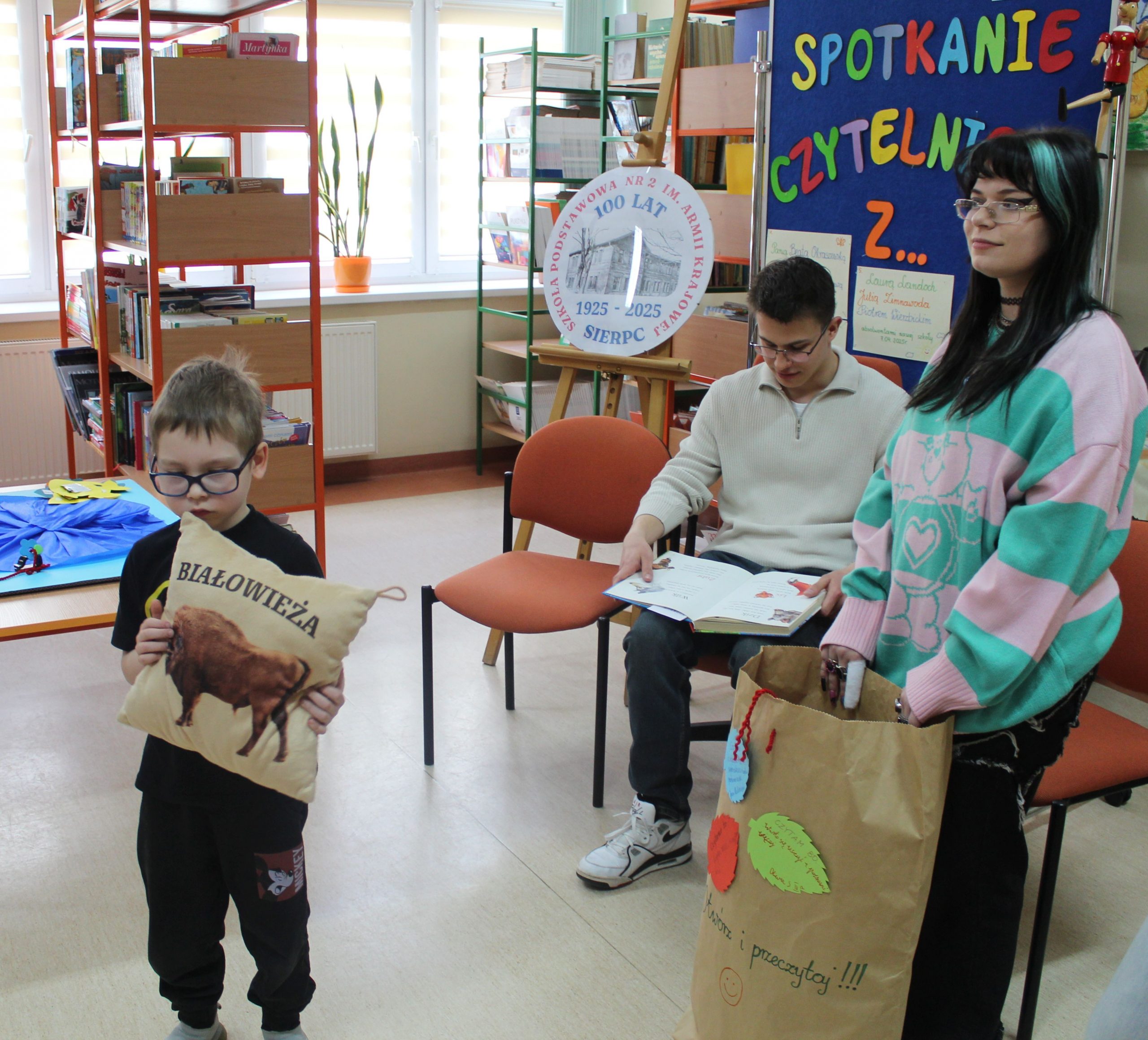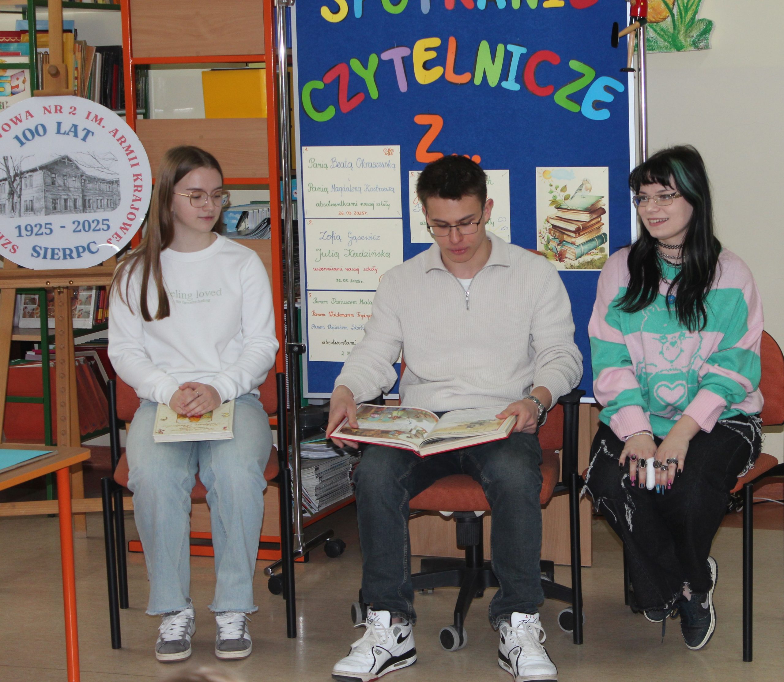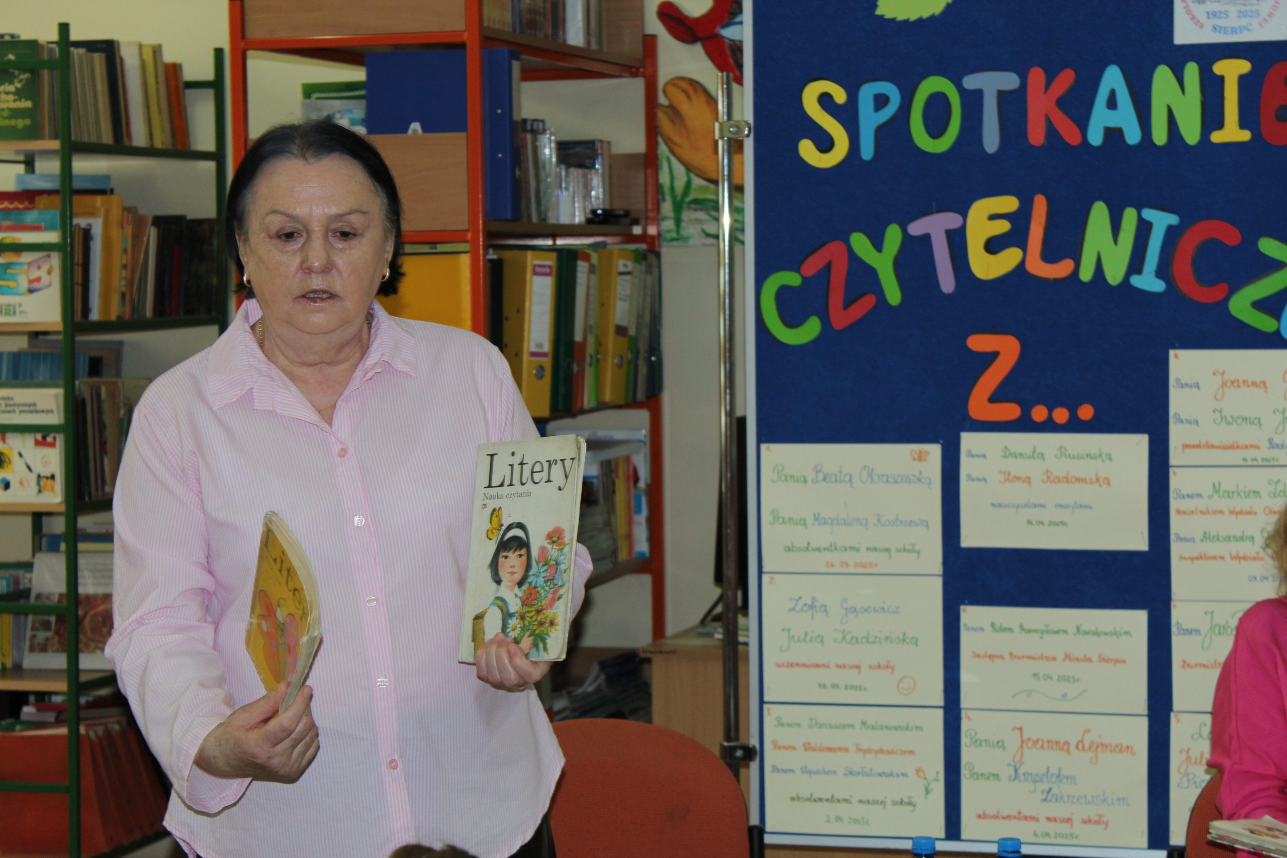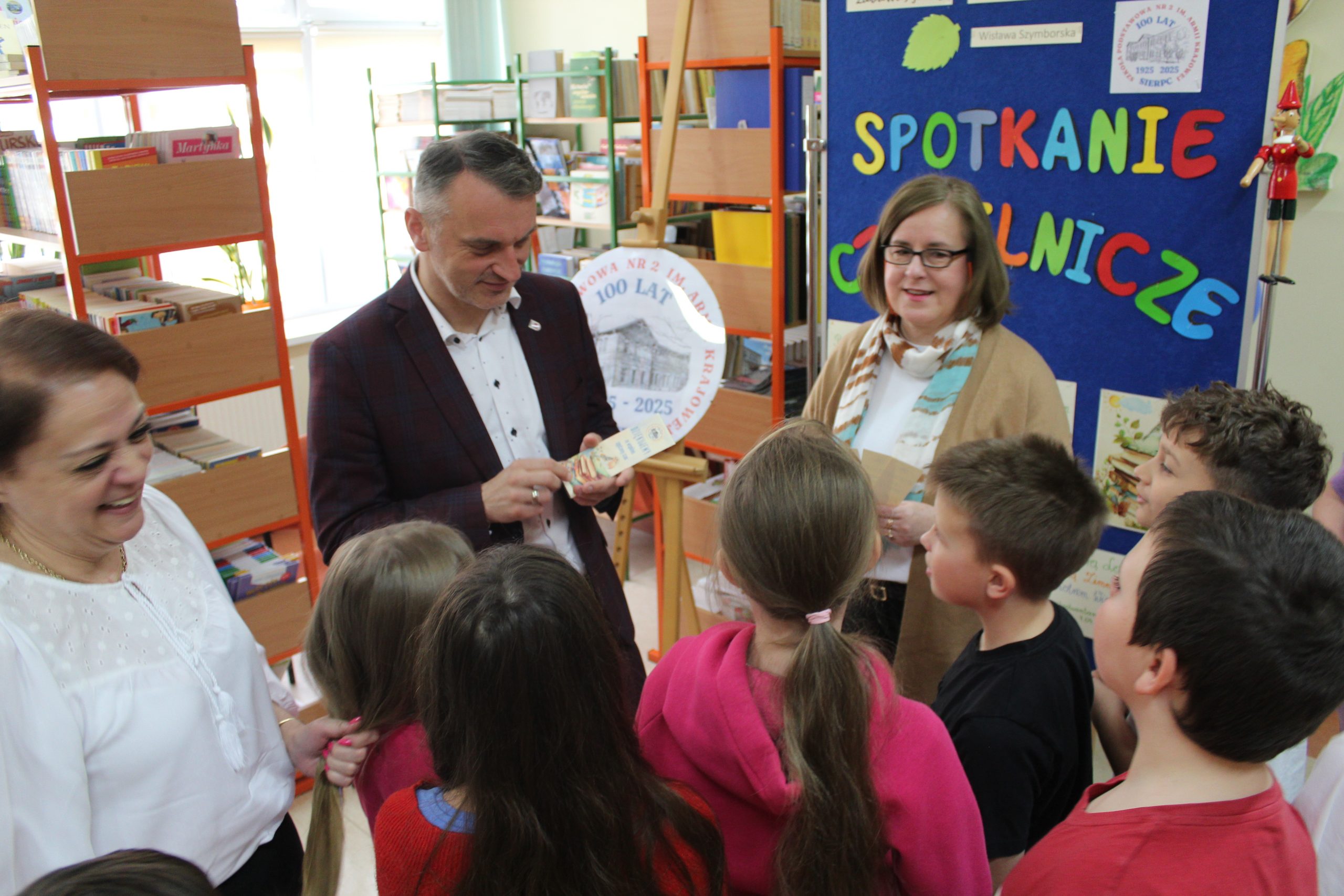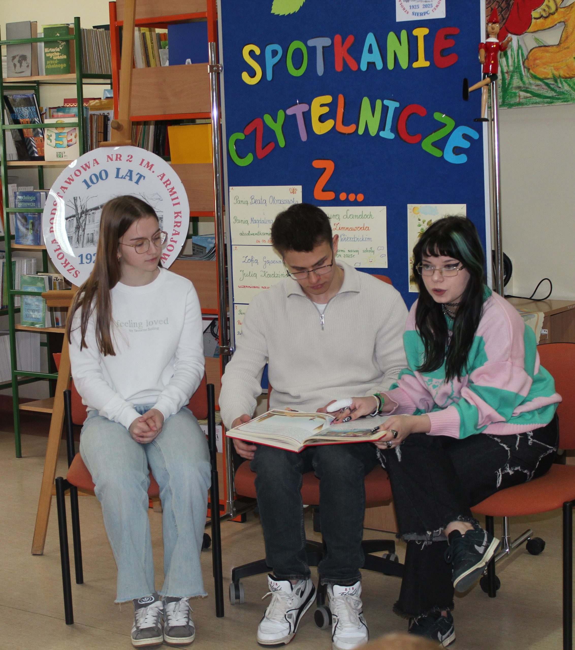 Z okazji Jubileuszu 100- lecia naszej szkoły w bibliotece odbyły się wyjątkowe „Spotkania czytelnicze”, których motywem przewodnim były ulubione książki z dzieciństwa zaproszonych gości. Uczestnicy – wśród nich uczniowie, absolwenci naszej szkoły, przedstawiciele władz miasta, emerytowani nauczyciele, rodzice – czytali uczniom młodszych klas ulubione książki z lat szkolnych, dzielili się wspomnieniami oraz refleksjami związanymi z dawnymi przeżyciami gdy sami byli uczniami. Rozwiązywali wspólnie z dziećmi zagadki literackie. Spotkaniom towarzyszyła ekspozycja starych przedmiotów i fotografii, które przywołały atmosferę minionych lat i wzbudziły wiele emocji. Wydarzenie stworzyło niezwykłą przestrzeń do międzypokoleniowego dialogu i integracji wokół literatury oraz wspólnej historii szkoły.