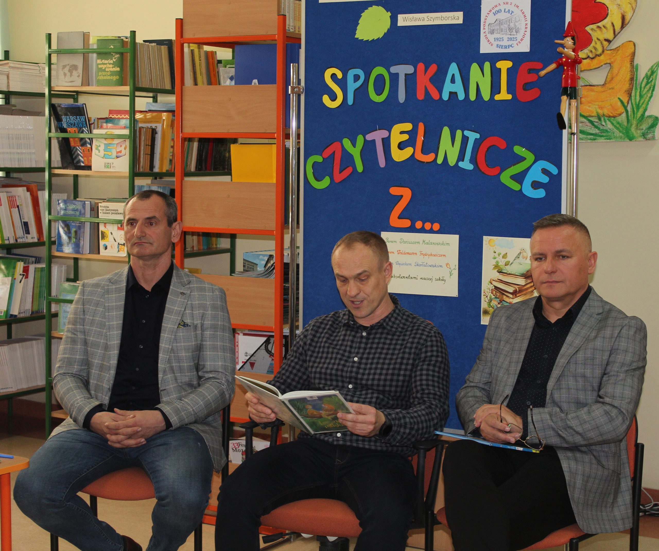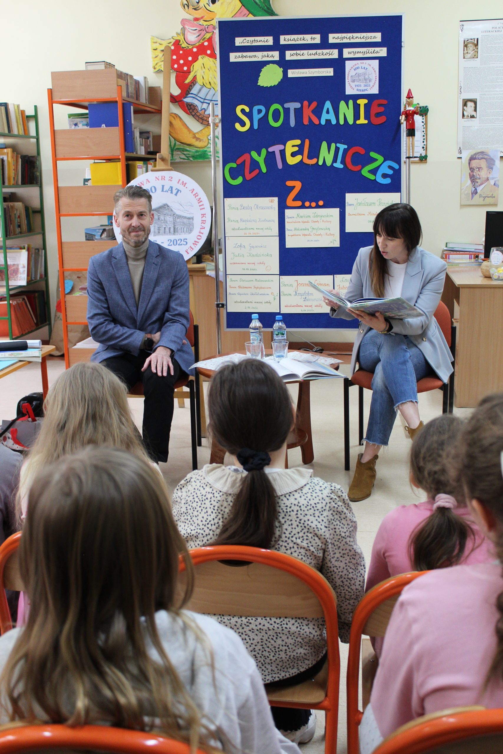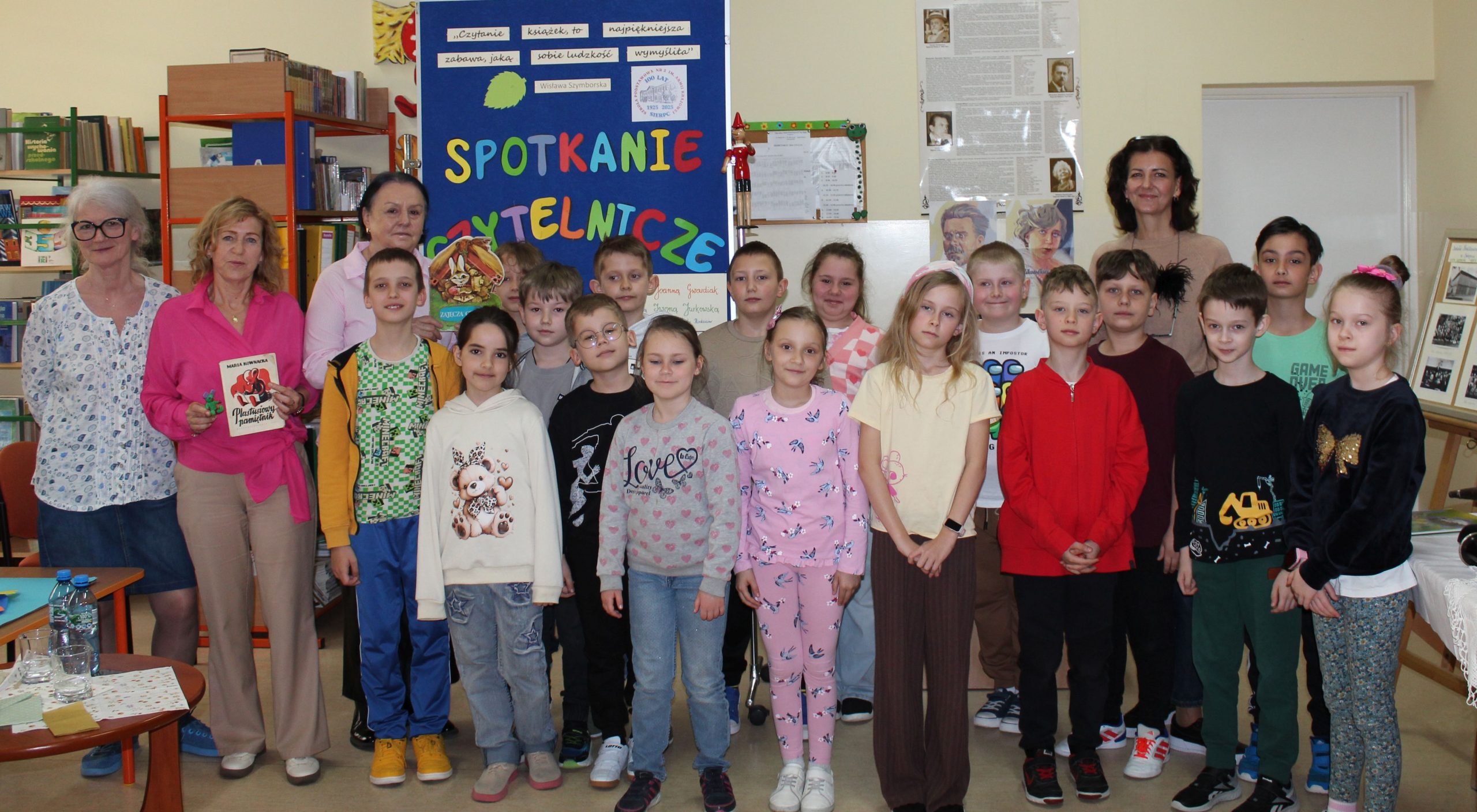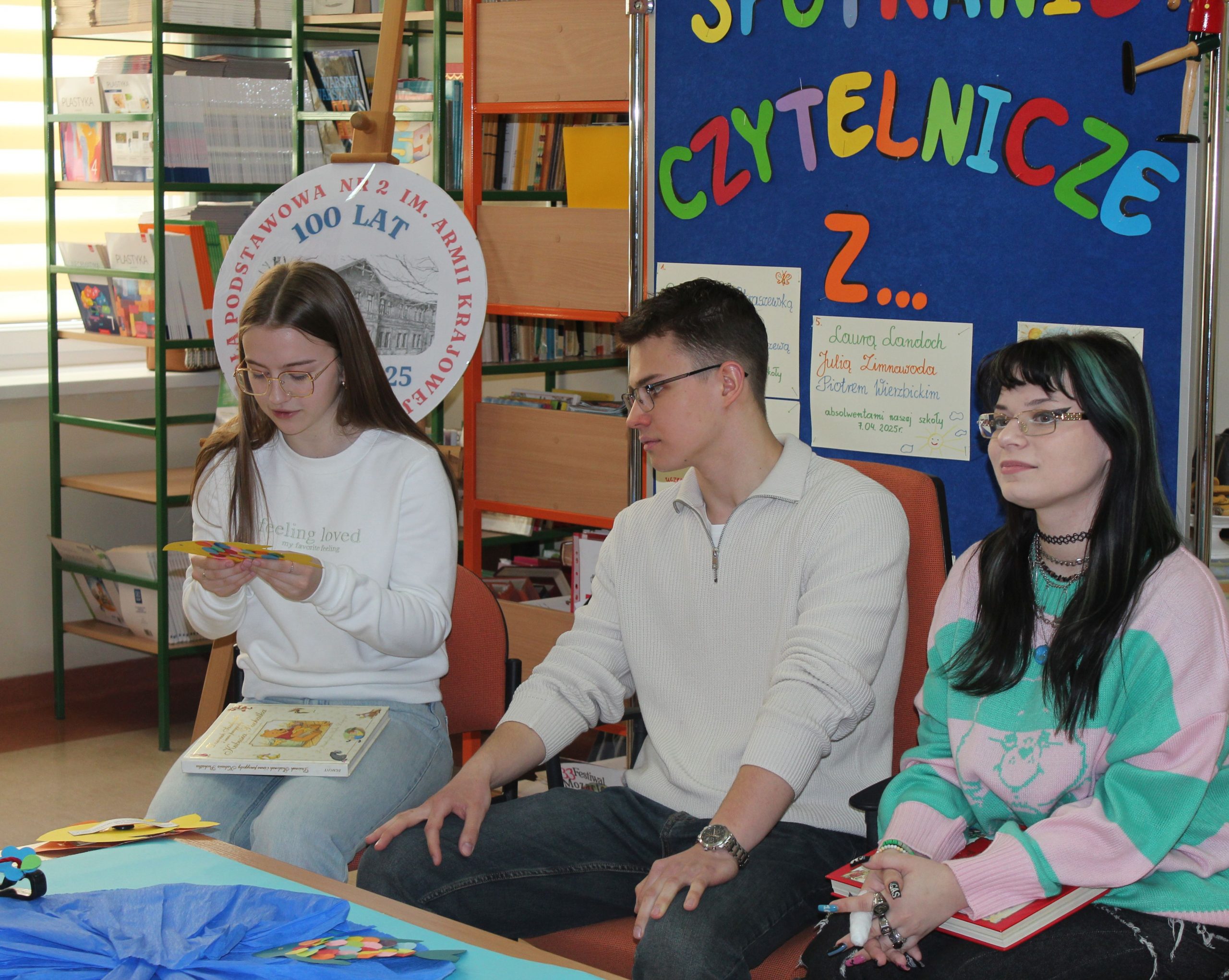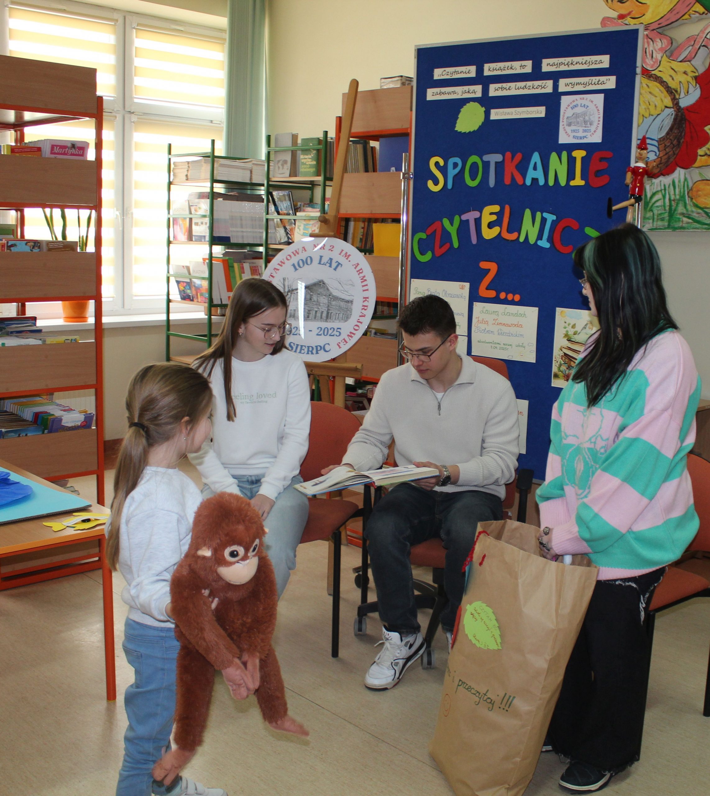 Z okazji Jubileuszu 100- lecia naszej szkoły w bibliotece odbyły się wyjątkowe „Spotkania czytelnicze”, których motywem przewodnim były ulubione książki z dzieciństwa zaproszonych gości. Uczestnicy – wśród nich uczniowie, absolwenci naszej szkoły, przedstawiciele władz miasta, emerytowani nauczyciele, rodzice – czytali uczniom młodszych klas ulubione książki z lat szkolnych, dzielili się wspomnieniami oraz refleksjami związanymi z dawnymi przeżyciami gdy sami byli uczniami. Rozwiązywali wspólnie z dziećmi zagadki literackie. Spotkaniom towarzyszyła ekspozycja starych przedmiotów i fotografii, które przywołały atmosferę minionych lat i wzbudziły wiele emocji. Wydarzenie stworzyło niezwykłą przestrzeń do międzypokoleniowego dialogu i integracji wokół literatury oraz wspólnej historii szkoły.