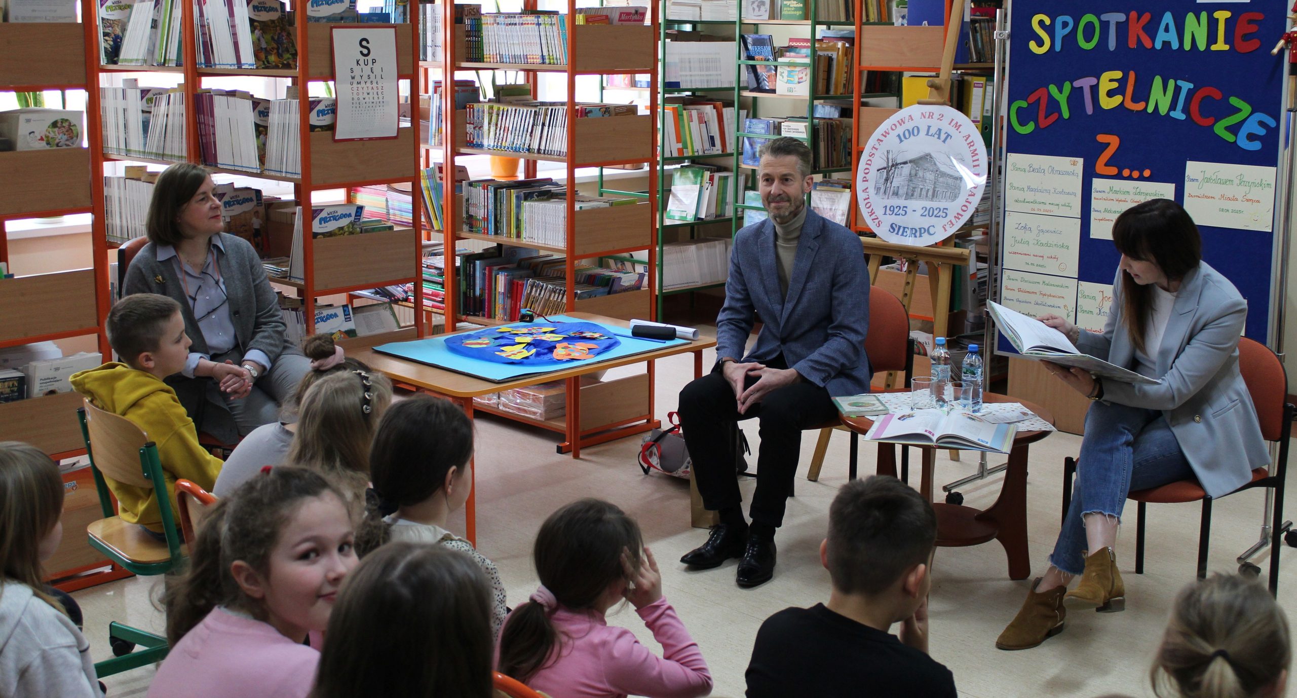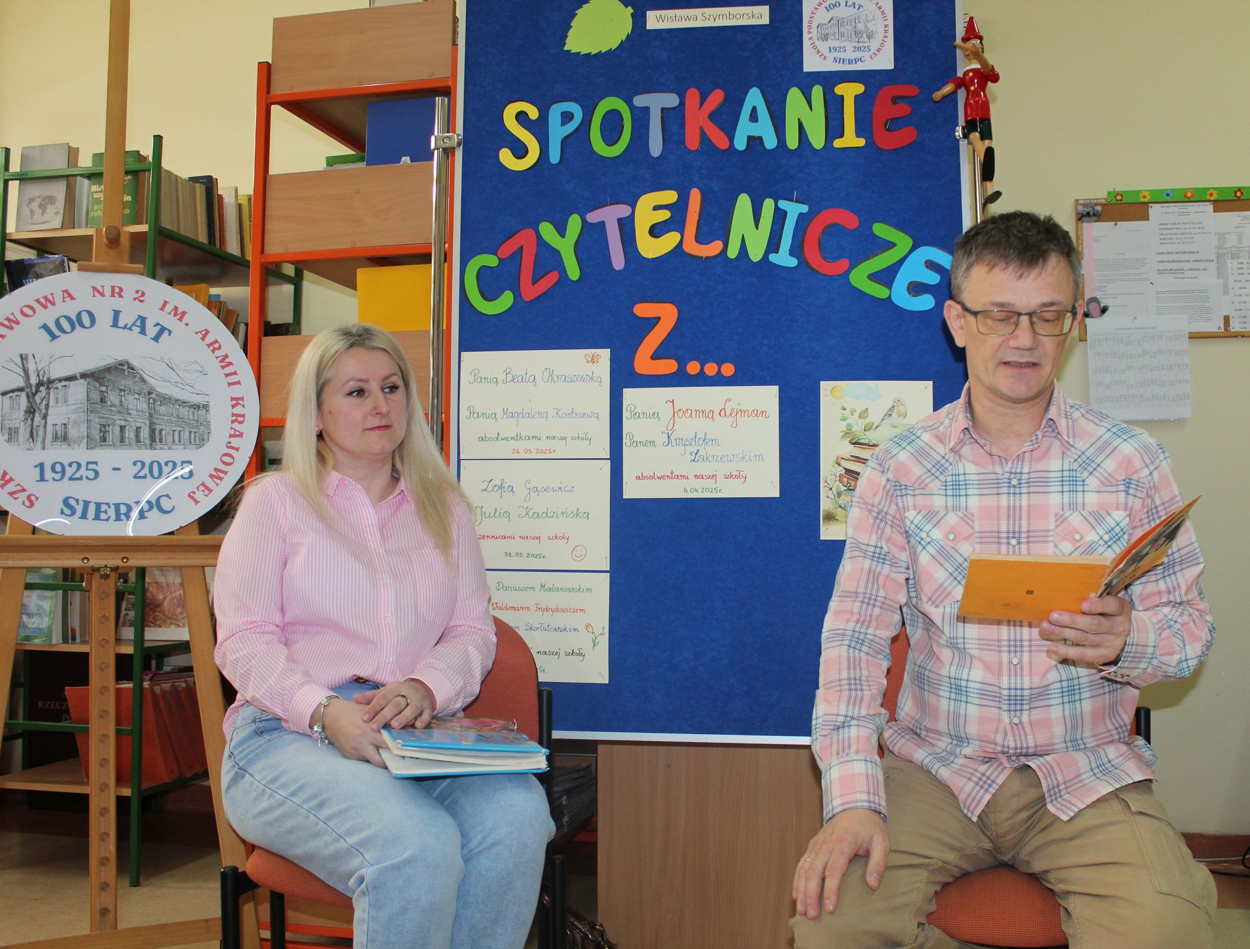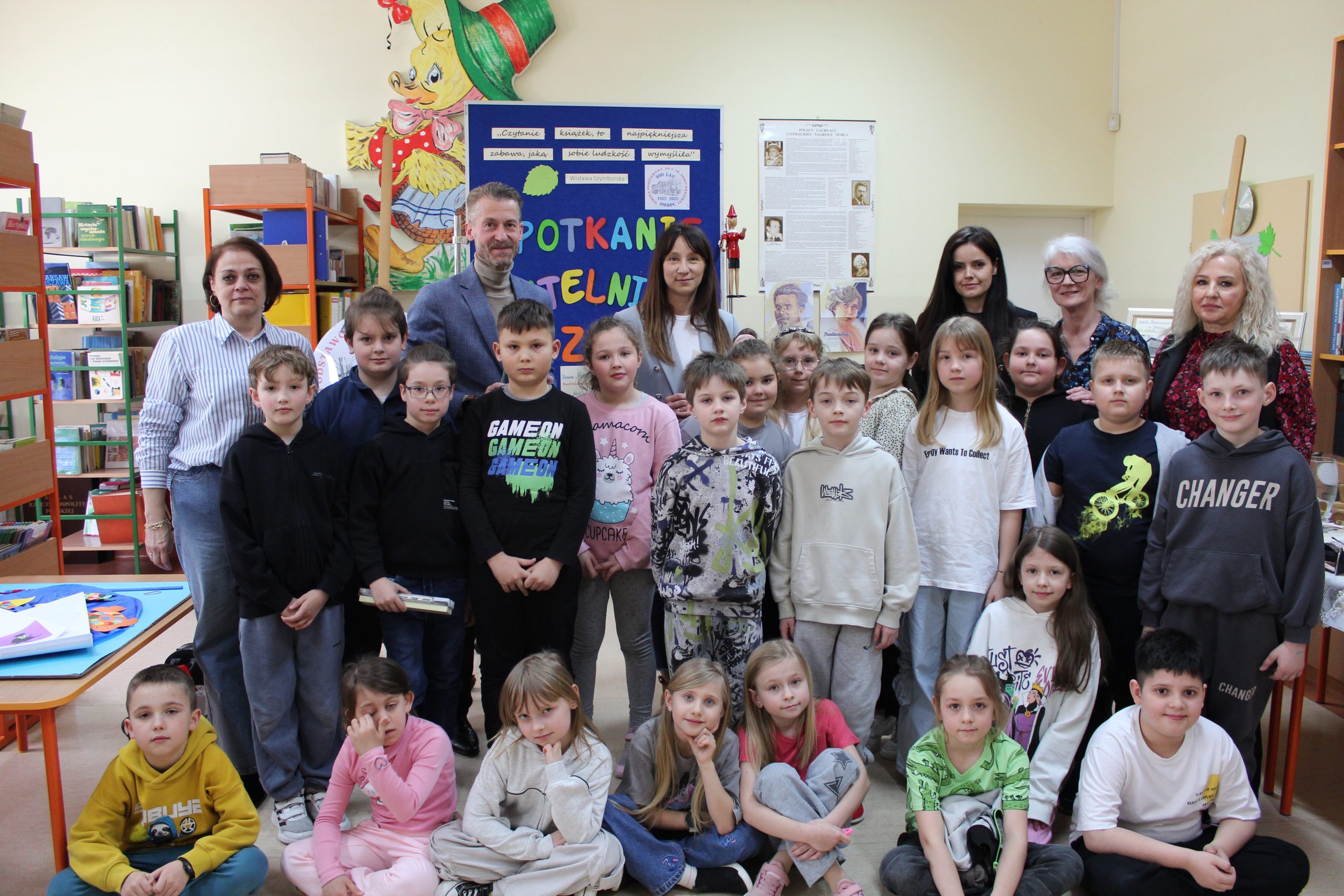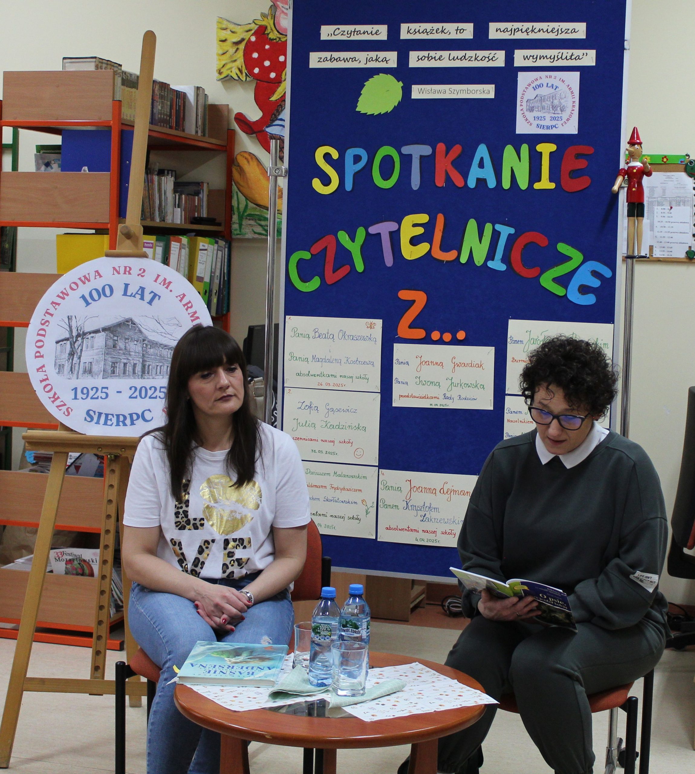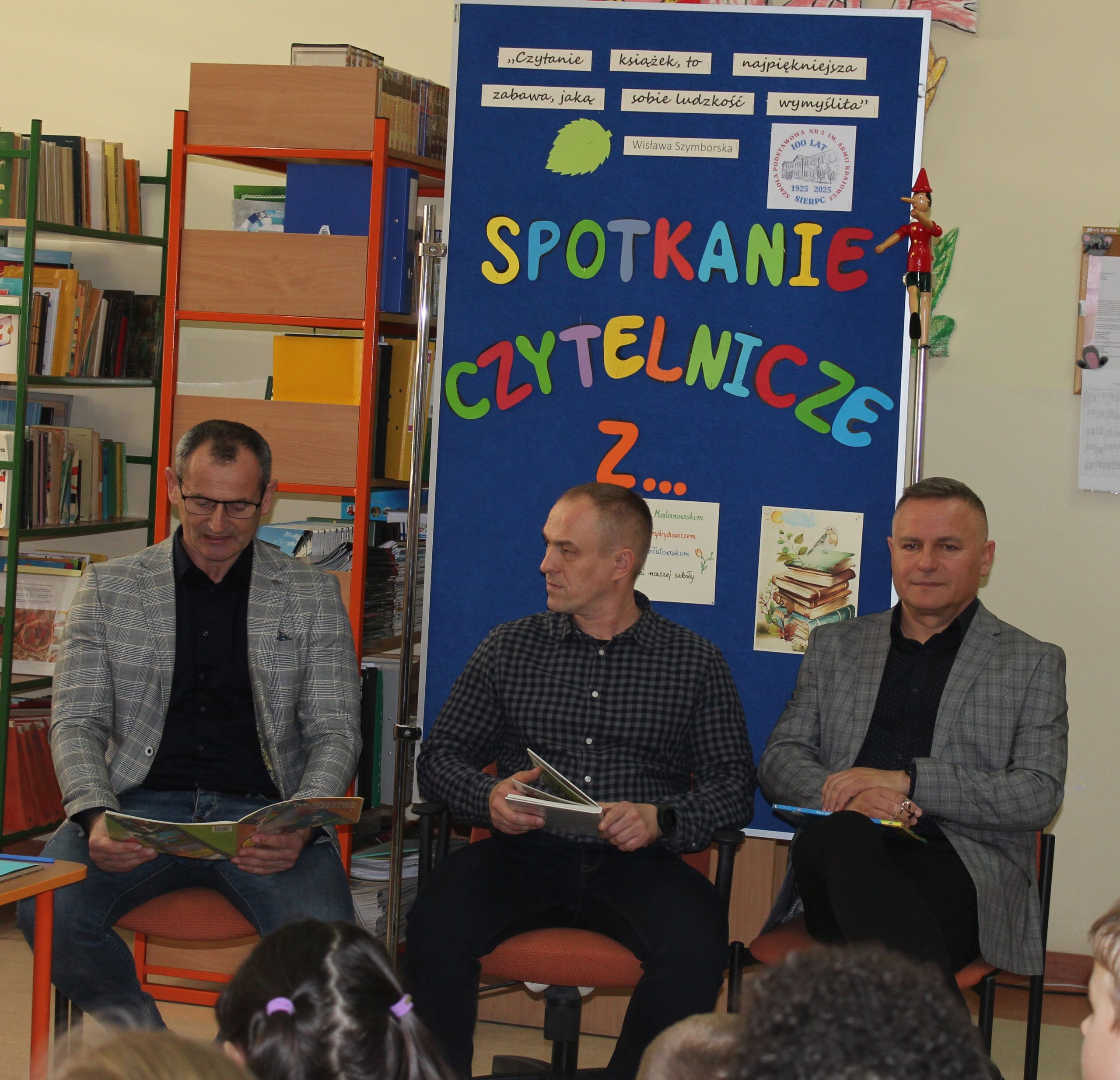 Z okazji Jubileuszu 100- lecia naszej szkoły w bibliotece odbyły się wyjątkowe „Spotkania czytelnicze”, których motywem przewodnim były ulubione książki z dzieciństwa zaproszonych gości. Uczestnicy – wśród nich uczniowie, absolwenci naszej szkoły, przedstawiciele władz miasta, emerytowani nauczyciele, rodzice – czytali uczniom młodszych klas ulubione książki z lat szkolnych, dzielili się wspomnieniami oraz refleksjami związanymi z dawnymi przeżyciami gdy sami byli uczniami. Rozwiązywali wspólnie z dziećmi zagadki literackie. Spotkaniom towarzyszyła ekspozycja starych przedmiotów i fotografii, które przywołały atmosferę minionych lat i wzbudziły wiele emocji. Wydarzenie stworzyło niezwykłą przestrzeń do międzypokoleniowego dialogu i integracji wokół literatury oraz wspólnej historii szkoły.
