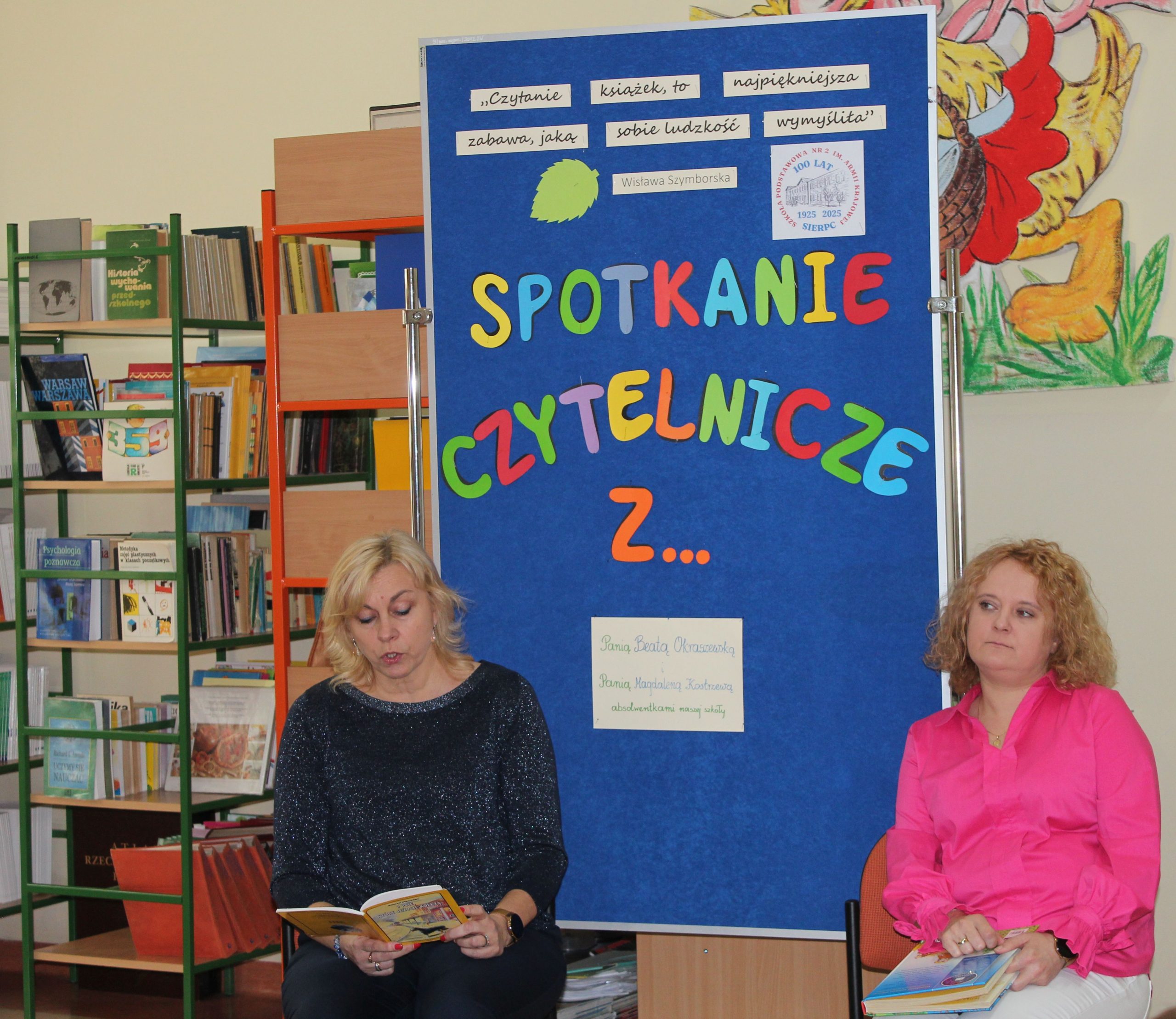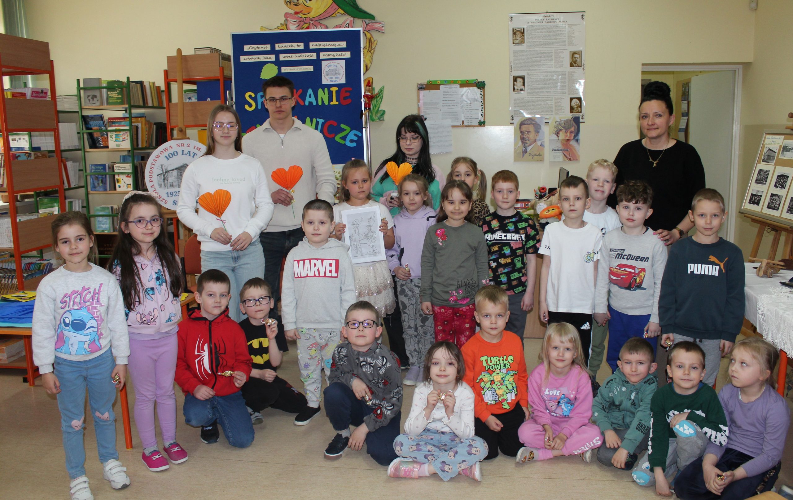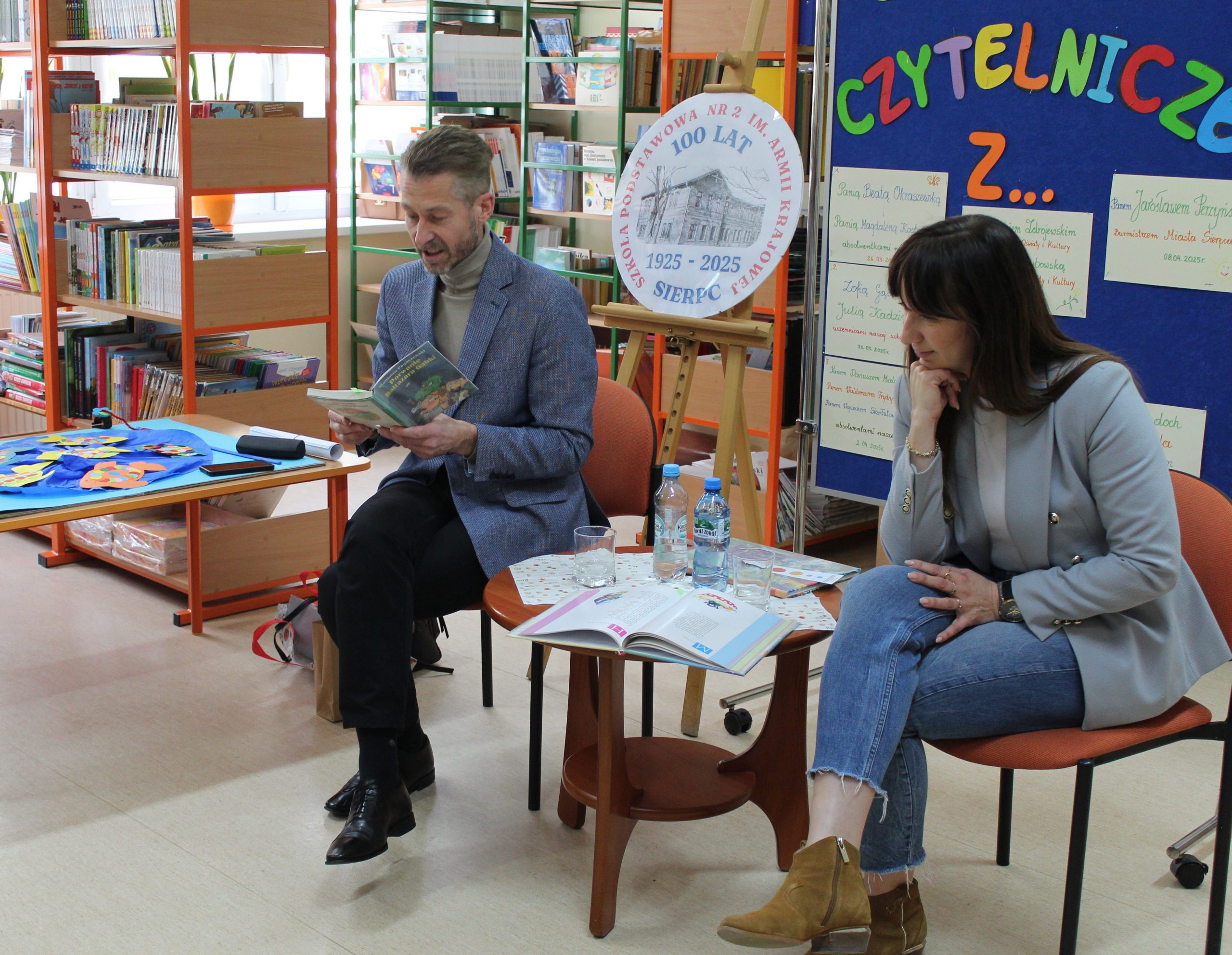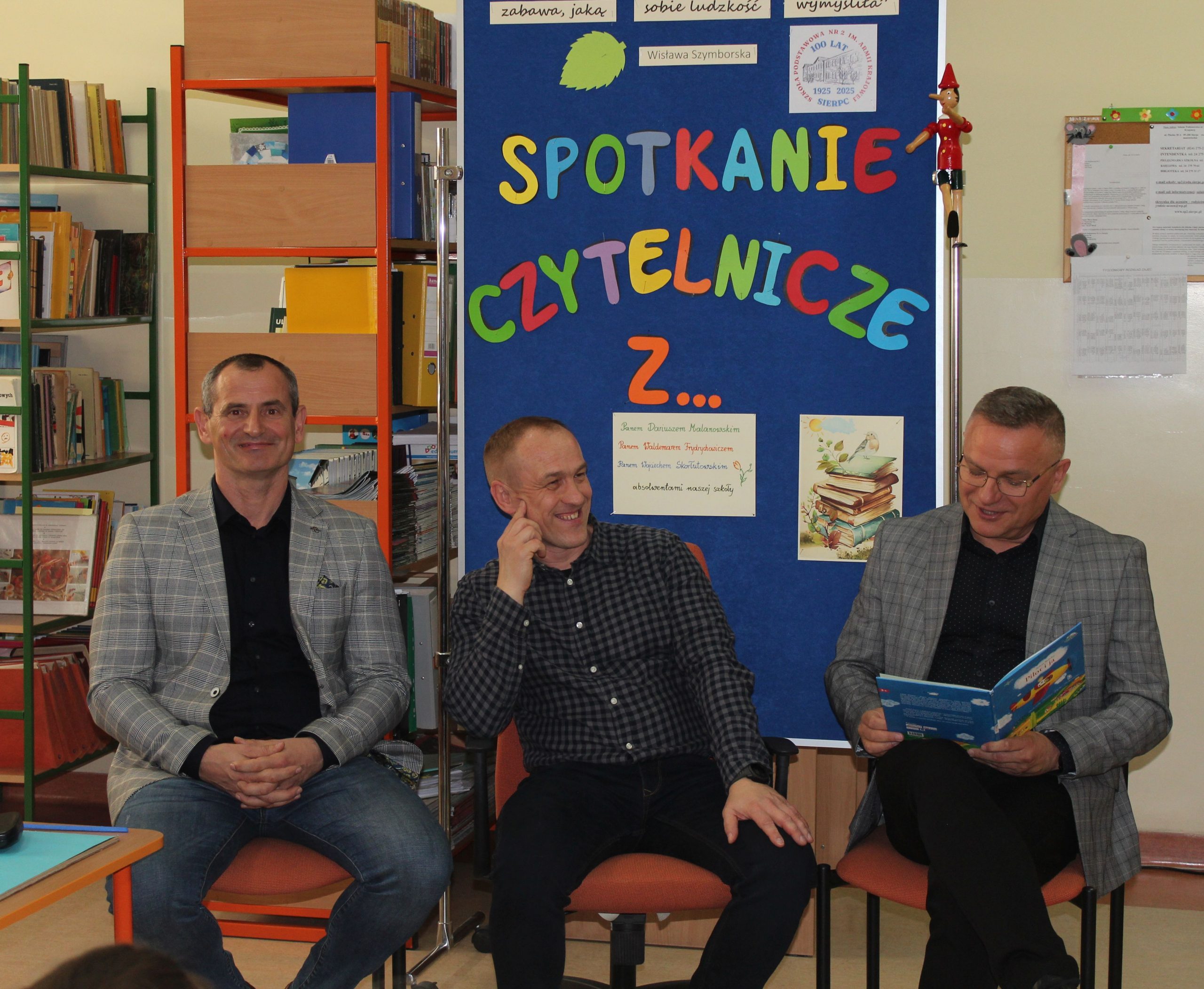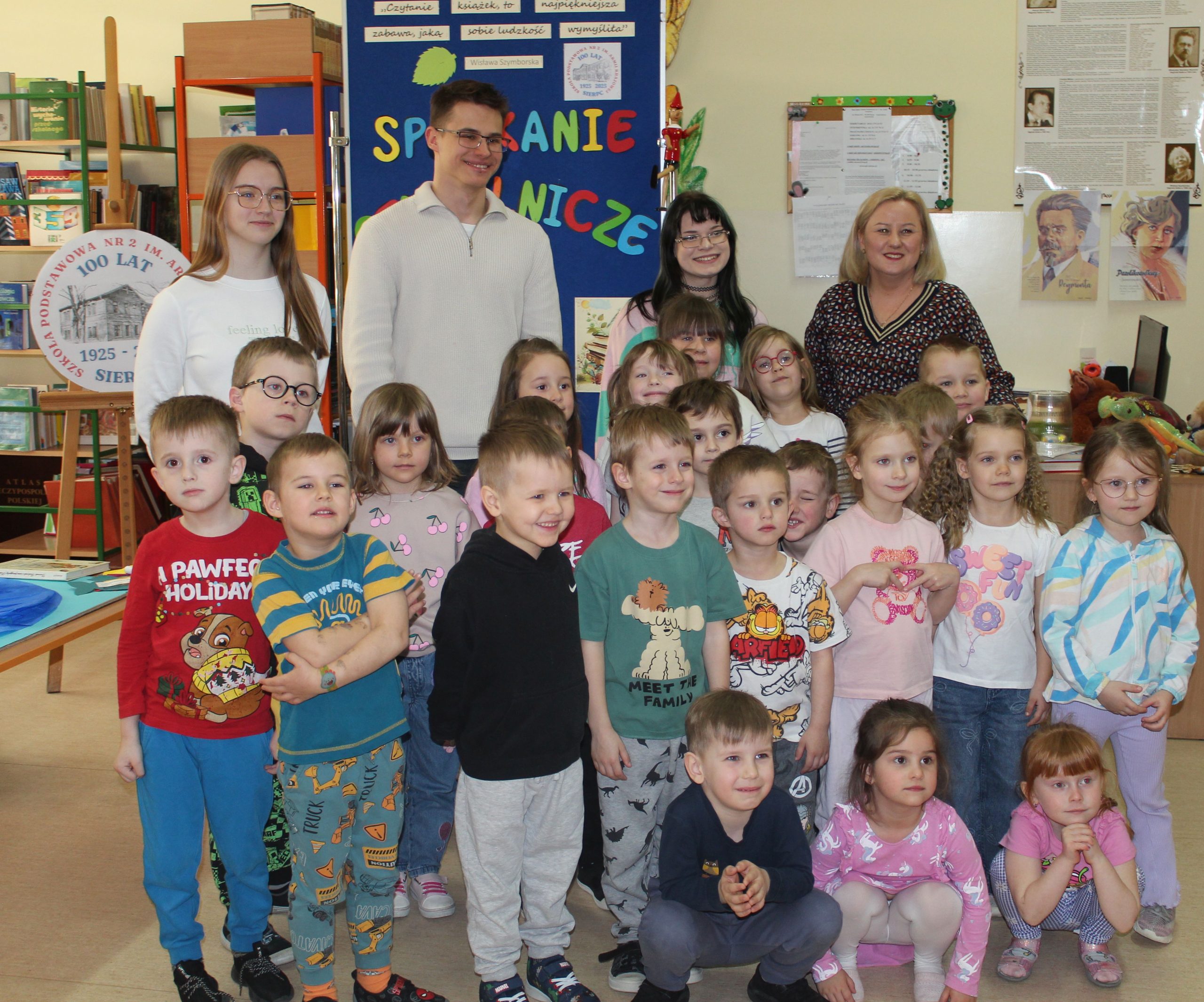 Z okazji Jubileuszu 100- lecia naszej szkoły w bibliotece odbyły się wyjątkowe „Spotkania czytelnicze”, których motywem przewodnim były ulubione książki z dzieciństwa zaproszonych gości. Uczestnicy – wśród nich uczniowie, absolwenci naszej szkoły, przedstawiciele władz miasta, emerytowani nauczyciele, rodzice – czytali uczniom młodszych klas ulubione książki z lat szkolnych, dzielili się wspomnieniami oraz refleksjami związanymi z dawnymi przeżyciami gdy sami byli uczniami. Rozwiązywali wspólnie z dziećmi zagadki literackie. Spotkaniom towarzyszyła ekspozycja starych przedmiotów i fotografii, które przywołały atmosferę minionych lat i wzbudziły wiele emocji. Wydarzenie stworzyło niezwykłą przestrzeń do międzypokoleniowego dialogu i integracji wokół literatury oraz wspólnej historii szkoły.