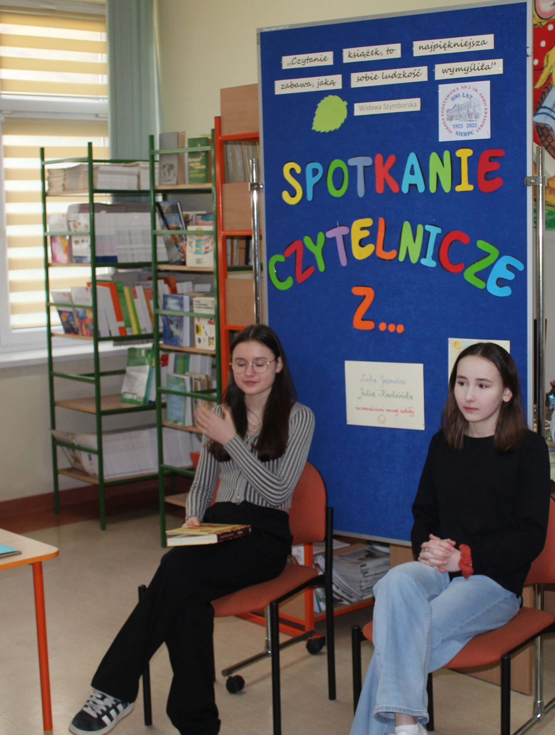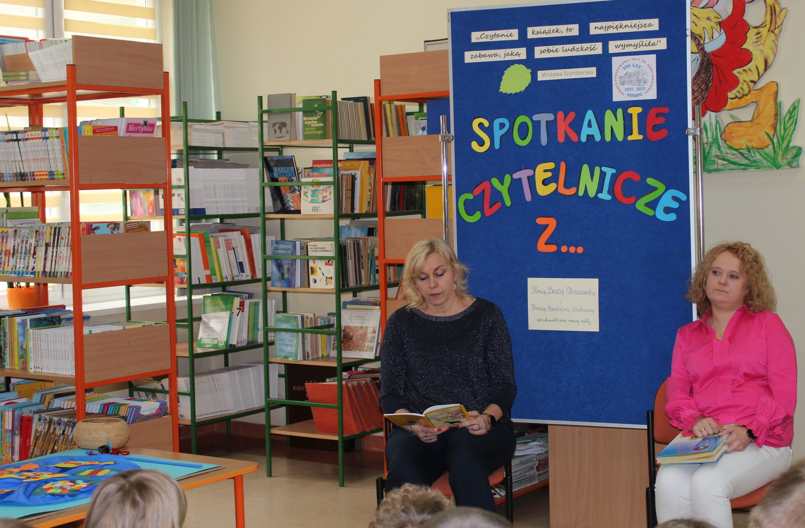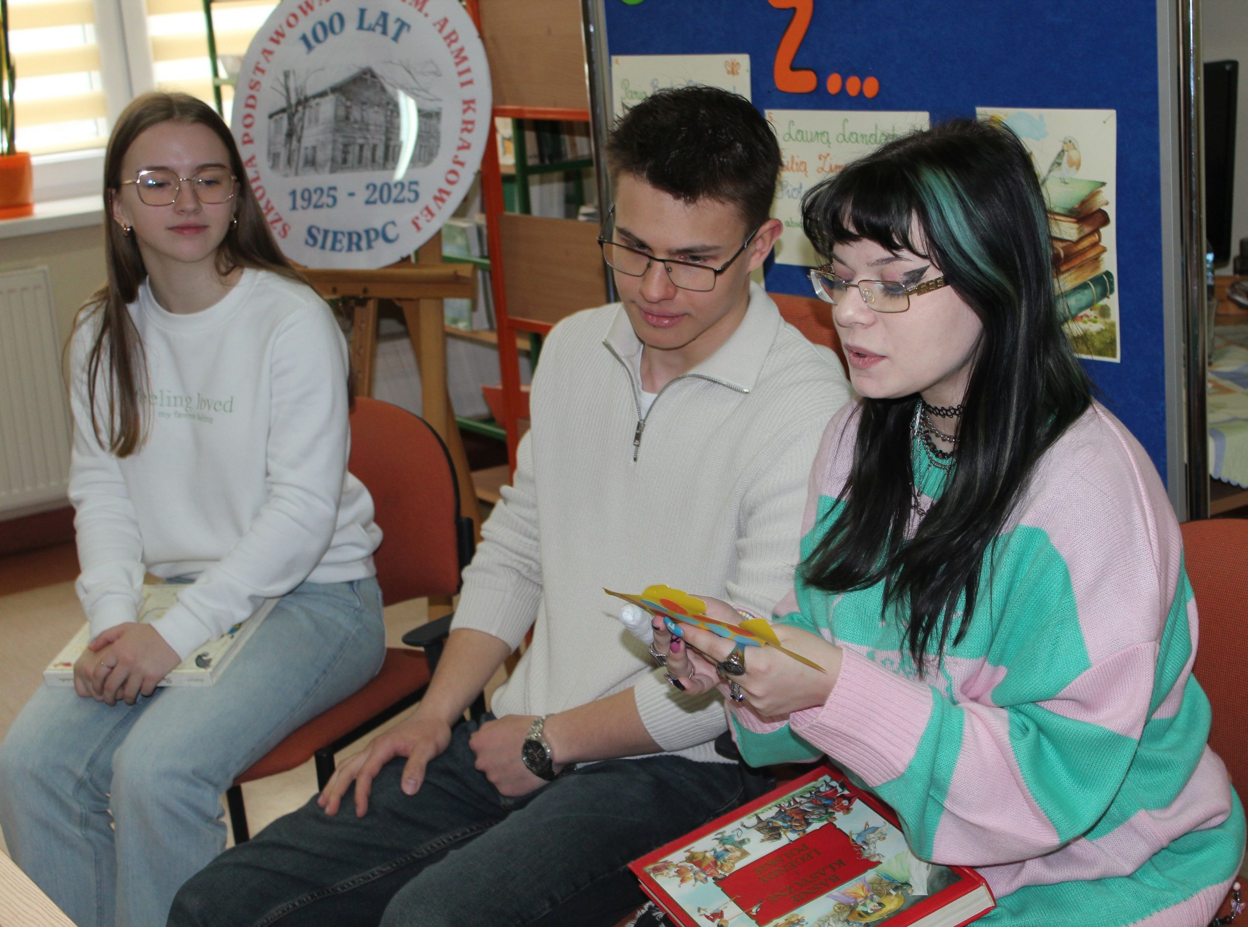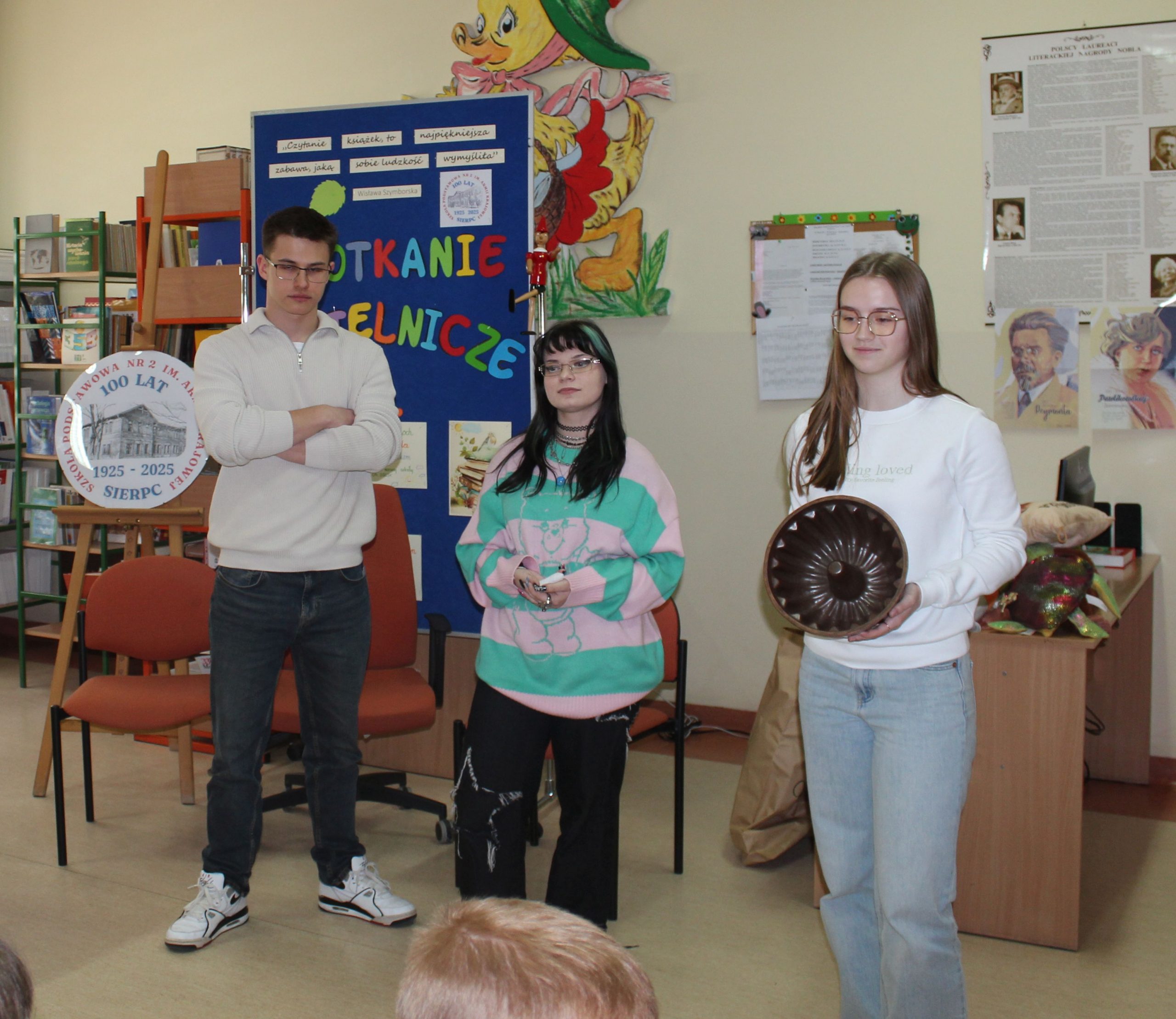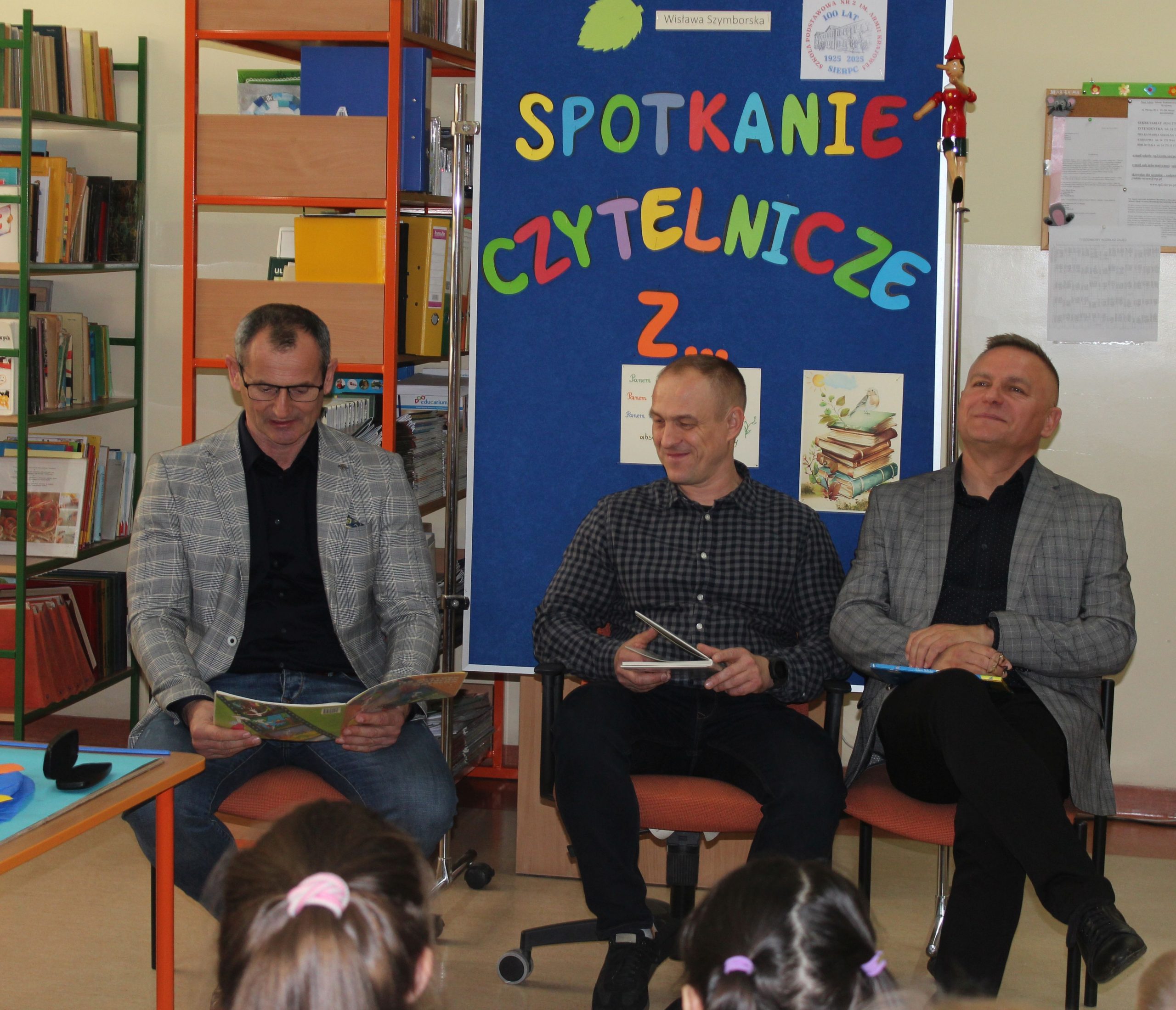 Z okazji Jubileuszu 100- lecia naszej szkoły w bibliotece odbyły się wyjątkowe „Spotkania czytelnicze”, których motywem przewodnim były ulubione książki z dzieciństwa zaproszonych gości. Uczestnicy – wśród nich uczniowie, absolwenci naszej szkoły, przedstawiciele władz miasta, emerytowani nauczyciele, rodzice – czytali uczniom młodszych klas ulubione książki z lat szkolnych, dzielili się wspomnieniami oraz refleksjami związanymi z dawnymi przeżyciami gdy sami byli uczniami. Rozwiązywali wspólnie z dziećmi zagadki literackie. Spotkaniom towarzyszyła ekspozycja starych przedmiotów i fotografii, które przywołały atmosferę minionych lat i wzbudziły wiele emocji. Wydarzenie stworzyło niezwykłą przestrzeń do międzypokoleniowego dialogu i integracji wokół literatury oraz wspólnej historii szkoły.