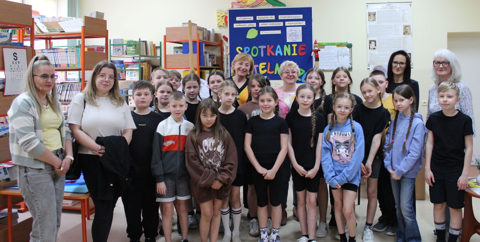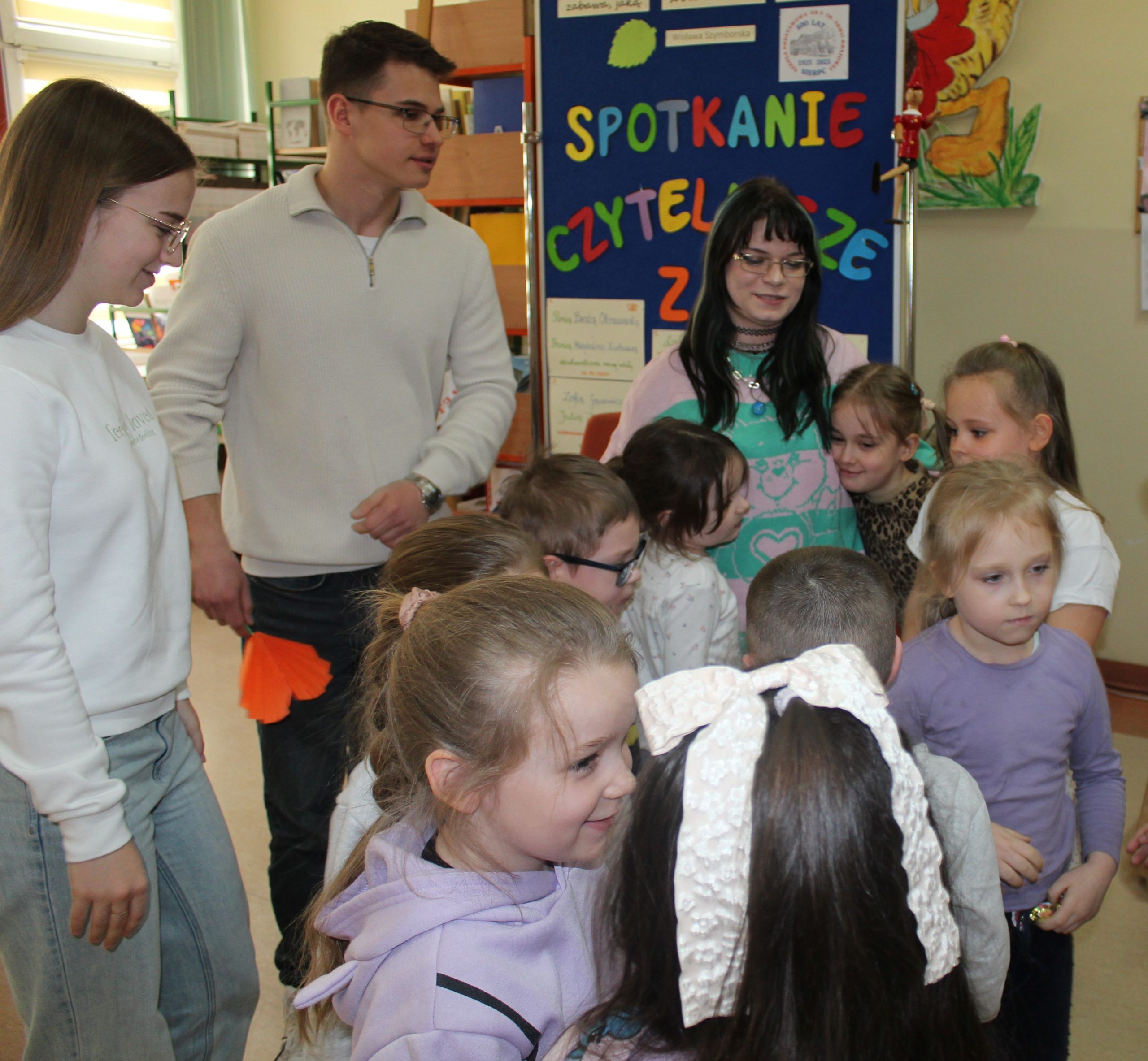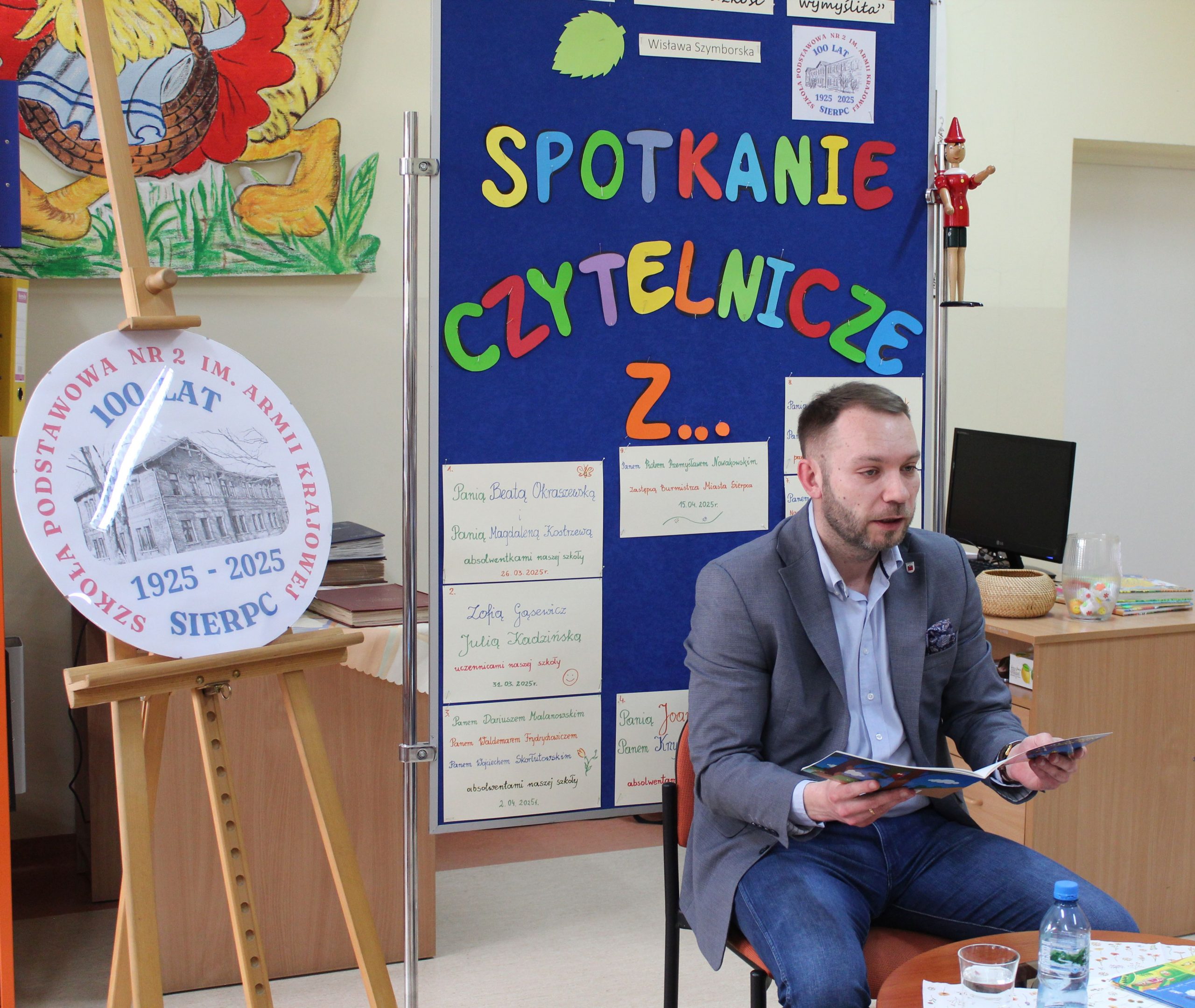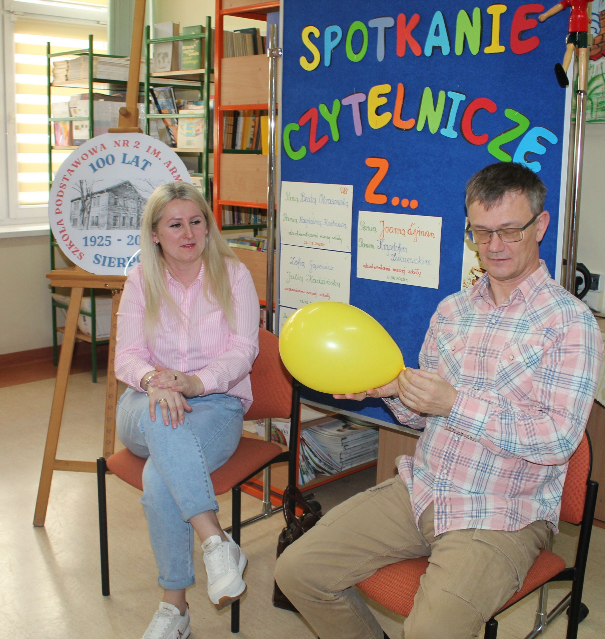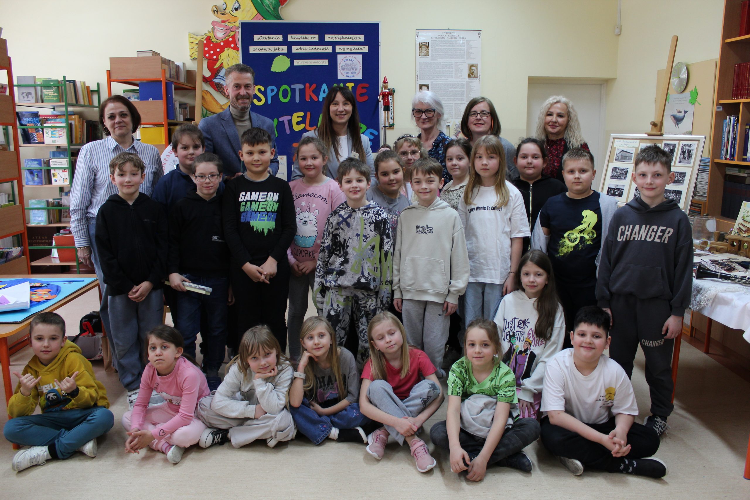 Z okazji Jubileuszu 100- lecia naszej szkoły w bibliotece odbyły się wyjątkowe „Spotkania czytelnicze”, których motywem przewodnim były ulubione książki z dzieciństwa zaproszonych gości. Uczestnicy – wśród nich uczniowie, absolwenci naszej szkoły, przedstawiciele władz miasta, emerytowani nauczyciele, rodzice – czytali uczniom młodszych klas ulubione książki z lat szkolnych, dzielili się wspomnieniami oraz refleksjami związanymi z dawnymi przeżyciami gdy sami byli uczniami. Rozwiązywali wspólnie z dziećmi zagadki literackie. Spotkaniom towarzyszyła ekspozycja starych przedmiotów i fotografii, które przywołały atmosferę minionych lat i wzbudziły wiele emocji. Wydarzenie stworzyło niezwykłą przestrzeń do międzypokoleniowego dialogu i integracji wokół literatury oraz wspólnej historii szkoły.