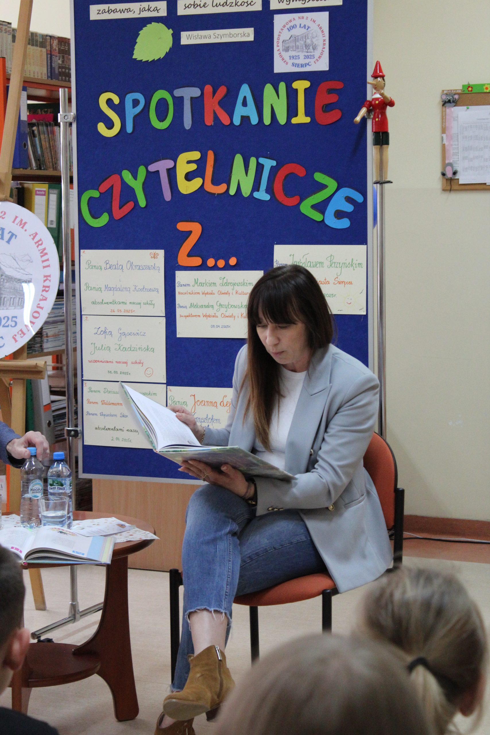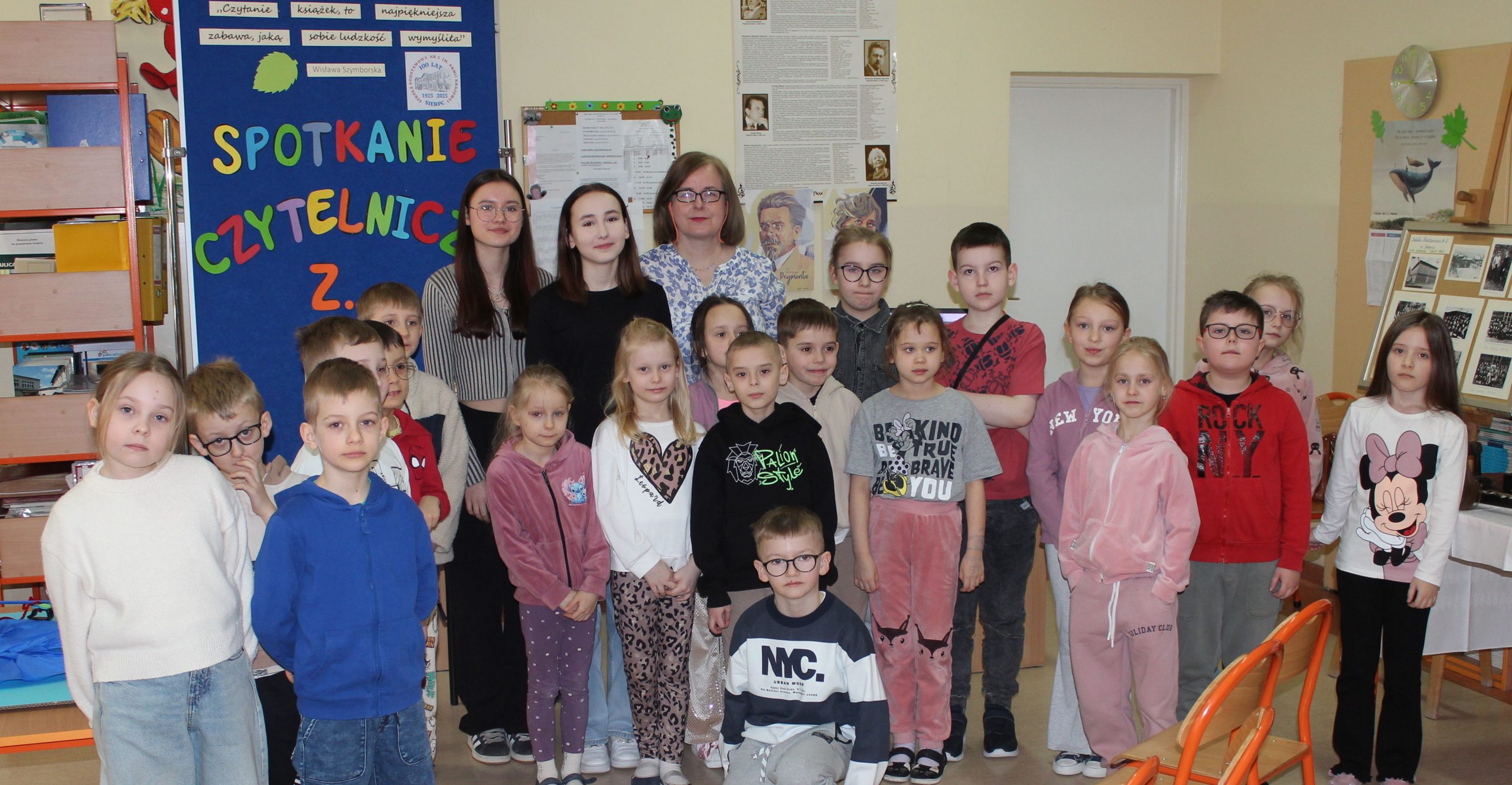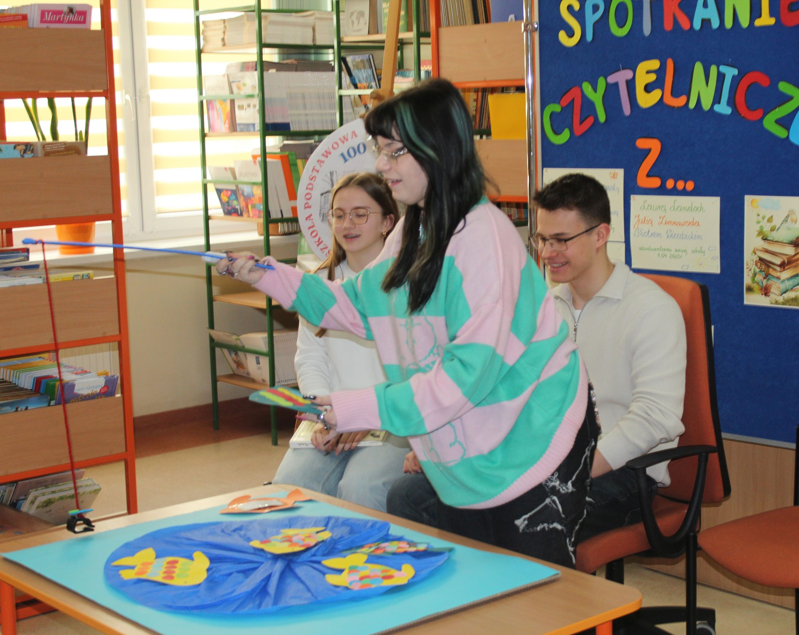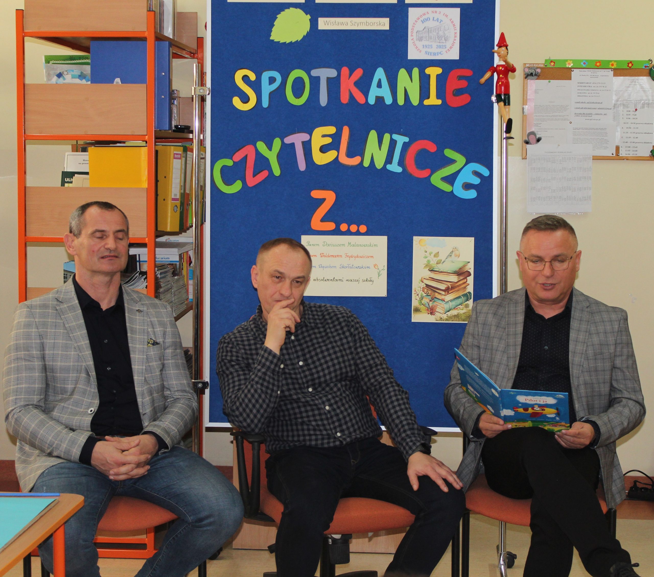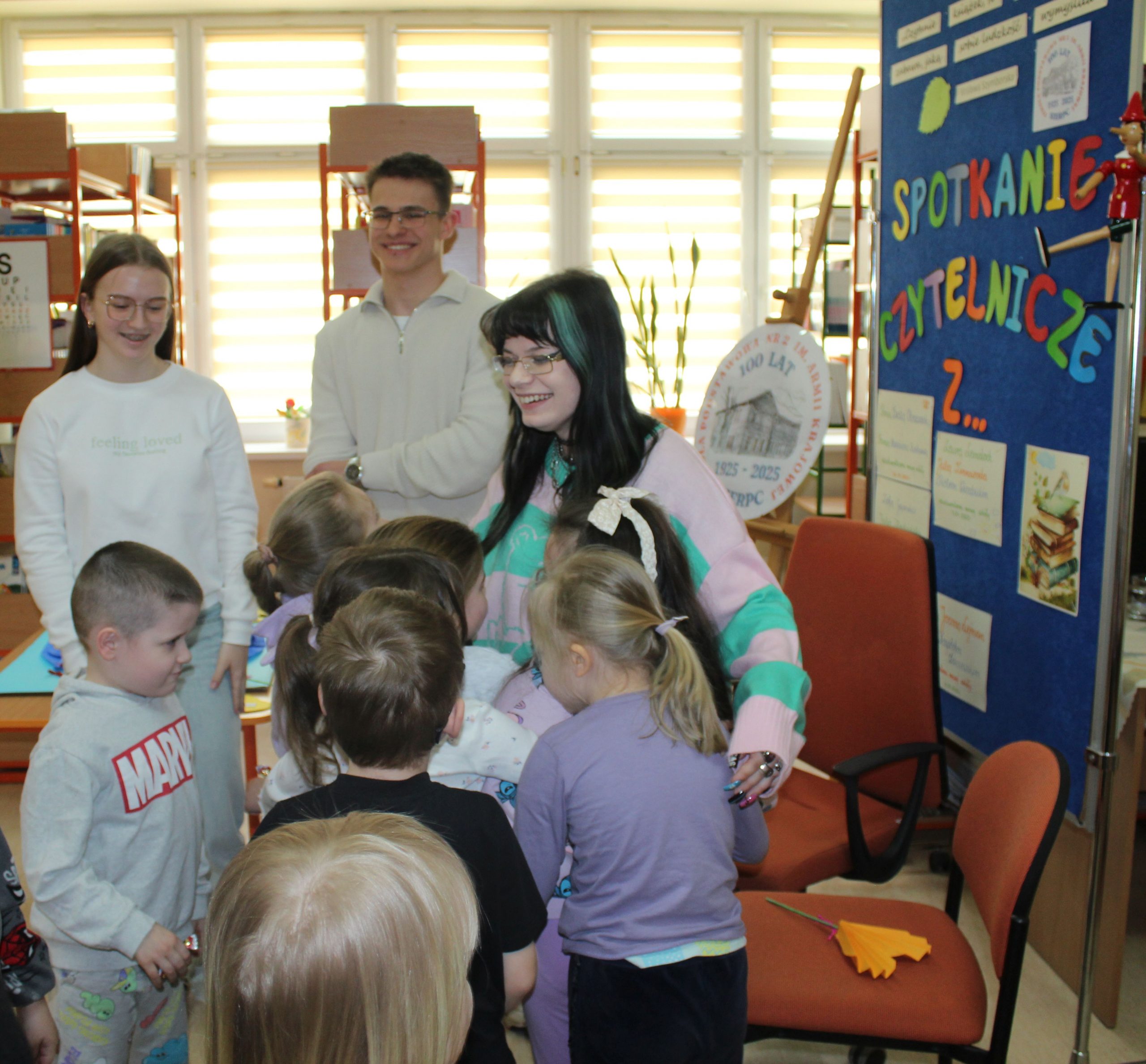 Z okazji Jubileuszu 100- lecia naszej szkoły w bibliotece odbyły się wyjątkowe „Spotkania czytelnicze”, których motywem przewodnim były ulubione książki z dzieciństwa zaproszonych gości. Uczestnicy – wśród nich uczniowie, absolwenci naszej szkoły, przedstawiciele władz miasta, emerytowani nauczyciele, rodzice – czytali uczniom młodszych klas ulubione książki z lat szkolnych, dzielili się wspomnieniami oraz refleksjami związanymi z dawnymi przeżyciami gdy sami byli uczniami. Rozwiązywali wspólnie z dziećmi zagadki literackie. Spotkaniom towarzyszyła ekspozycja starych przedmiotów i fotografii, które przywołały atmosferę minionych lat i wzbudziły wiele emocji. Wydarzenie stworzyło niezwykłą przestrzeń do międzypokoleniowego dialogu i integracji wokół literatury oraz wspólnej historii szkoły.