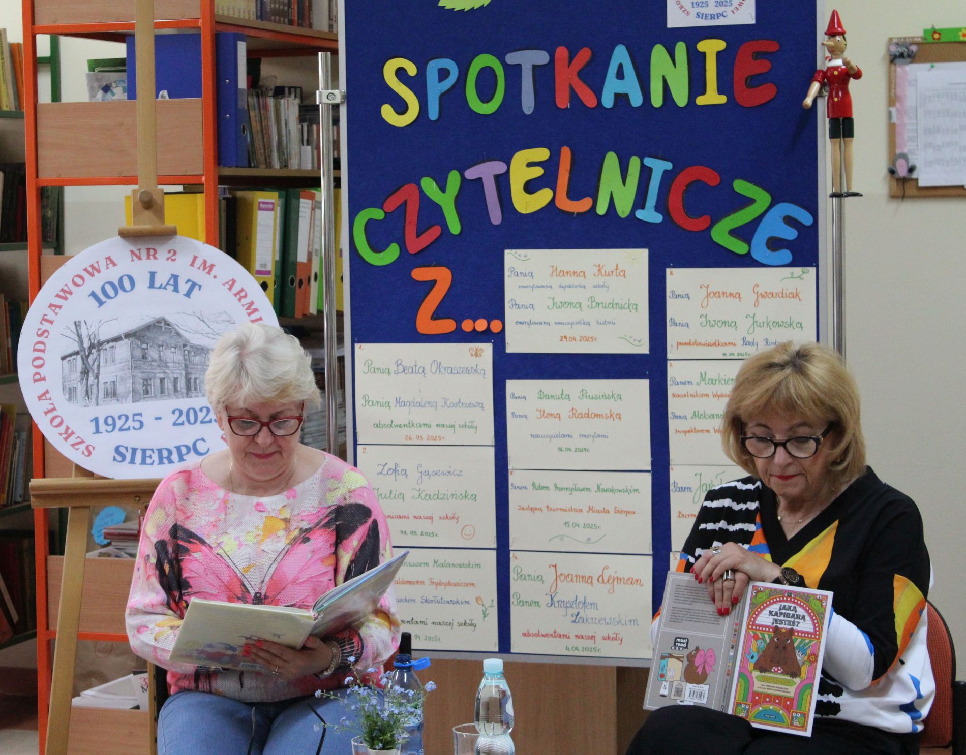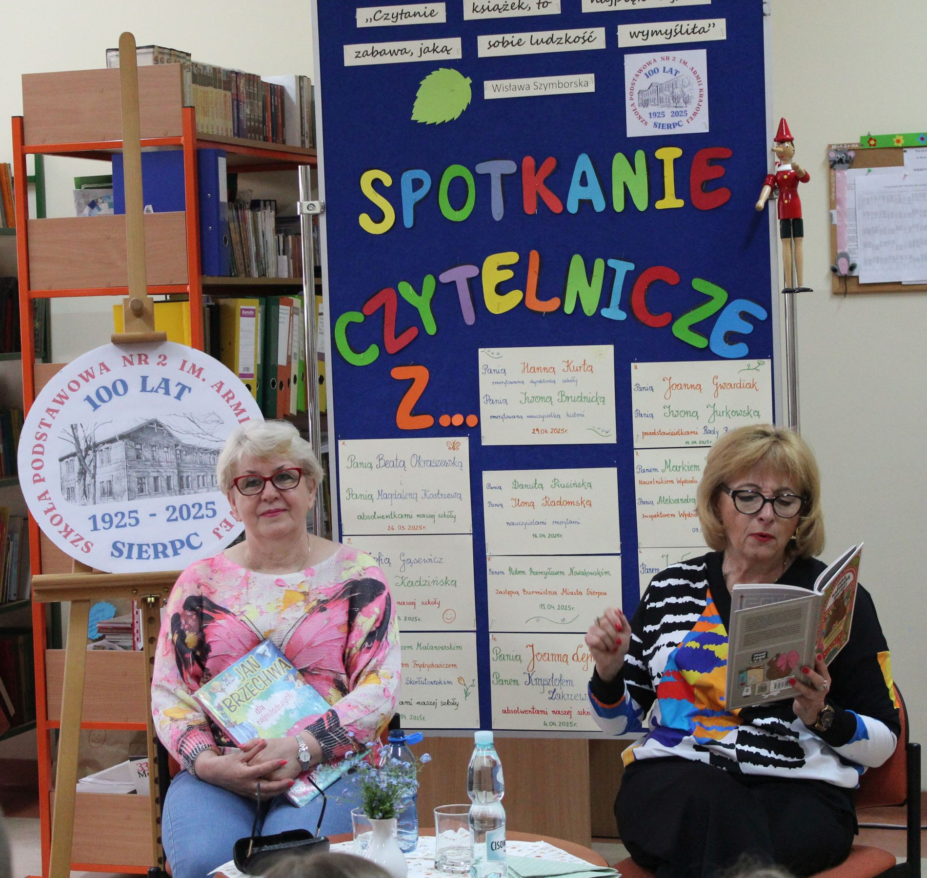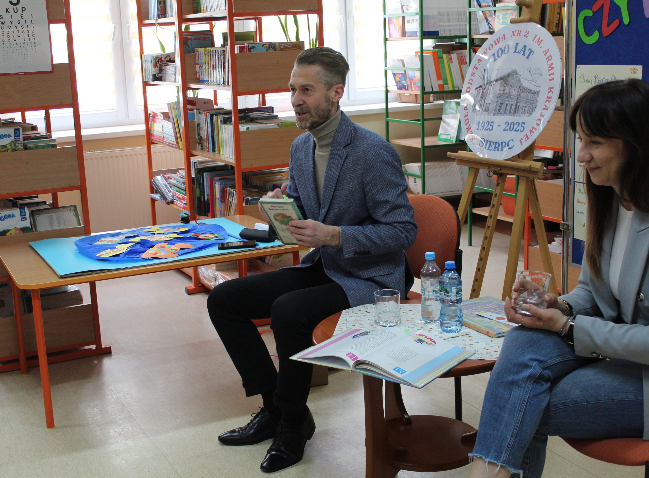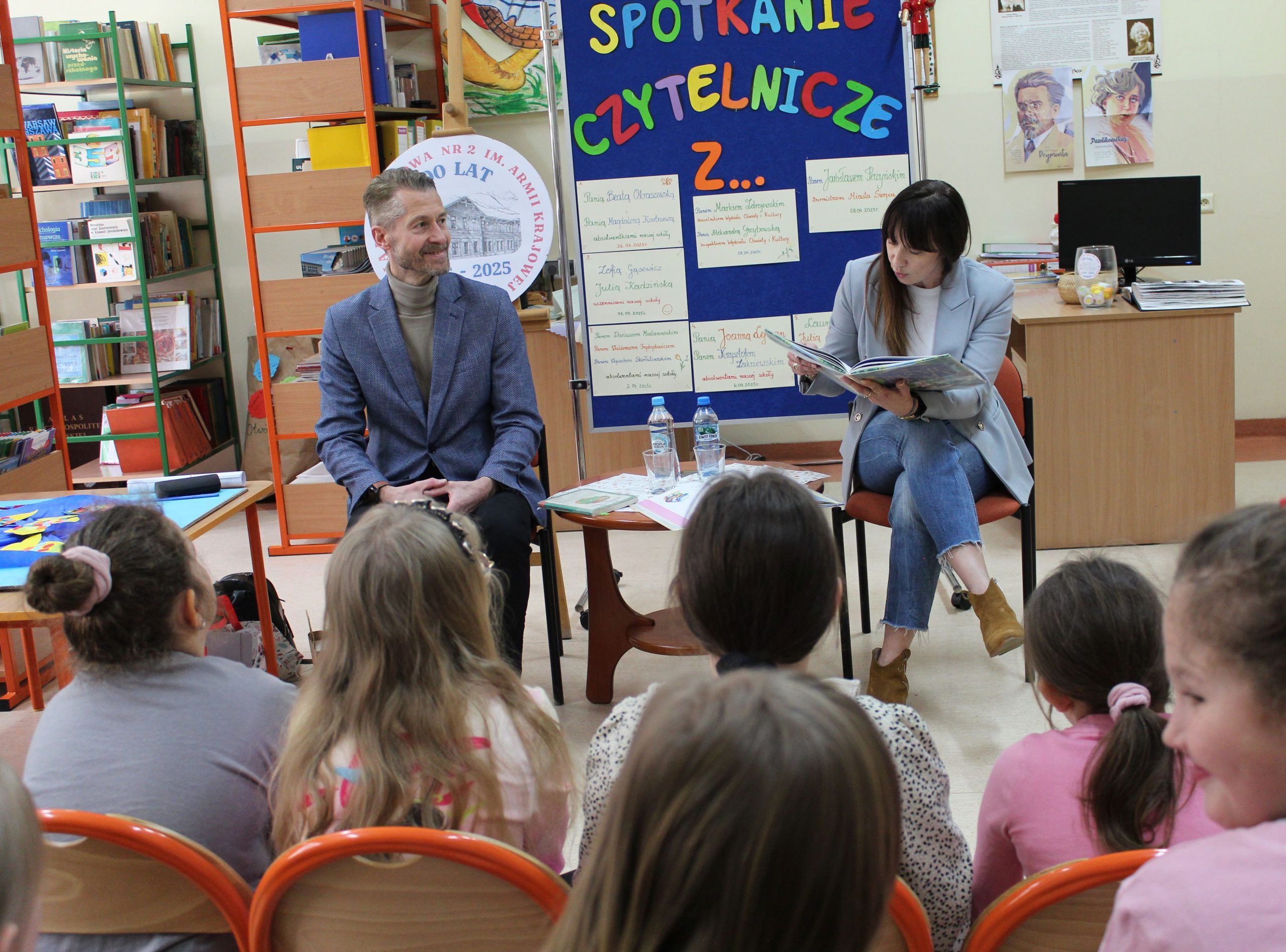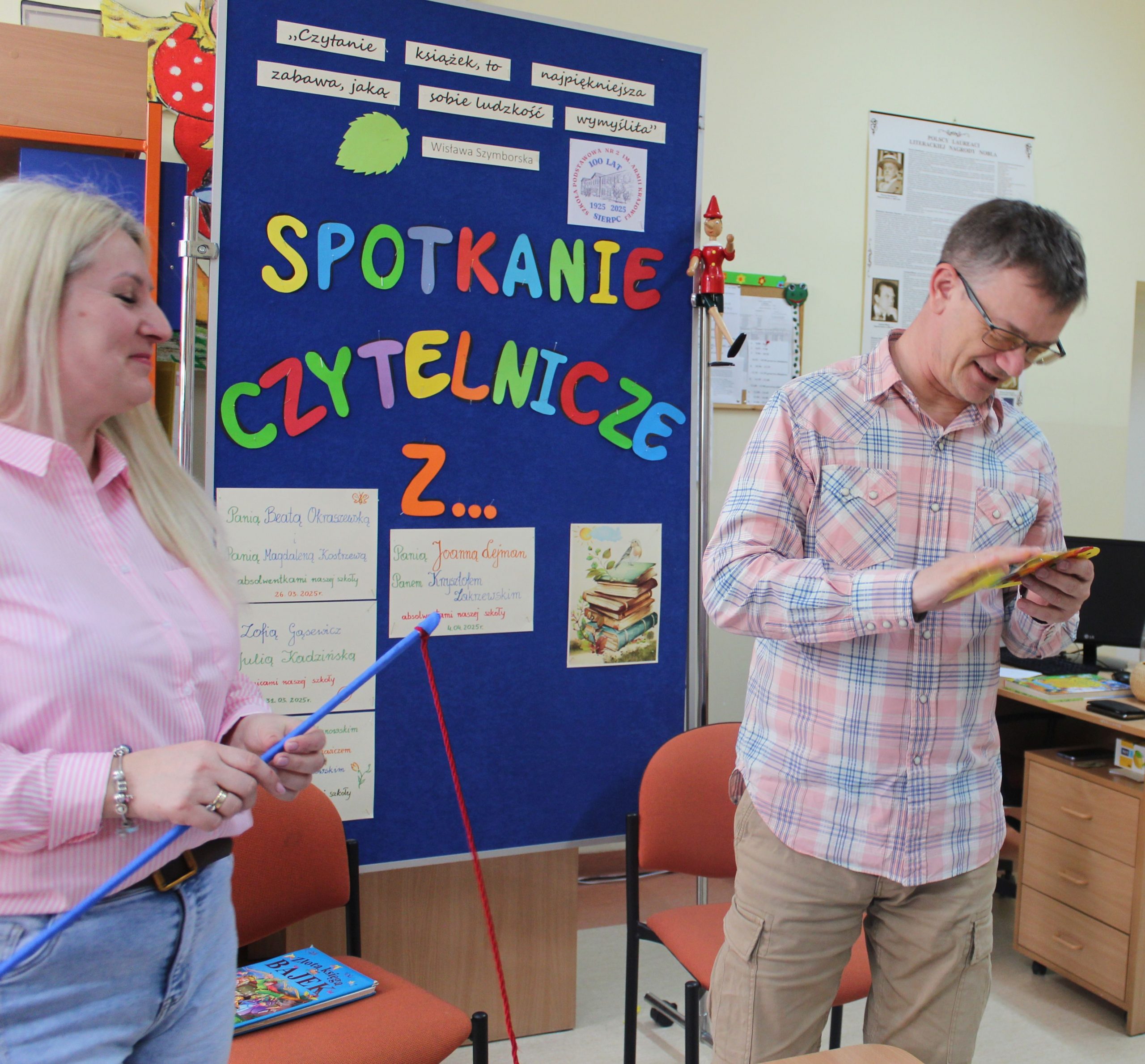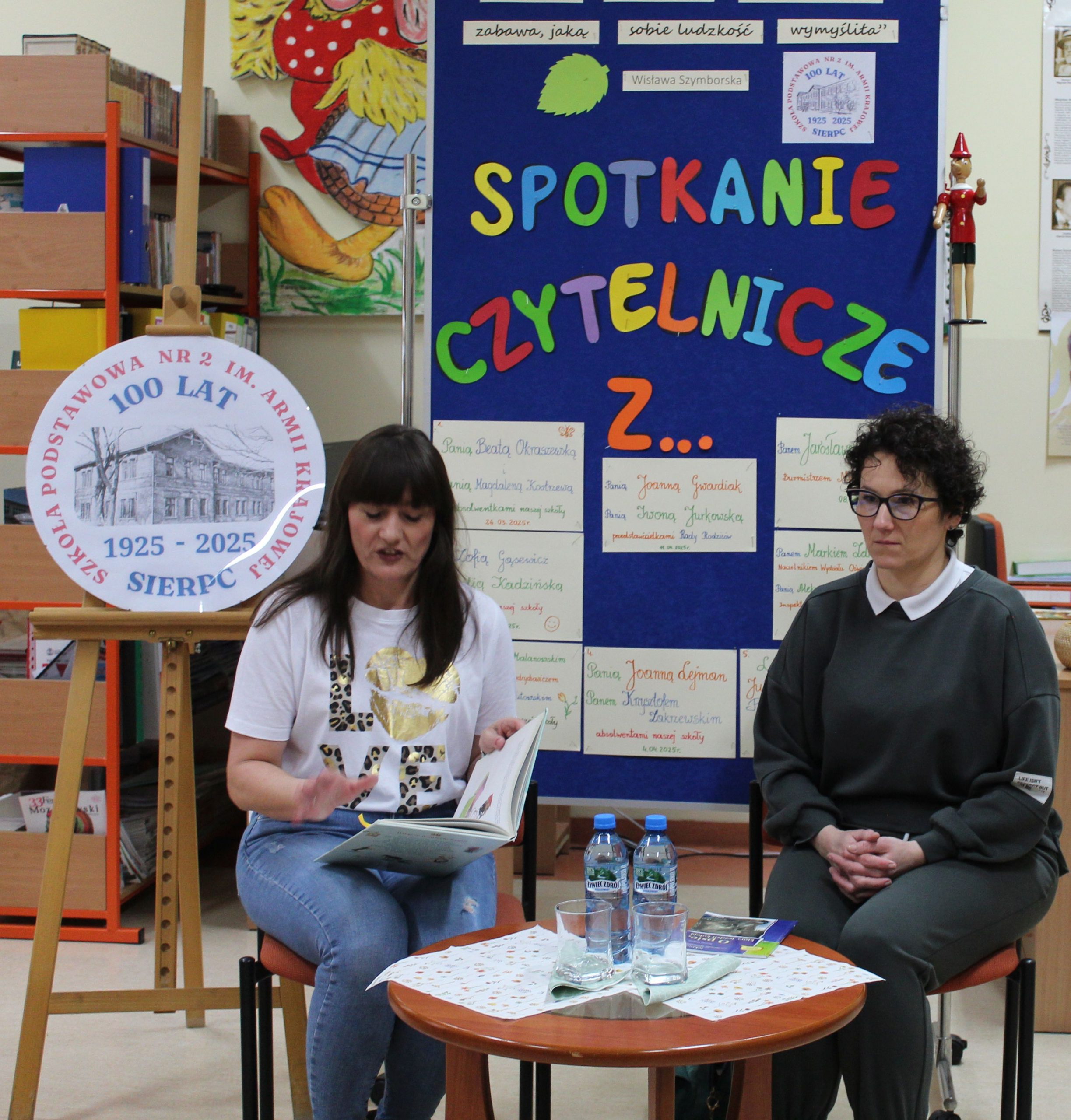 Z okazji Jubileuszu 100- lecia naszej szkoły w bibliotece odbyły się wyjątkowe „Spotkania czytelnicze”, których motywem przewodnim były ulubione książki z dzieciństwa zaproszonych gości. Uczestnicy – wśród nich uczniowie, absolwenci naszej szkoły, przedstawiciele władz miasta, emerytowani nauczyciele, rodzice – czytali uczniom młodszych klas ulubione książki z lat szkolnych, dzielili się wspomnieniami oraz refleksjami związanymi z dawnymi przeżyciami gdy sami byli uczniami. Rozwiązywali wspólnie z dziećmi zagadki literackie. Spotkaniom towarzyszyła ekspozycja starych przedmiotów i fotografii, które przywołały atmosferę minionych lat i wzbudziły wiele emocji. Wydarzenie stworzyło niezwykłą przestrzeń do międzypokoleniowego dialogu i integracji wokół literatury oraz wspólnej historii szkoły.