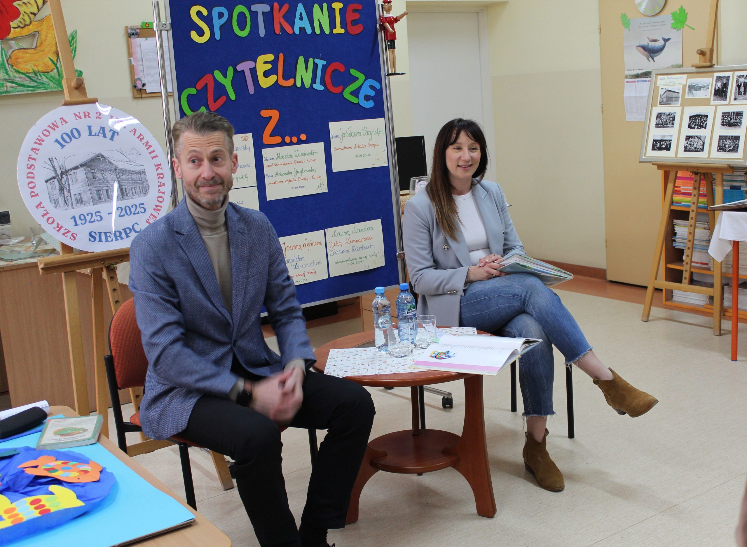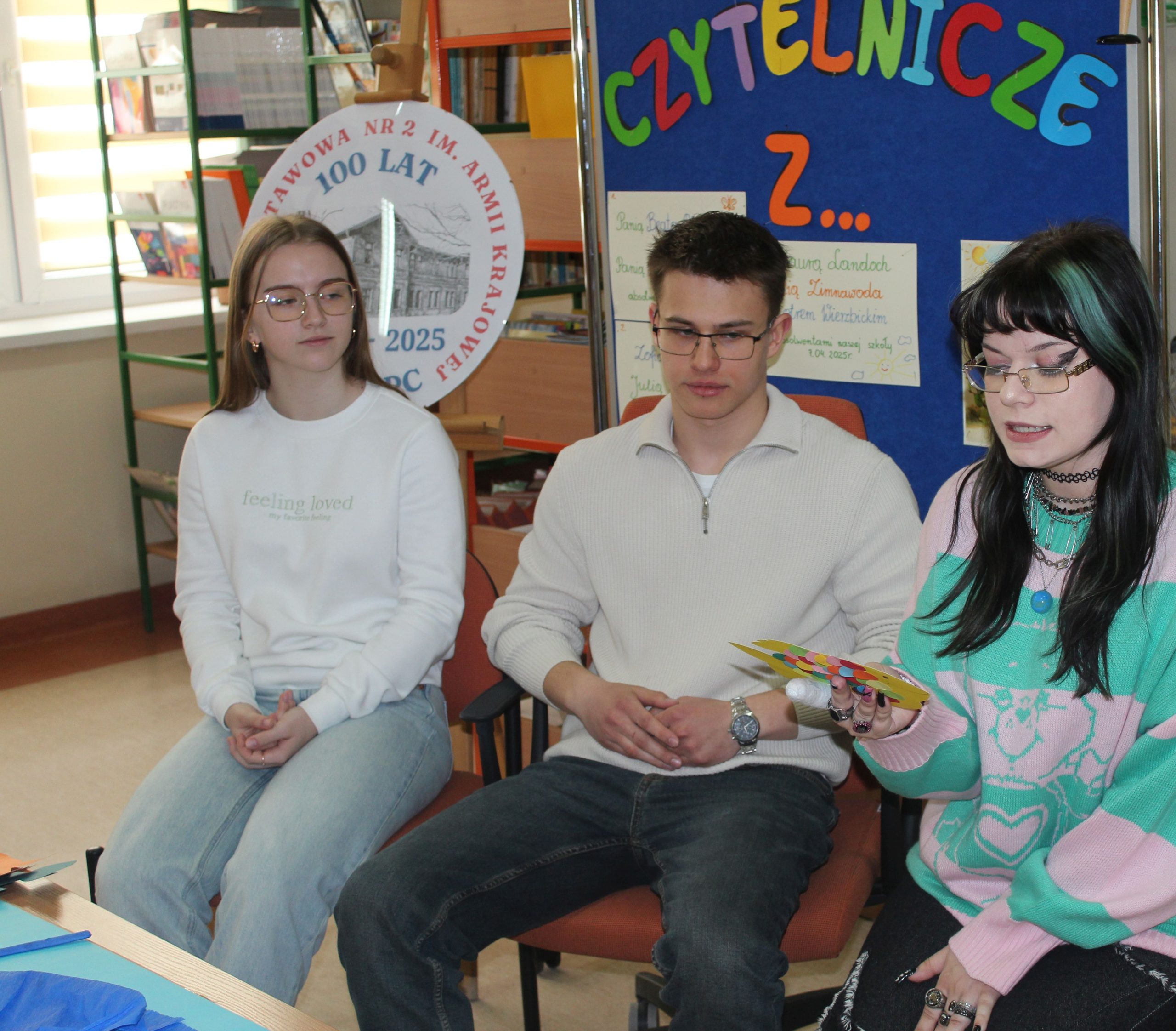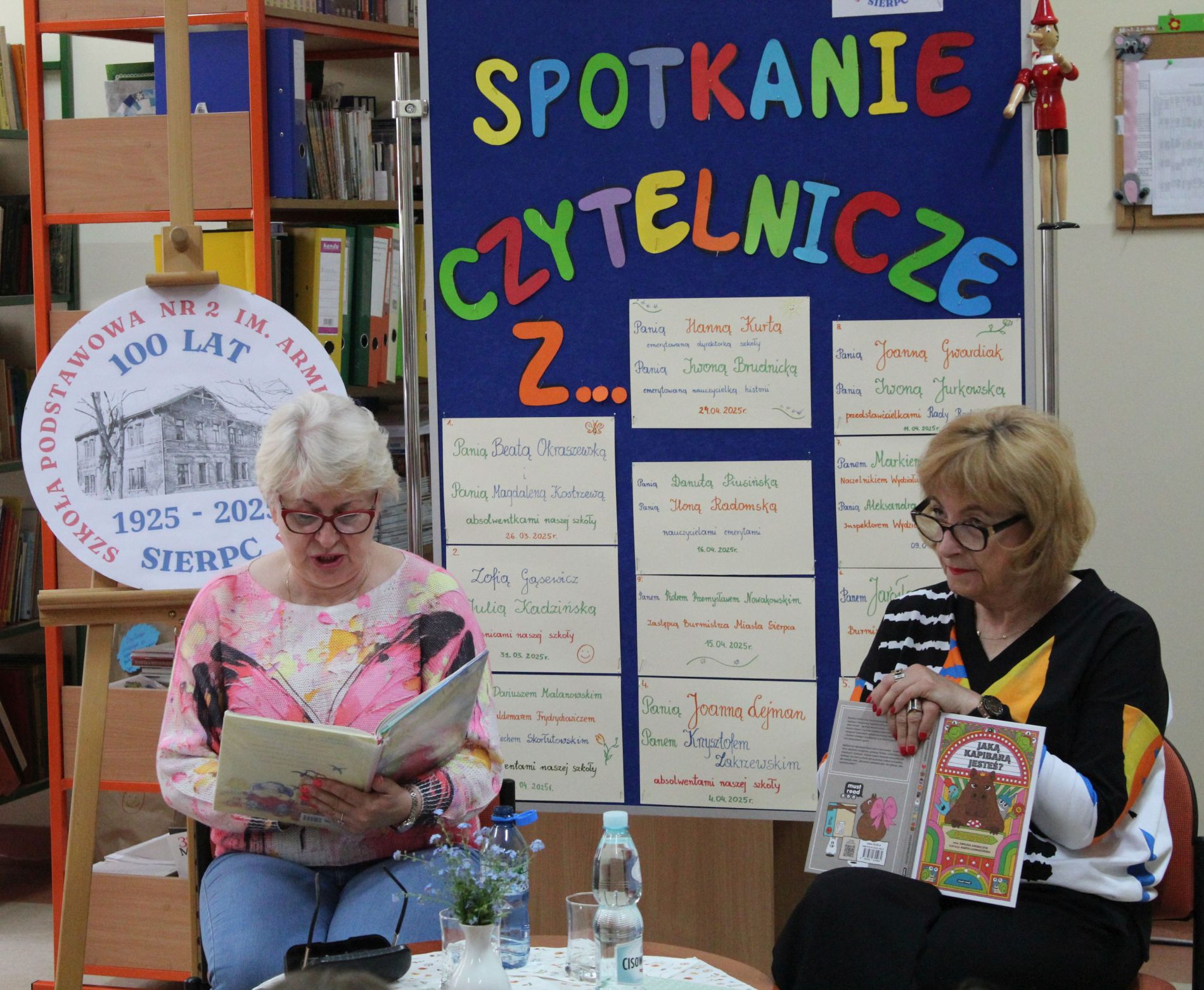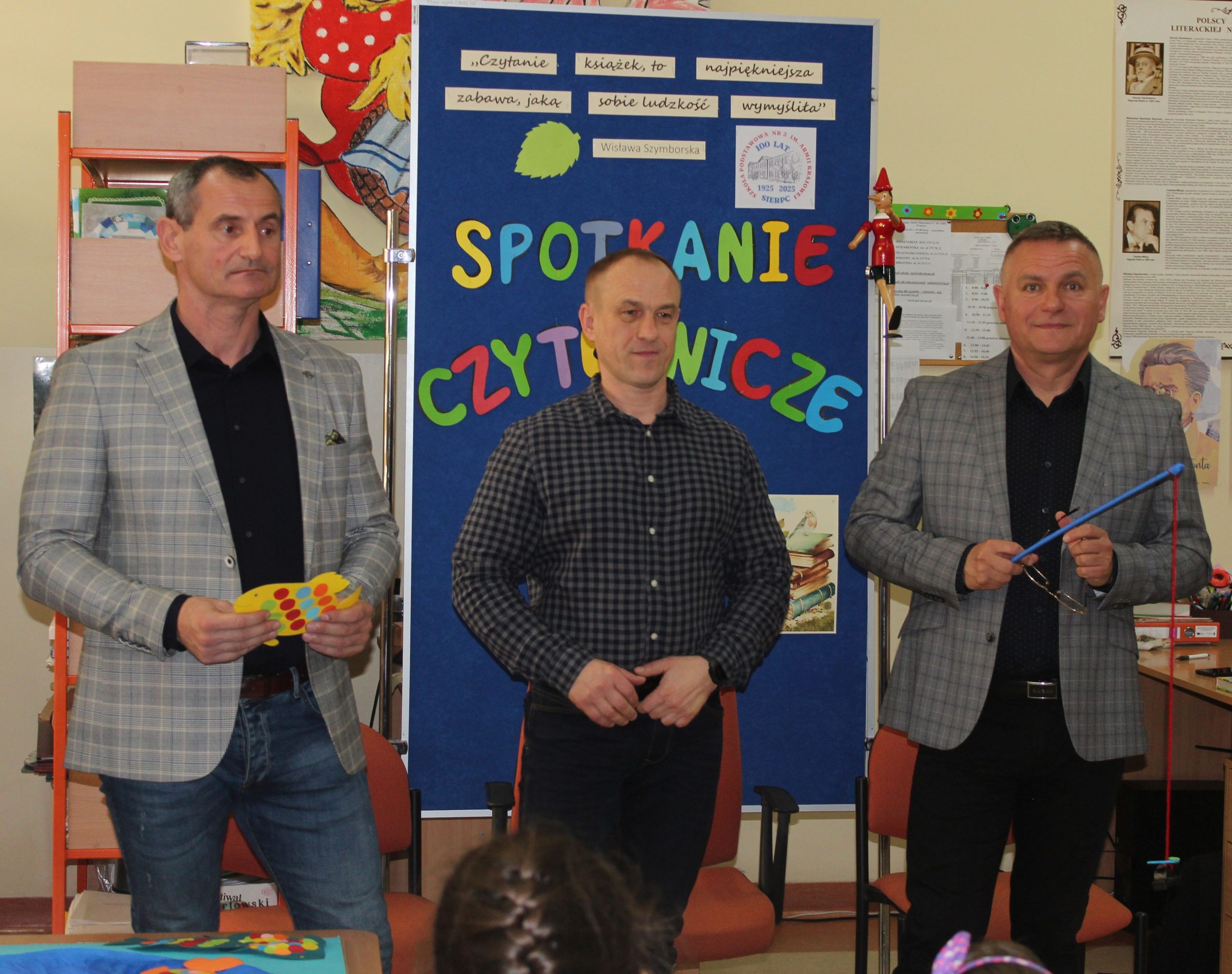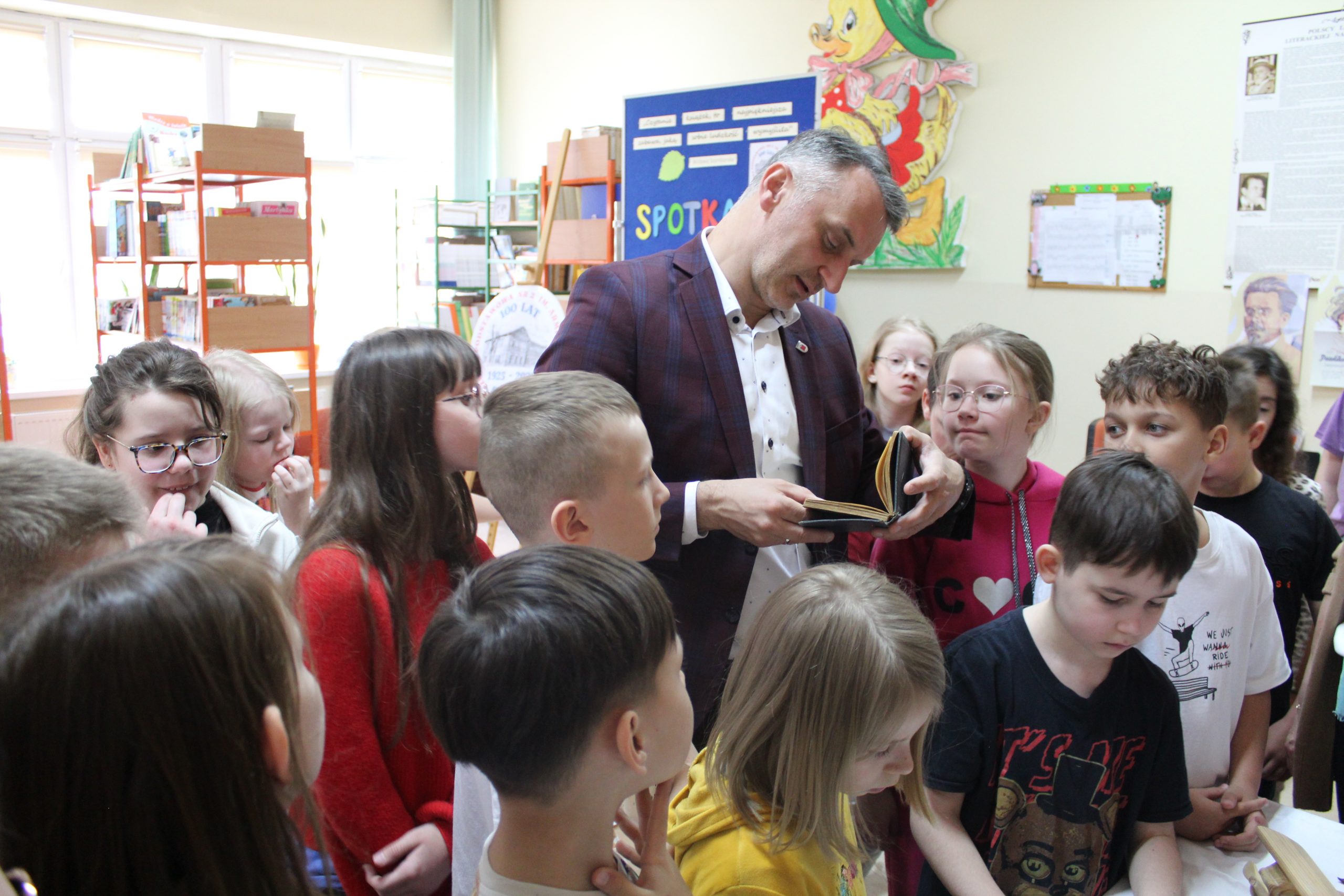 Z okazji Jubileuszu 100- lecia naszej szkoły w bibliotece odbyły się wyjątkowe „Spotkania czytelnicze”, których motywem przewodnim były ulubione książki z dzieciństwa zaproszonych gości. Uczestnicy – wśród nich uczniowie, absolwenci naszej szkoły, przedstawiciele władz miasta, emerytowani nauczyciele, rodzice – czytali uczniom młodszych klas ulubione książki z lat szkolnych, dzielili się wspomnieniami oraz refleksjami związanymi z dawnymi przeżyciami gdy sami byli uczniami. Rozwiązywali wspólnie z dziećmi zagadki literackie. Spotkaniom towarzyszyła ekspozycja starych przedmiotów i fotografii, które przywołały atmosferę minionych lat i wzbudziły wiele emocji. Wydarzenie stworzyło niezwykłą przestrzeń do międzypokoleniowego dialogu i integracji wokół literatury oraz wspólnej historii szkoły.