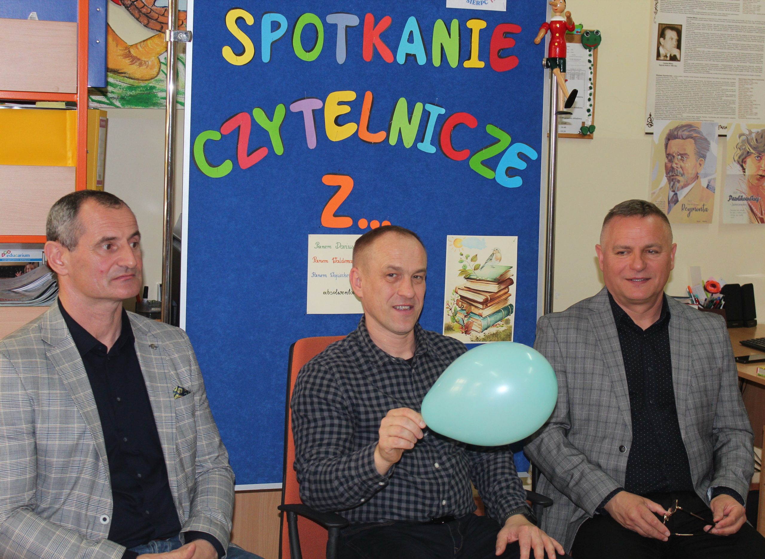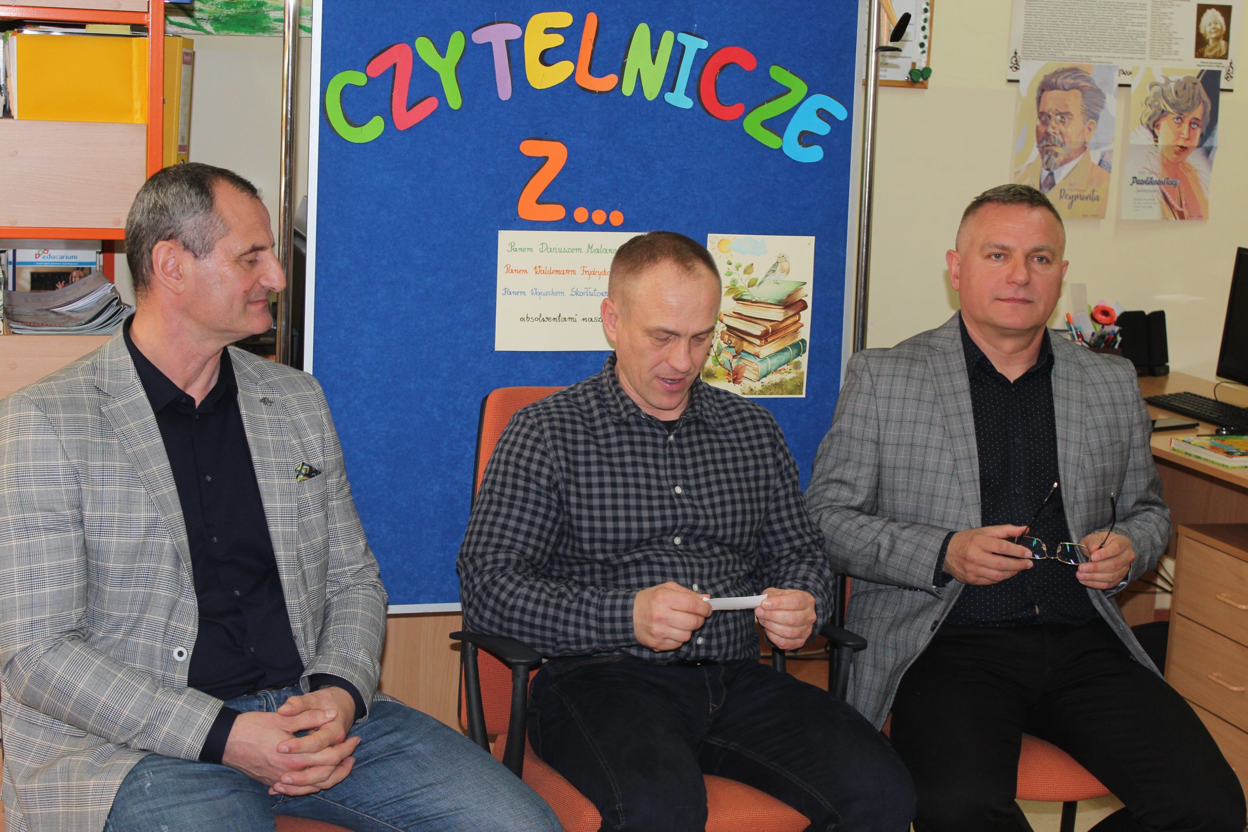 Spotkanie czytelnicze uczniów z 1d z Panami Dariuszem Malanowskim, Wojciechem Skorłutowskim i Waldemarem Frydrychowiczem – absolwentami naszej szkoły