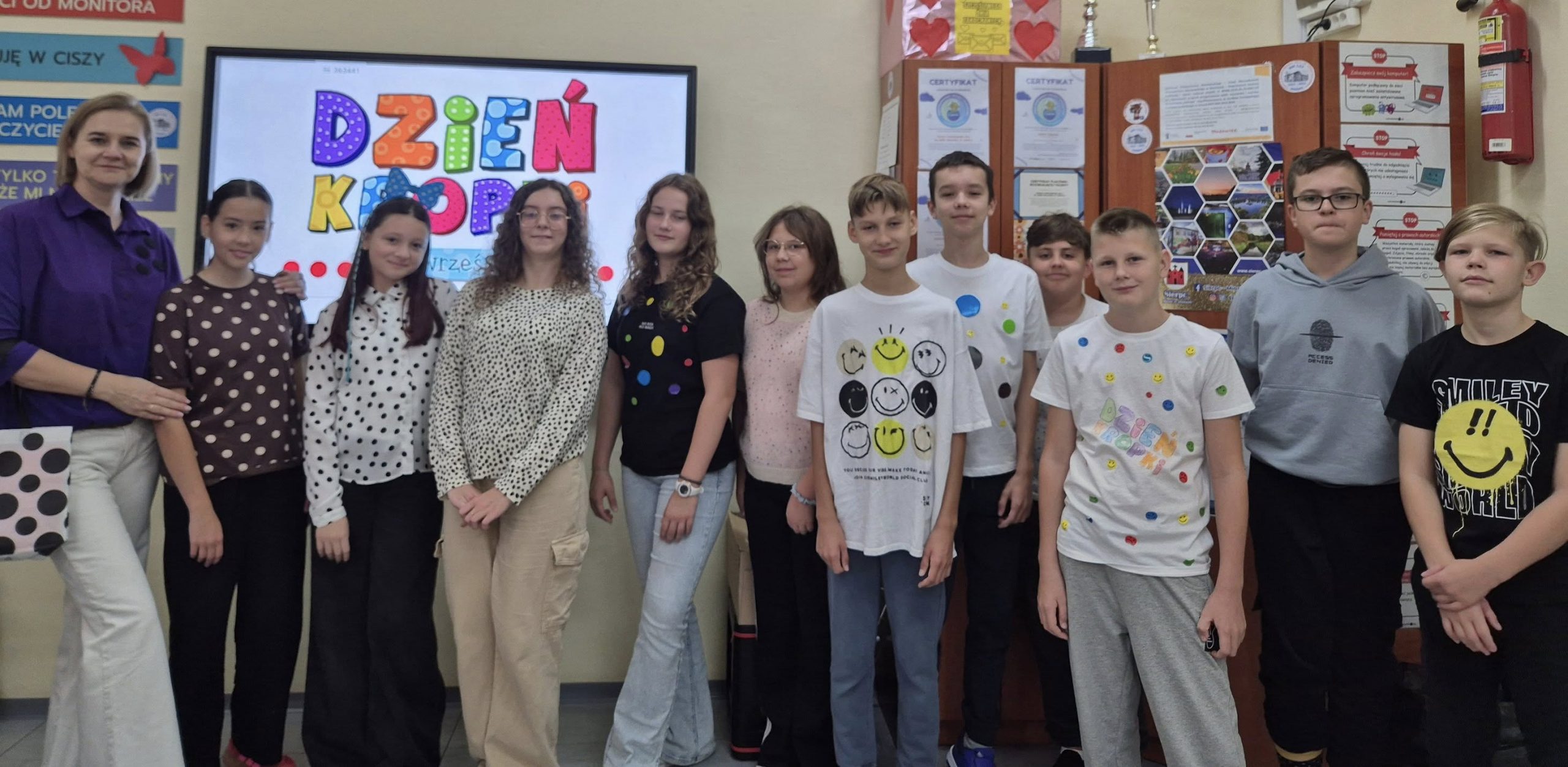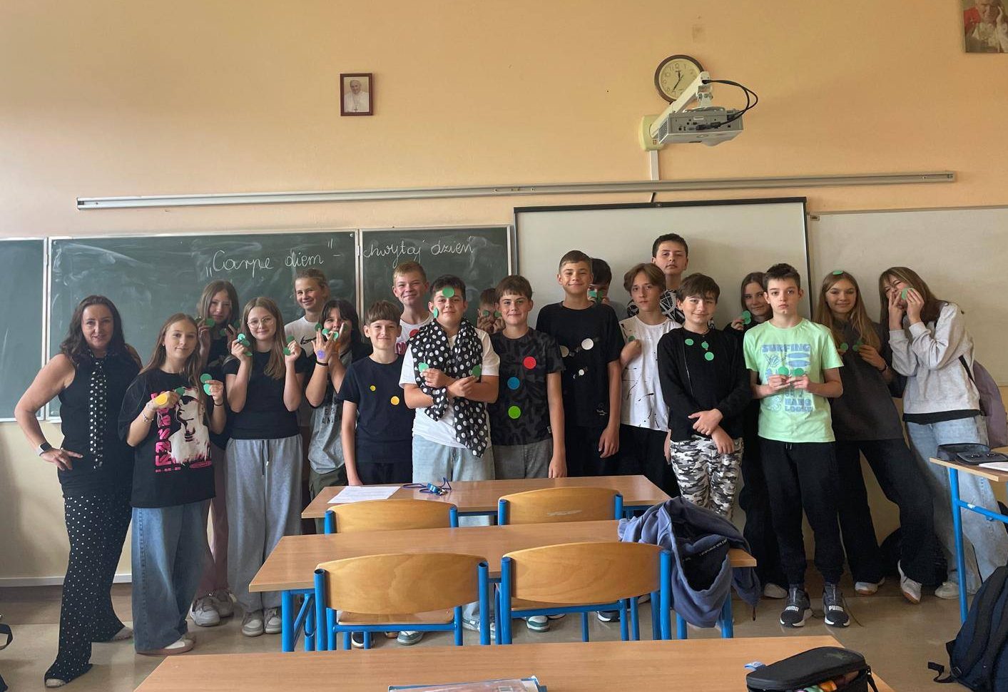 15 września nasza szkoła zamieniła się w kolorową, radosną przestrzeń pełną kropek. Samorząd Uczniowski zorganizował pierwszą w tym roku akcję – Dzień Kropki. Uczniowie i nauczyciele przyszli ubrani w stroje ozdobione kropkami, a całość uzupełniły konkursy, gazetka tematyczna oraz kącik fotograficzny. Wszyscy świetnie się bawili, a przy okazji przypomnieli sobie, że każdy ma w sobie coś wyjątkowego i niepowtarzalnego. To był dzień pełen uśmiechu i kreatywności, a Samorząd Uczniowski udowodnił, że potrafi działać z pomysłem.