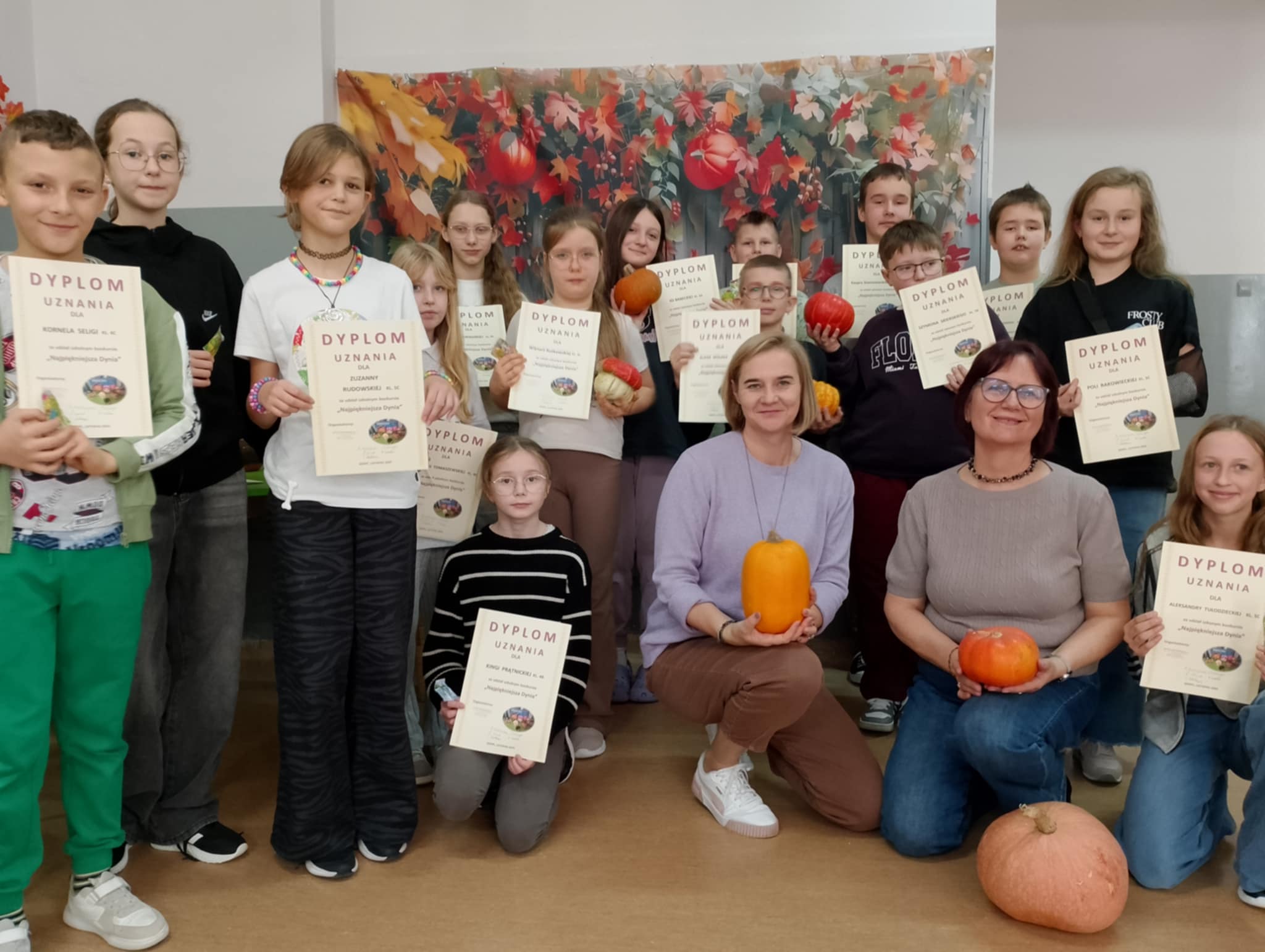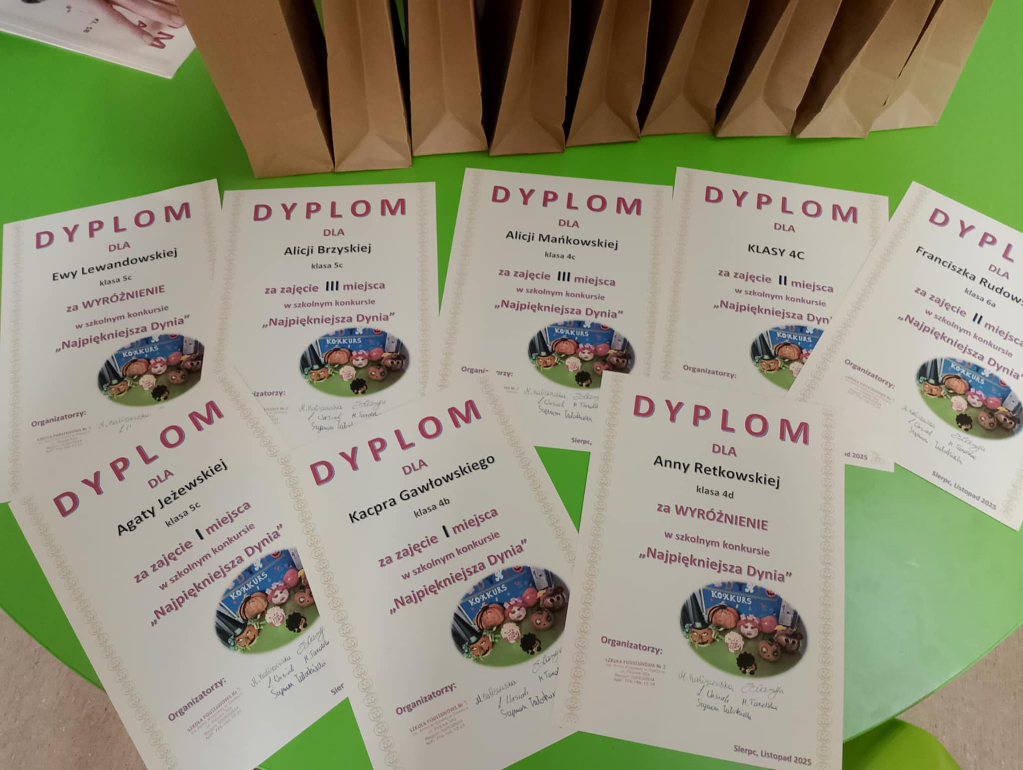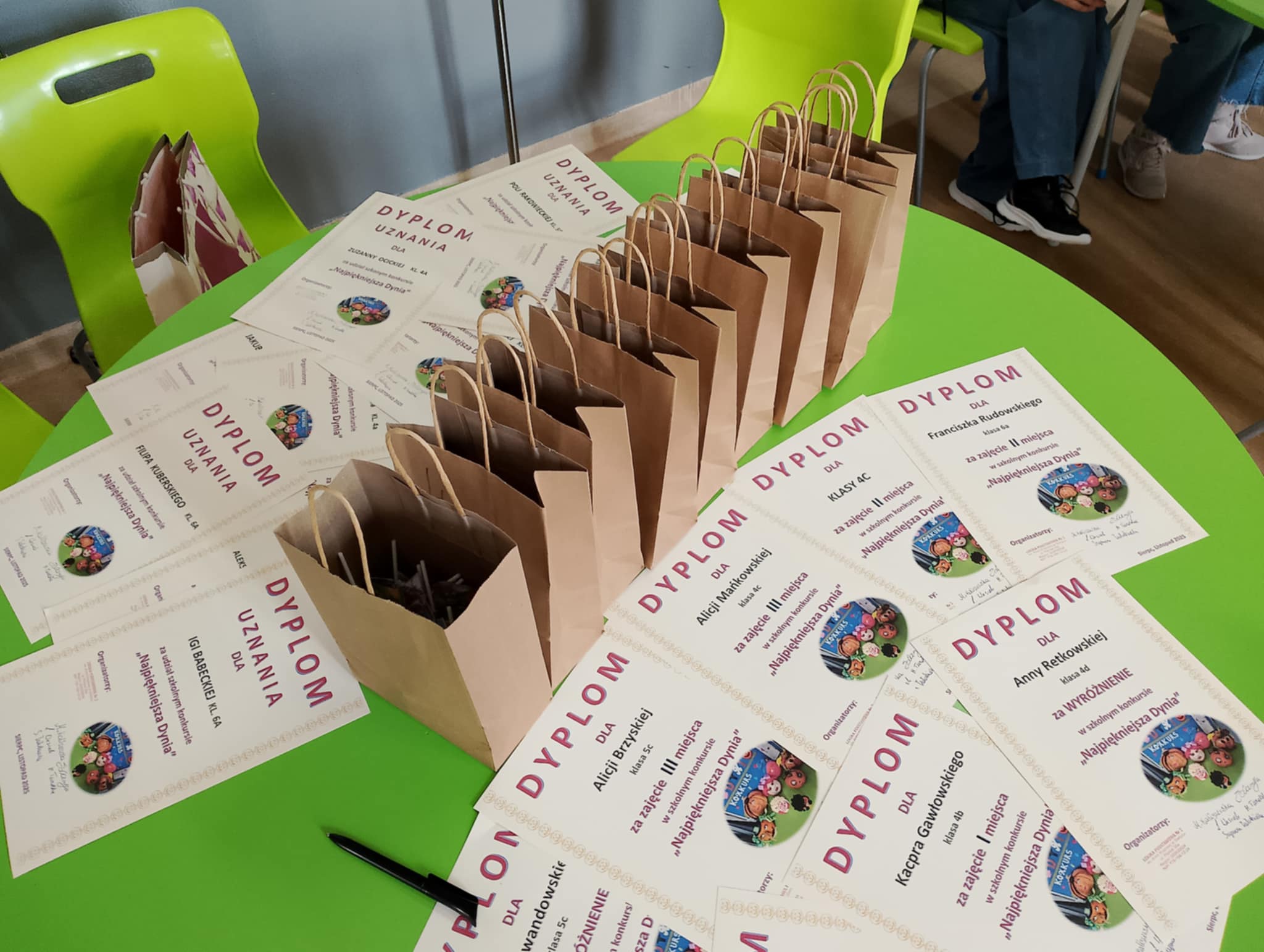 Na konkurs wpłynęło aż 30 niezwykłych dyń, udekorowanych w najróżniejszych stylach – od klasycznych jesiennych kompozycji, przez dyniowe postacie, aż po prawdziwe dzieła sztuki wykonane z ogromną starannością i wyobraźnią. Po długich naradach komisja konkursowa wyłoniła zwycięzców: