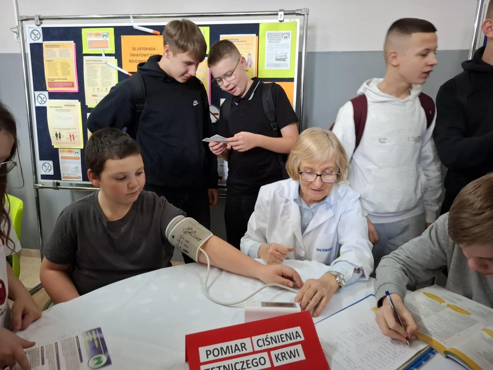 Pielęgniarka szkolna umożliwiła chętnym pomiar ciśnienia tętniczego, z którego skorzystali zarówno uczniowie, jak i pracownicy szkoły.