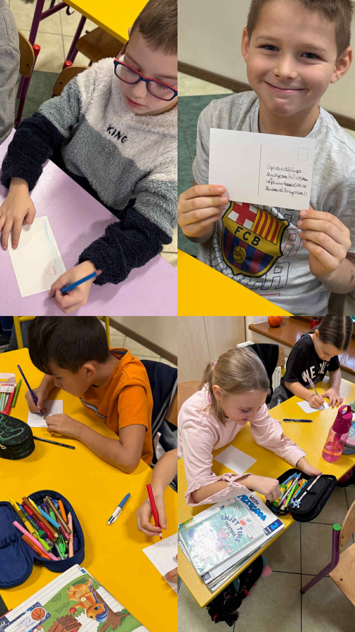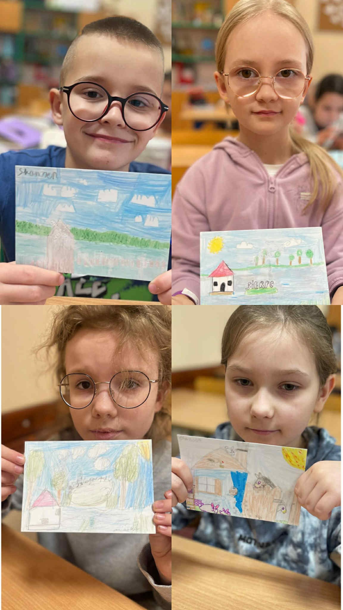 Uczniowie naszej szkoły z klasy 2b i 3a przygotowali własnoręcznie wykonane kartki, na których przedstawili najpiękniejsze miejsca naszego malowniczego miasta. Na ilustracjach znalazły się m.in. Skansen, Jeziórka, Ratusz, a także… ser królewski