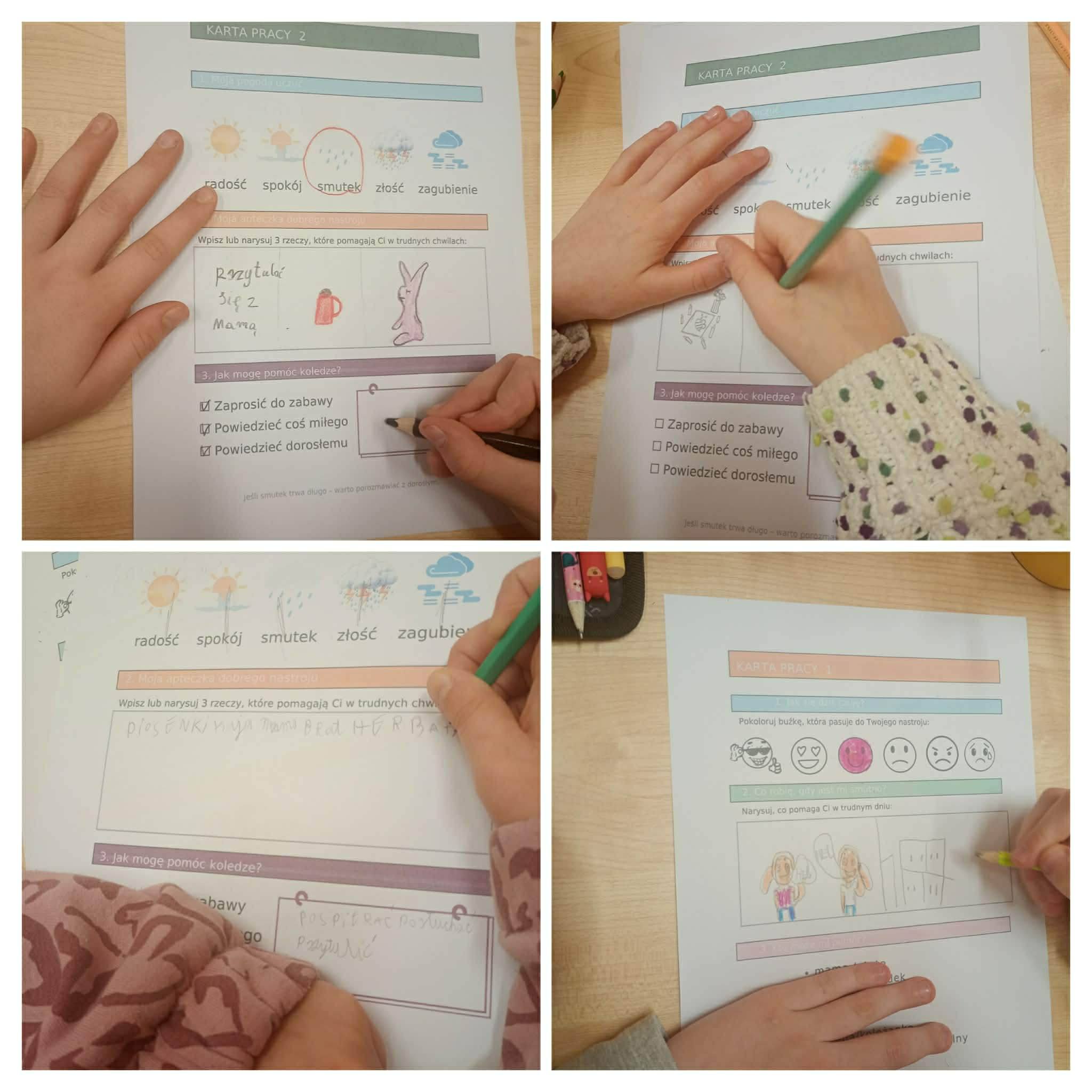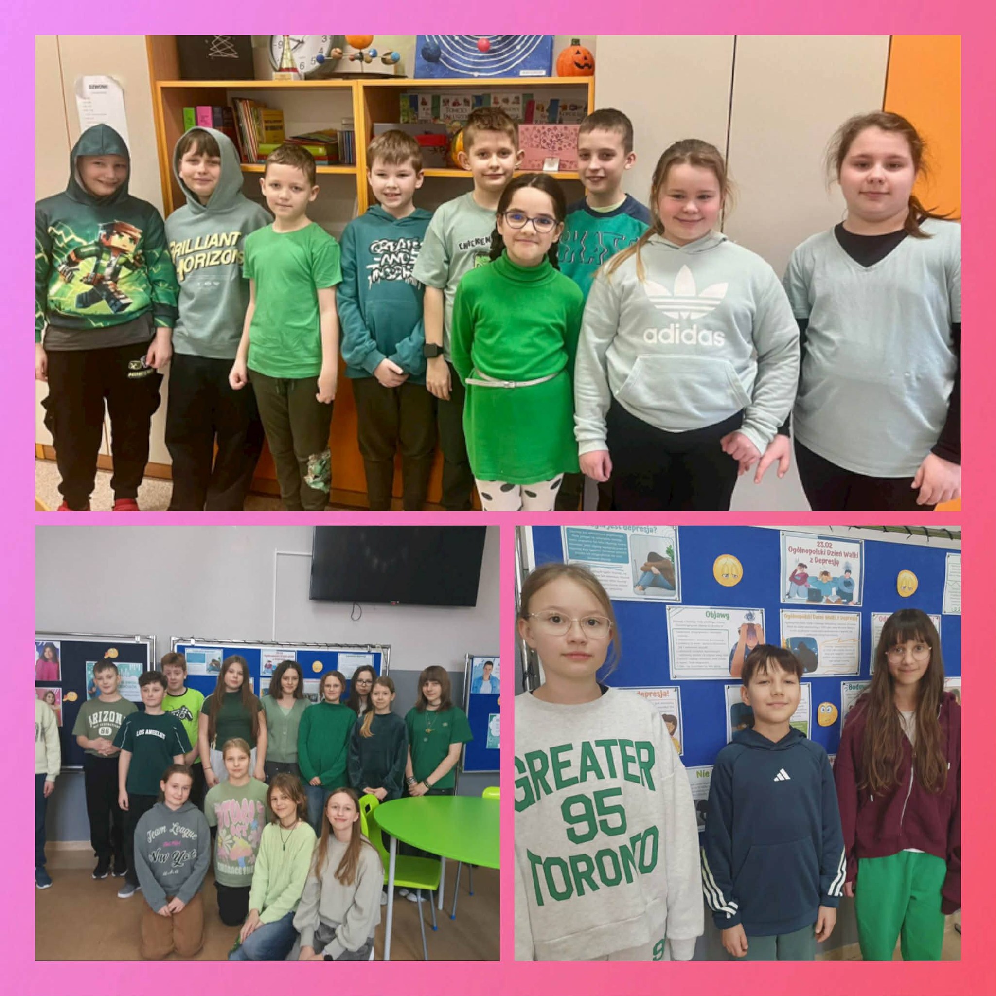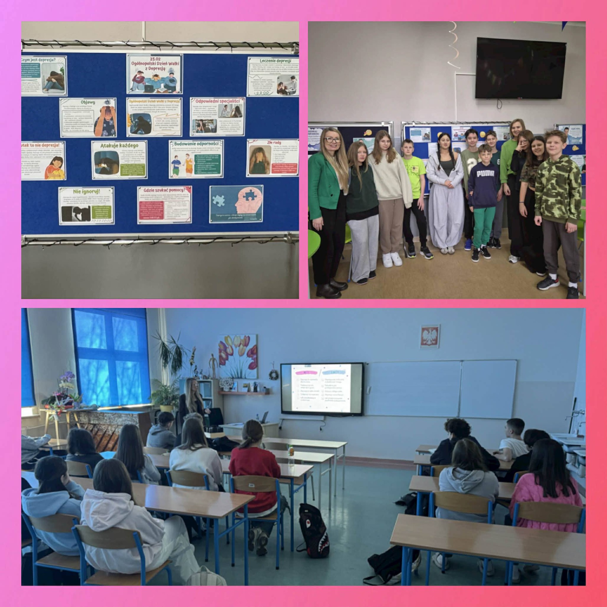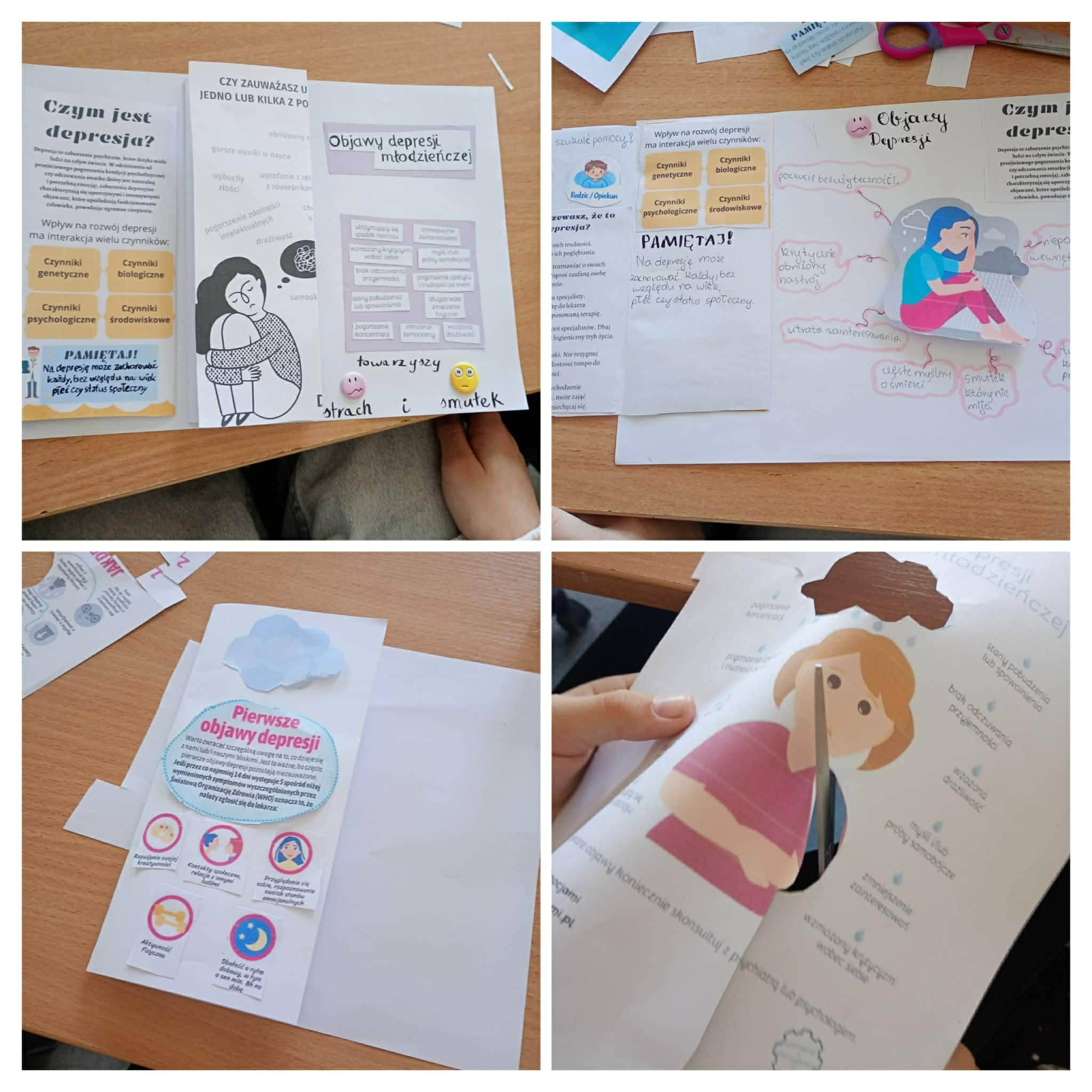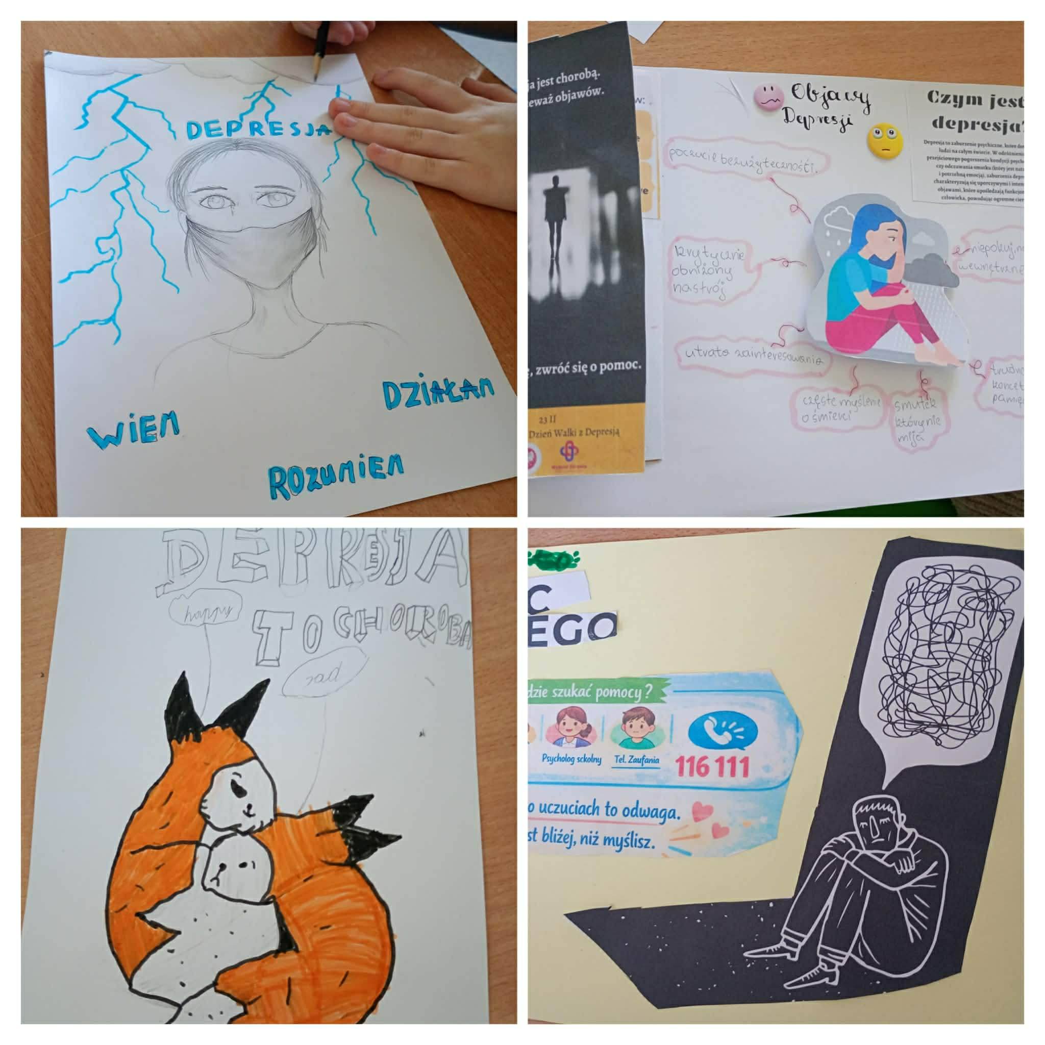 Uczniowie klas młodszych rozmawiali o emocjach, uczyli się je rozpoznawać oraz poznawali sposoby radzenia sobie z nimi. Korzystali również z dostępnych w szkole miejsc wyciszenia, które pomagają się uspokoić i zebrać myśli. Podczas zajęć z pedagogiem przygotowali także „Słoik dobrych myśli” – miejsce, do którego każdy będzie mógł sięgnąć w chwilach gorszego samopoczucia, by przeczytać wspierające i życzliwe słowa. Uczniowie klasy czwartej przygotowali natomiast ulotkę informacyjną na temat depresji. Zawarte w niej informacje pomagają lepiej zrozumieć, czym jest depresja, jakie są jej objawy oraz gdzie można szukać pomocy.