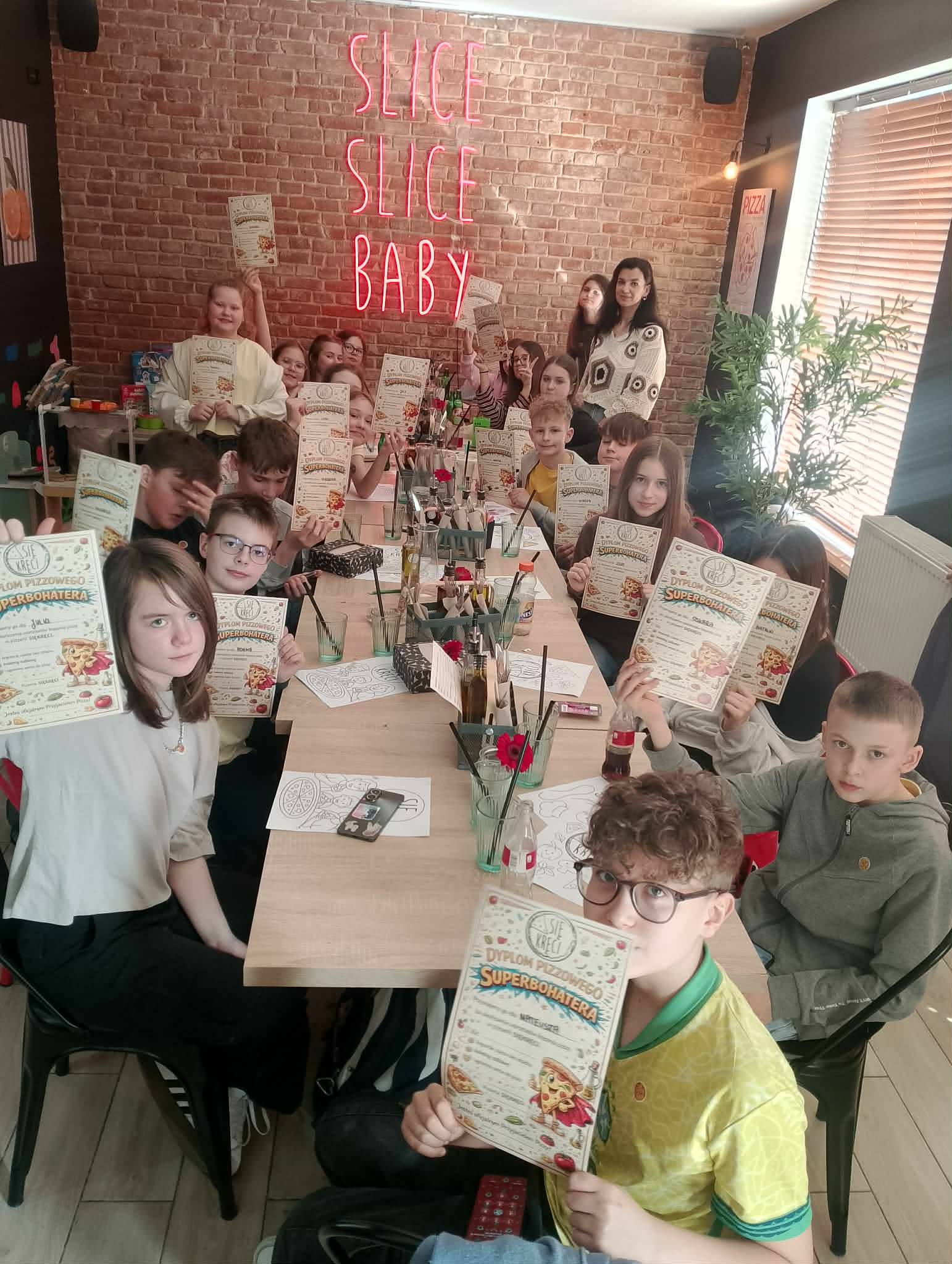 Z okazji Dnia Kobiet klasa 5d wybrała się do pizzerii „Się kręci” w Sierpcu, żeby wspólnie świętować. 👩👧👩👧 Uczniowie mogli nie tylko spróbować pysznej pizzy, ale przede wszystkim uczestniczyć w warsztatach kulinarnych, na których sami przygotowywali potrawę kuchni włoskiej. 🍕Każdy wybierał ulubione dodatki, a radość z tworzenia i pieczenia była ogromna. 🧅🧀🍕 Na zakończenie każdy uczestnik otrzymał dyplom, który potwierdzał jego udział w warsztatach. To dodatkowo ucieszyło uczniów i było miłym podsumowaniem wspólnie spędzonego czasu. 🎓🍕 Wyjście obfitowało w śmiech, rozmowy i dobrą zabawę oraz sprzyjało integracji klasy. ❤️👧❤️👦