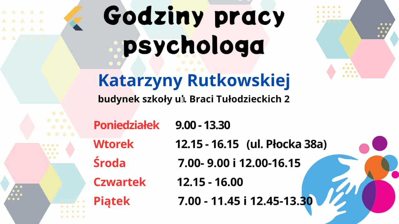 Psycholog szkolny w okresie nauczania zdalnego urzęduje w budynku przy ul. Płockiej 38a, w razie potrzeby przyjmuje w szkole w podanych poniżej godzinach. Istnieje również możliwość kontaktu oraz uzyskania pomocy psychologicznej w formie zdalnej, w następujące sposoby: Librus, telefon (24 275 22 53), maile: psycholog szkolny: a.j.psychologszkolny@onet.pl