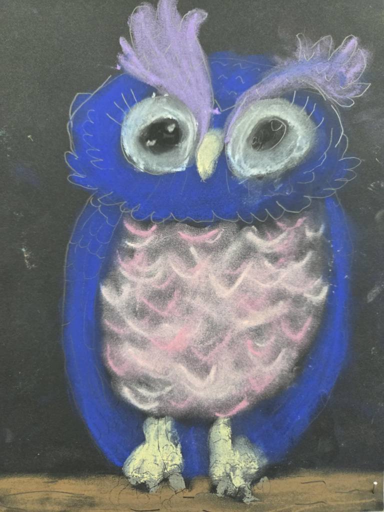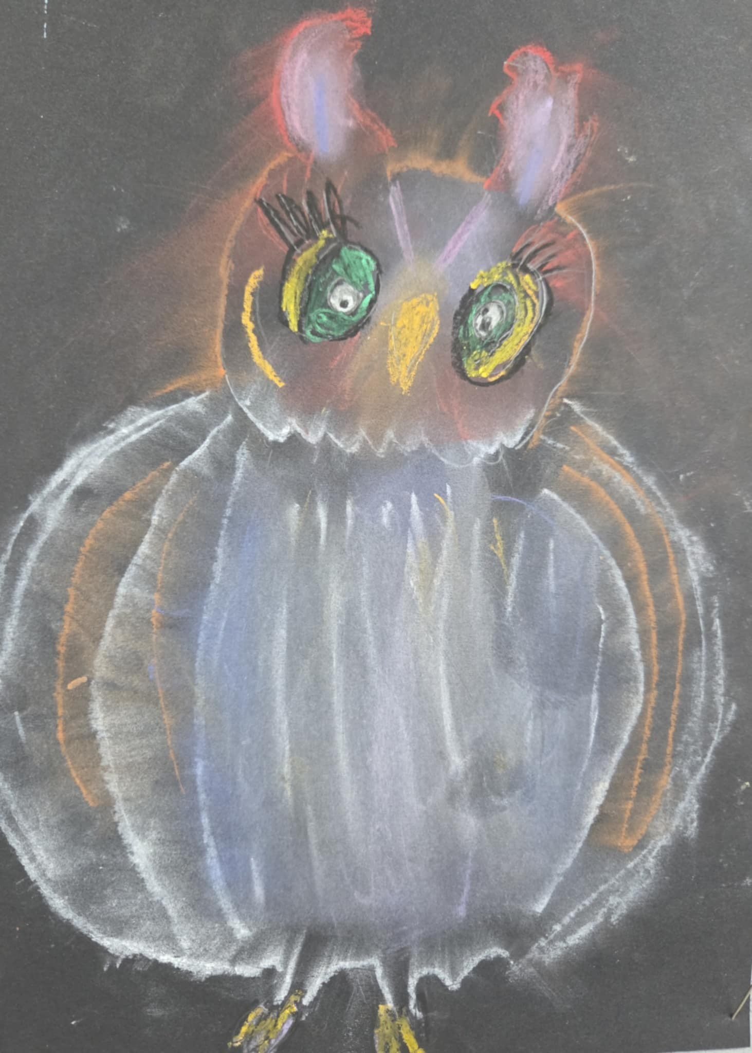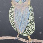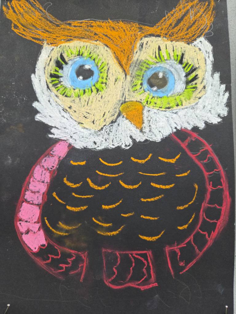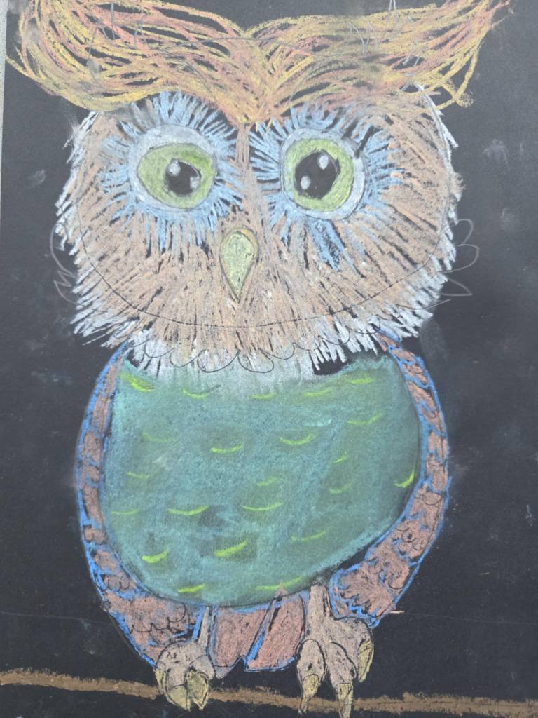 Sowy lubiące ciemność nocy, stały się inspiracją dla uczniów klas czwartych na zajęciach plastyki. Piękne, kolorowe, tajemnicze ptaki.