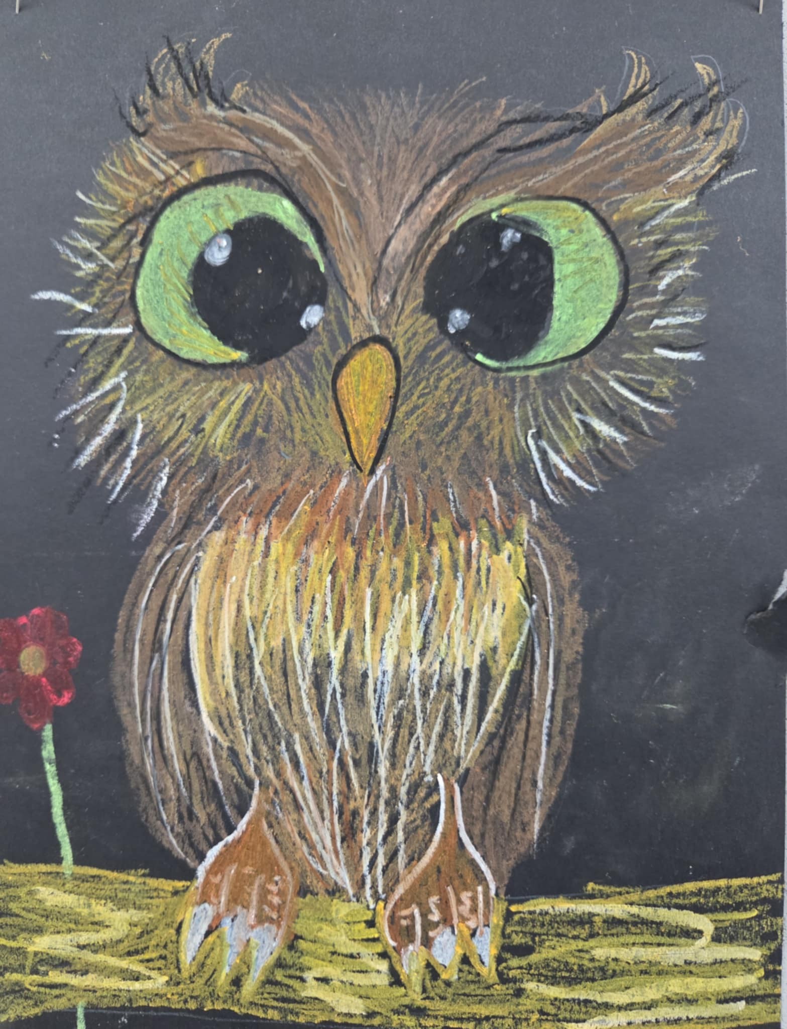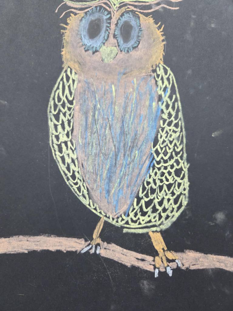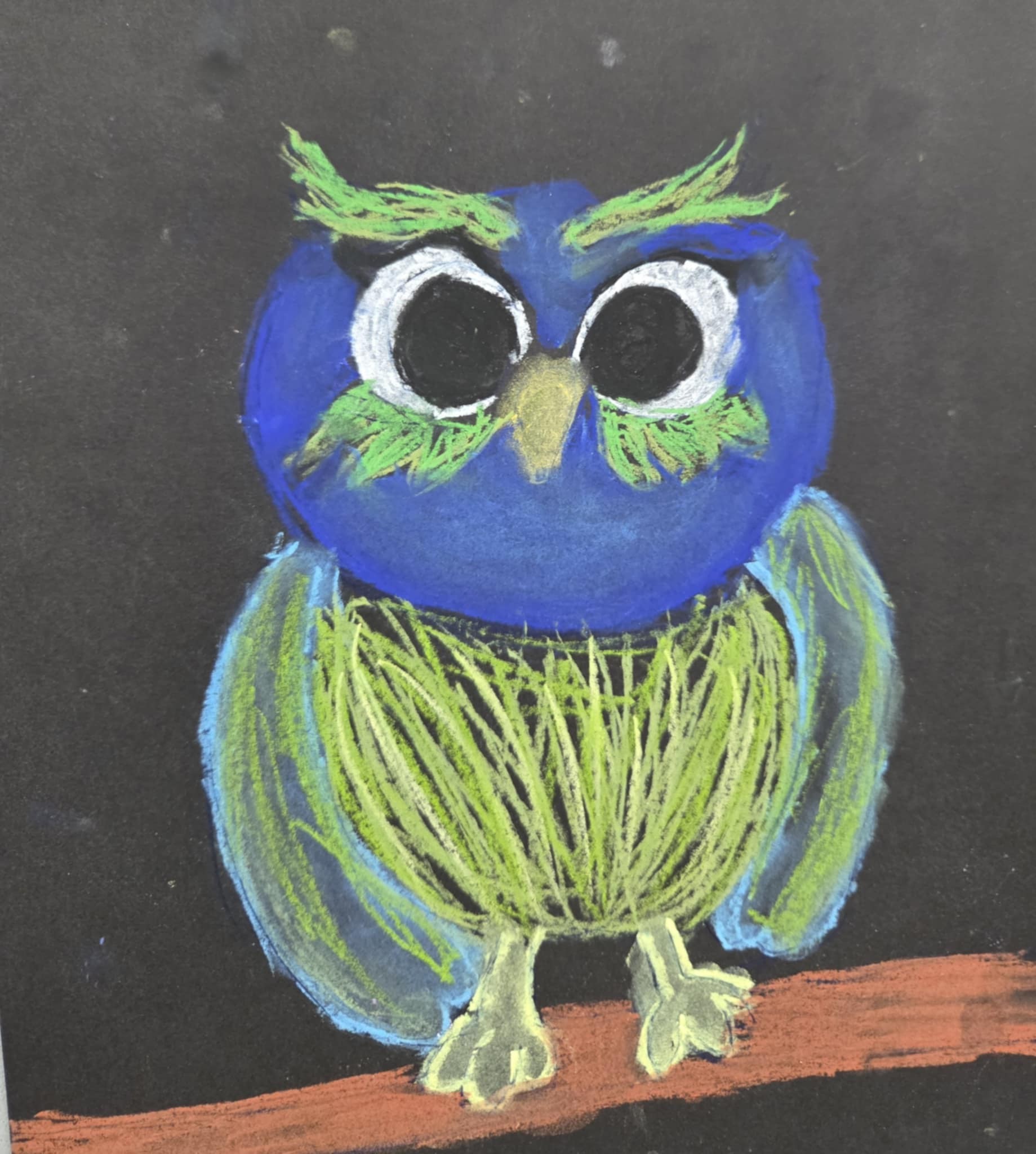 Sowy lubiące ciemność nocy, stały się inspiracją dla uczniów klas czwartych na zajęciach plastyki. Piękne, kolorowe, tajemnicze ptaki.