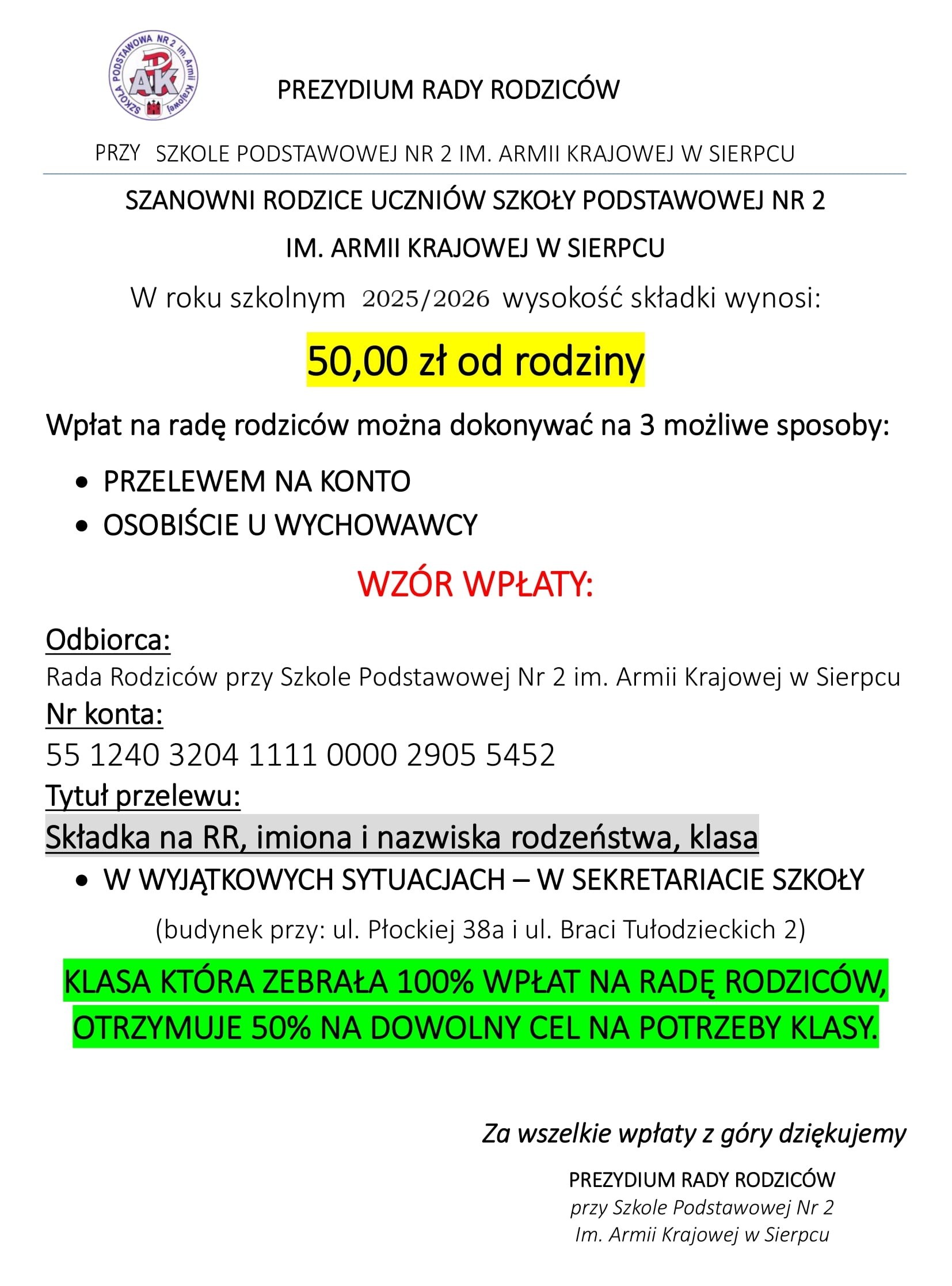 Numer konta Rady Rodziców